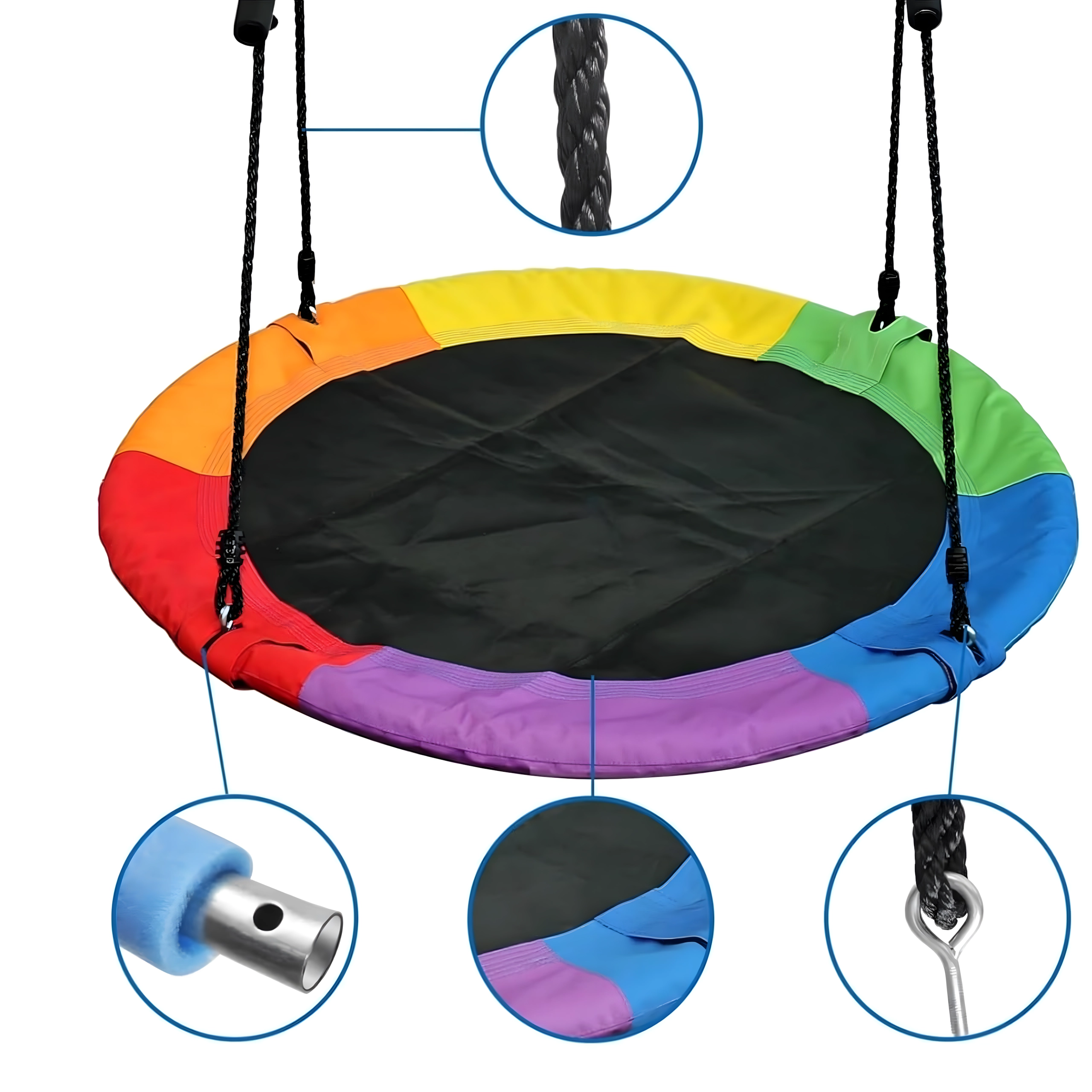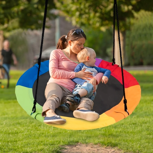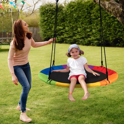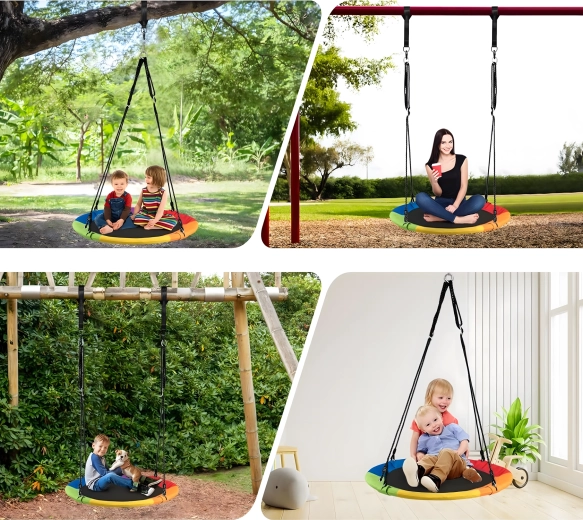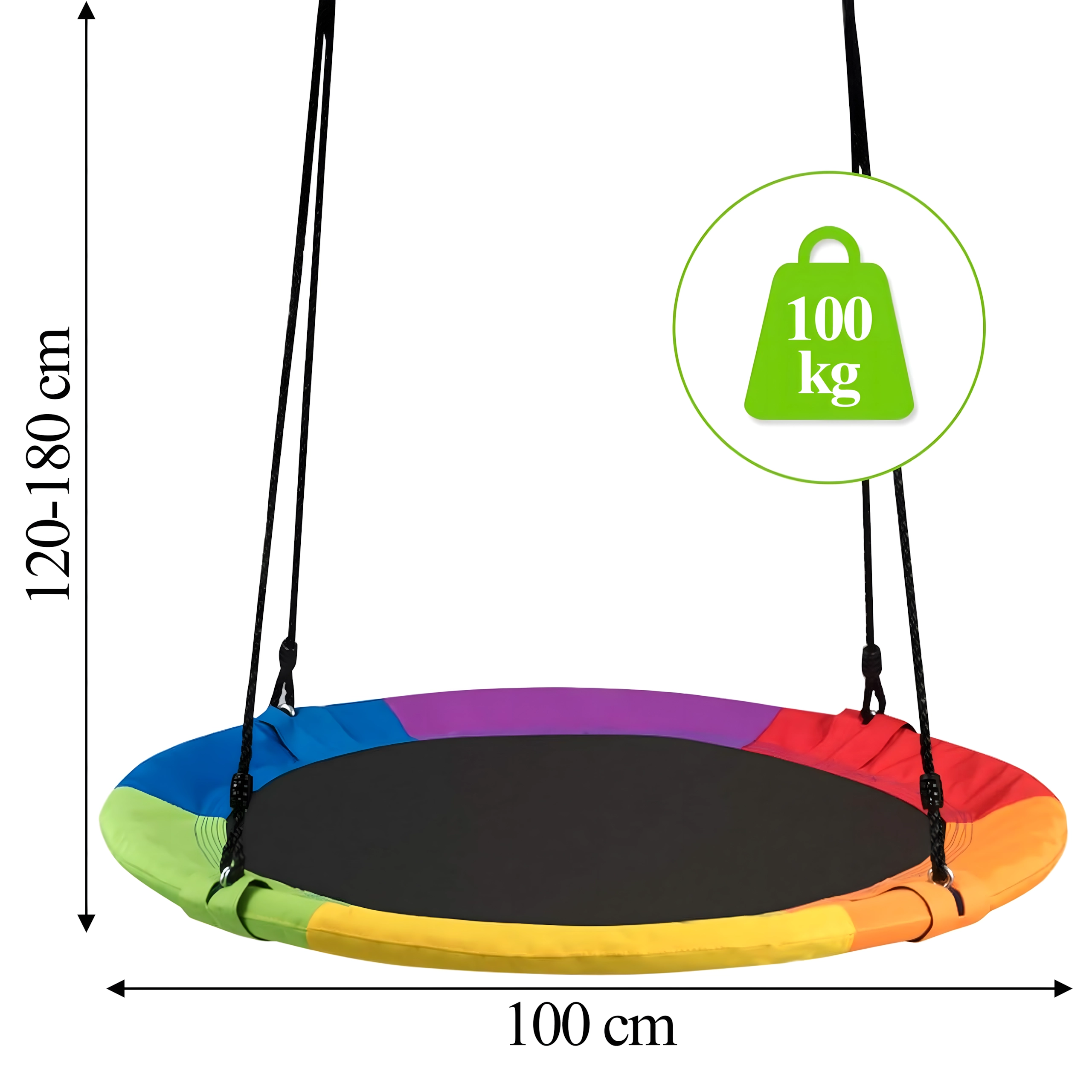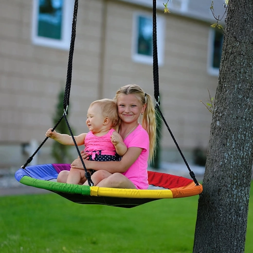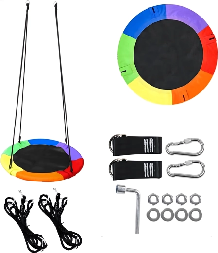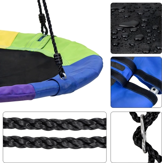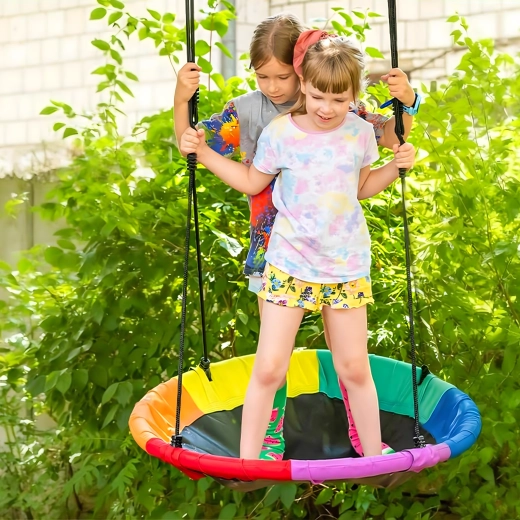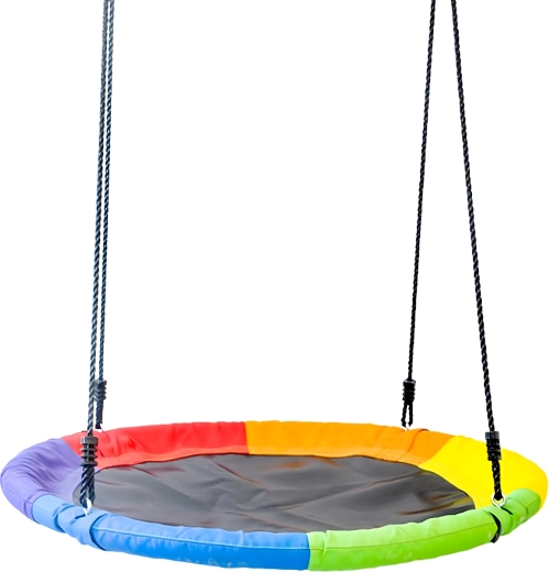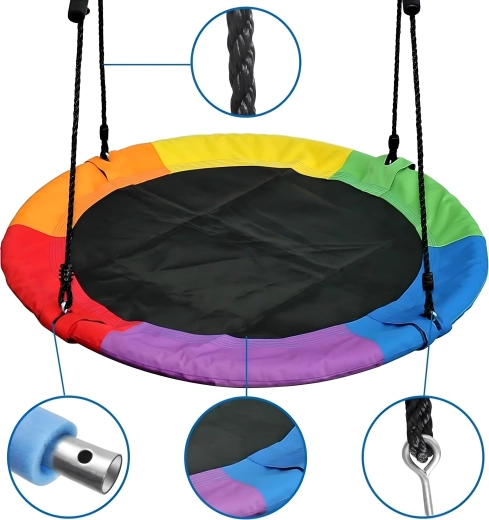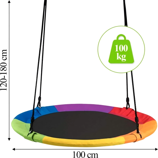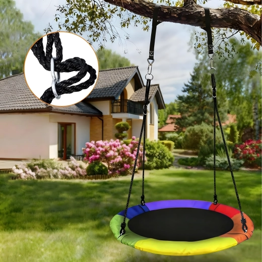Leagăn circular mare tip cuib de barză, cu diametrul de 100 cm, oferă copiilor ore întregi de distracție și relaxare în aer liber. Datorită șezutului larg, este ideal pentru stat jos sau întins, poate susține mai mulți copii simultan și are frânghii împletite rezistente, material durabil și carabiniere metalice pentru o agățare sigură. Pachetul include chingi pentru prindere de copac și toate accesoriile necesare.
