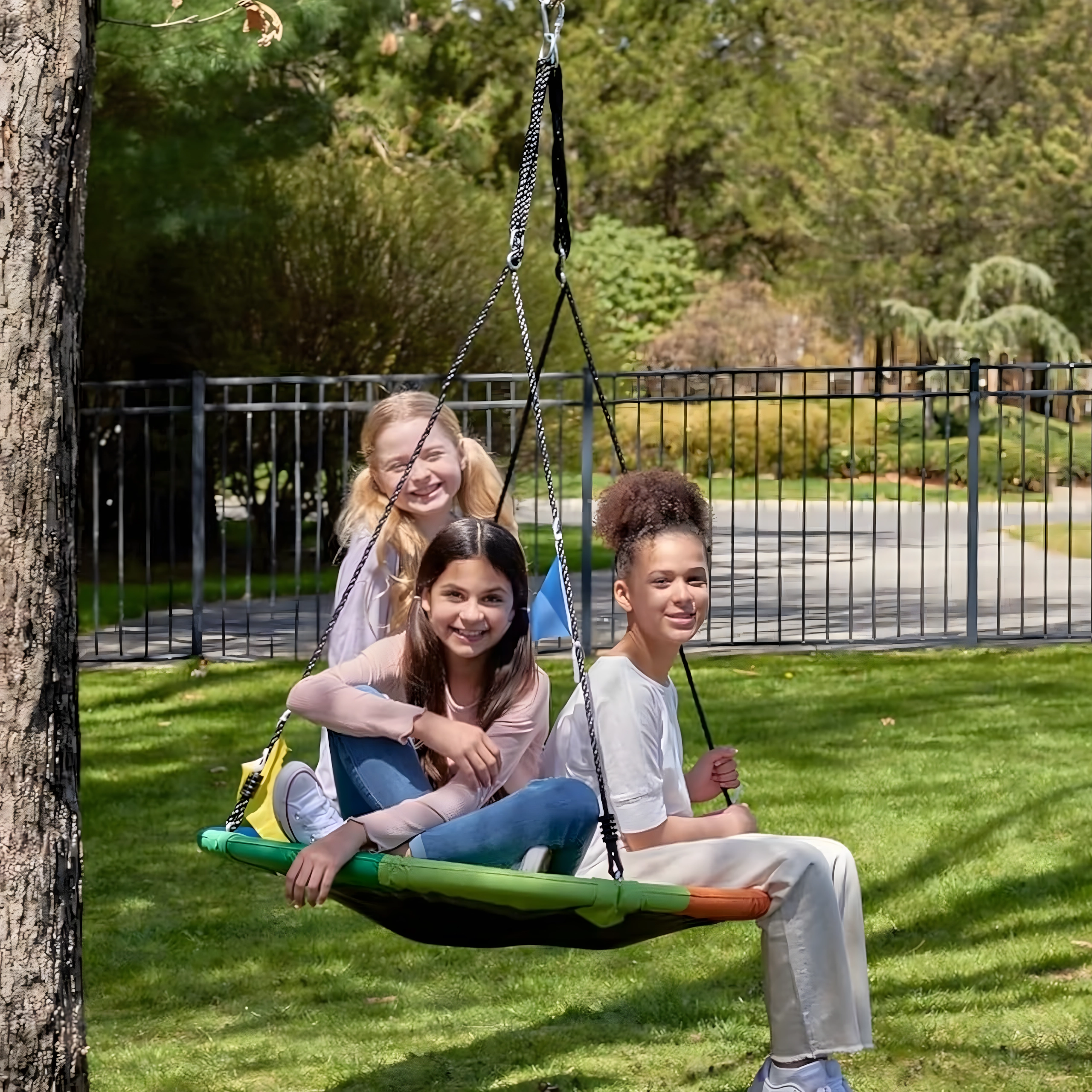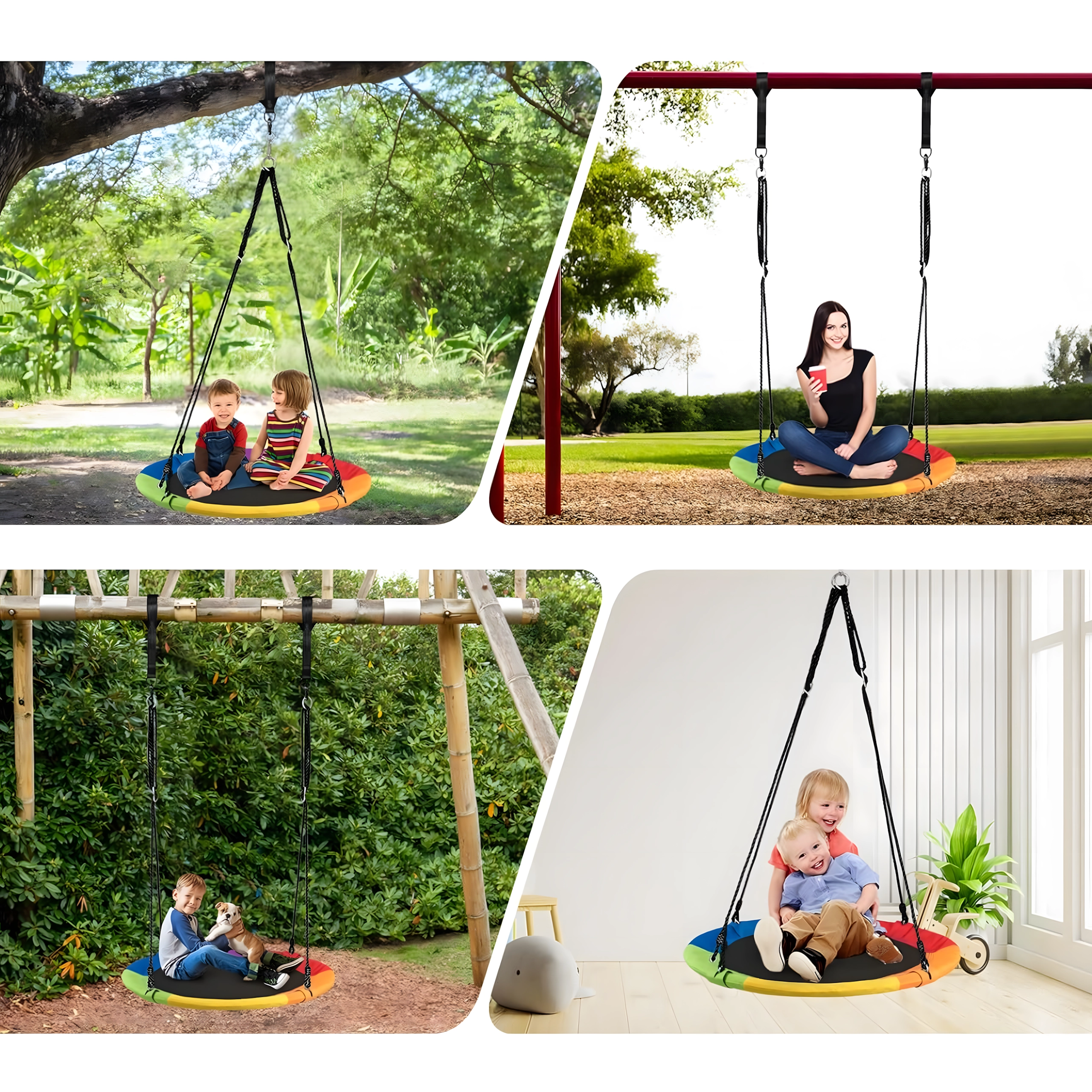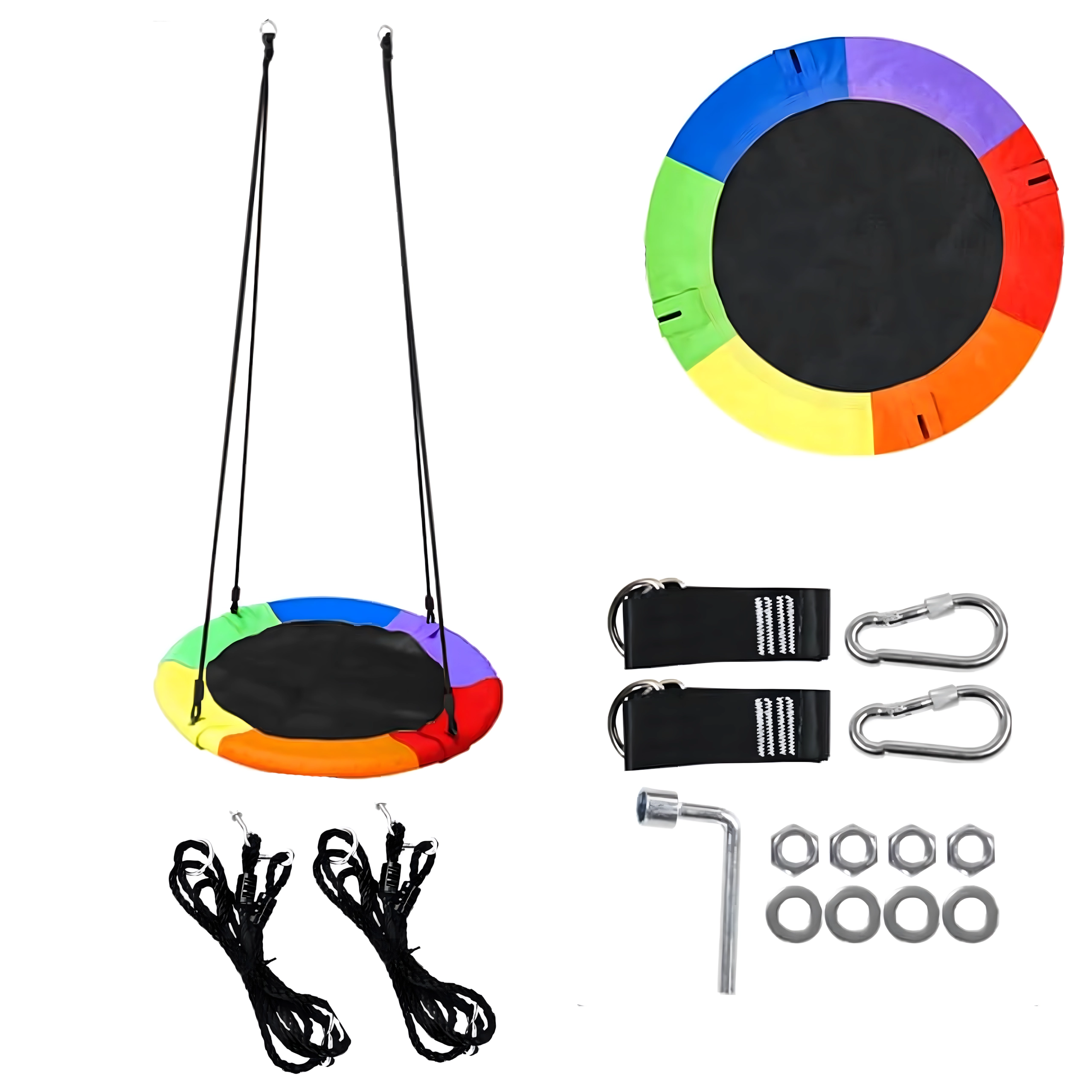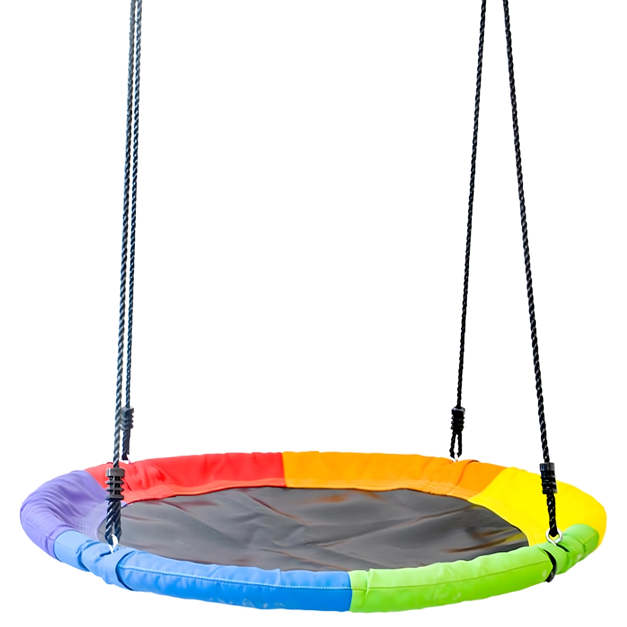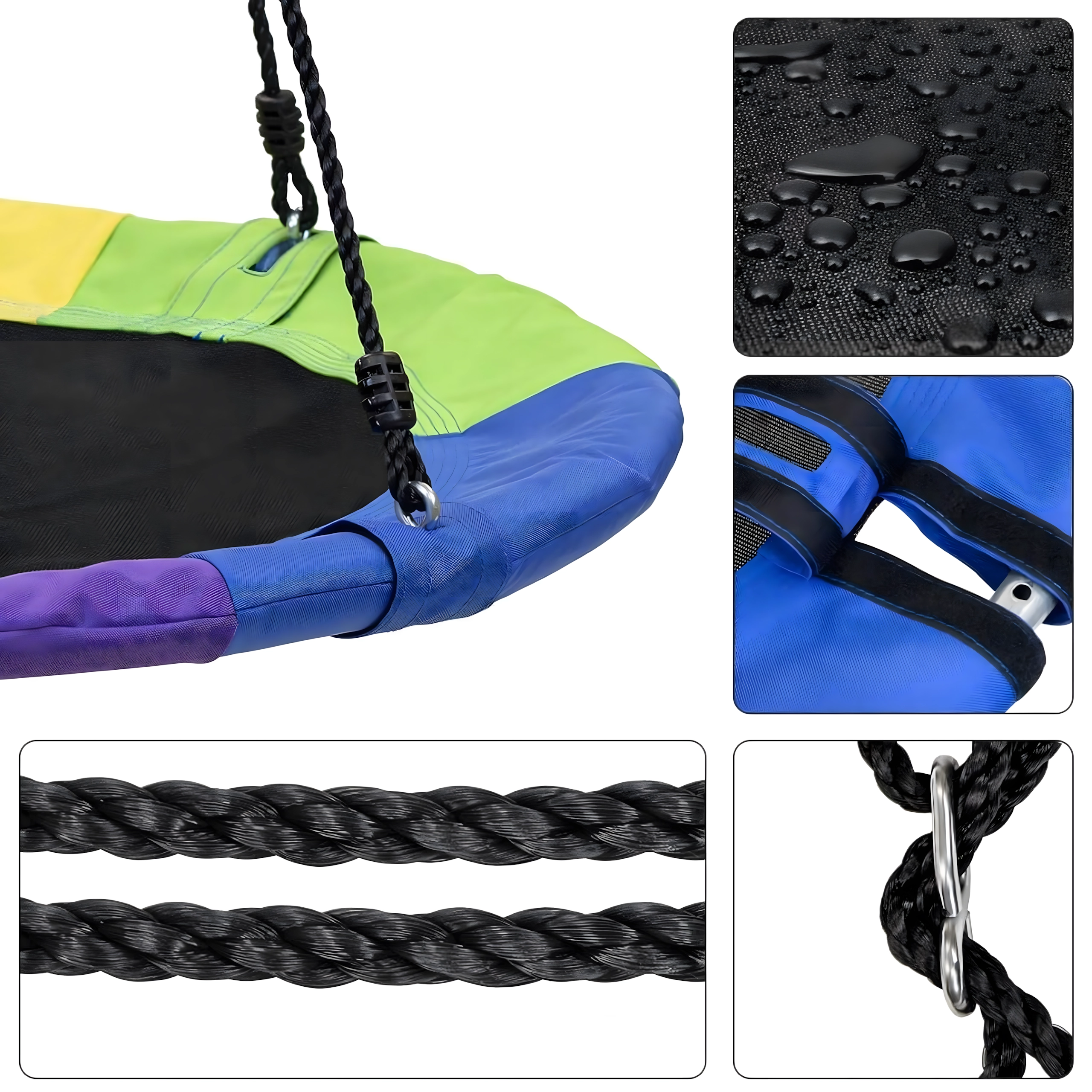Leagăn circular mare tip cuib de barză, cu diametrul de 100 cm, oferă copiilor ore întregi de distracție și relaxare în aer liber. Datorită șezutului larg, este ideal pentru stat jos sau întins, poate susține mai mulți copii simultan și are frânghii împletite rezistente, material durabil și carabiniere metalice pentru o agățare sigură. Pachetul include chingi pentru prindere de copac și toate accesoriile necesare.