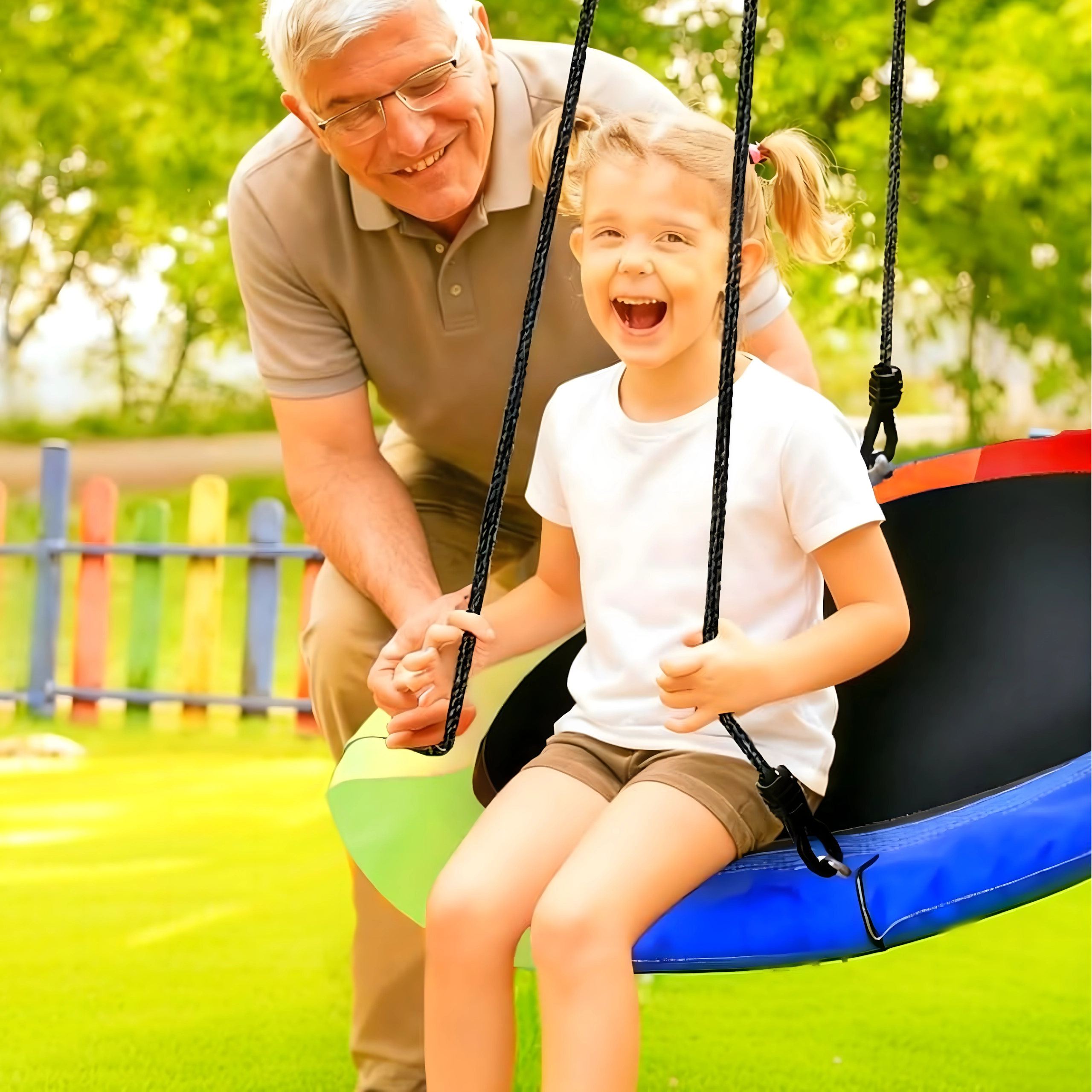Descoperiți cuibul de barză stabil și confortabil, cu diametrul de 100 cm, care va transforma grădina într-un loc de joacă preferat. Marginea moale căptușită, suprafața de șezut rezistentă și sistemul de agățare în patru puncte asigură confort și siguranță. Leagănul este potrivit pentru utilizare în exterior și interior, se instalează ușor și arată excelent datorită marginii colorate.