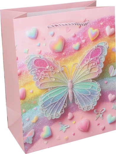 Datorită construcției din hârtie rezistentă, fundului întărit și mânerelelor răsucite din șnur, punga este confortabilă și fiabilă la transport. Accentele lucioase și sclipitoare de pe fluturi conferă cadoului un aspect deosebit, care îi va bucura atât pe micii sărbătoriți, cât și pe părinții lor.