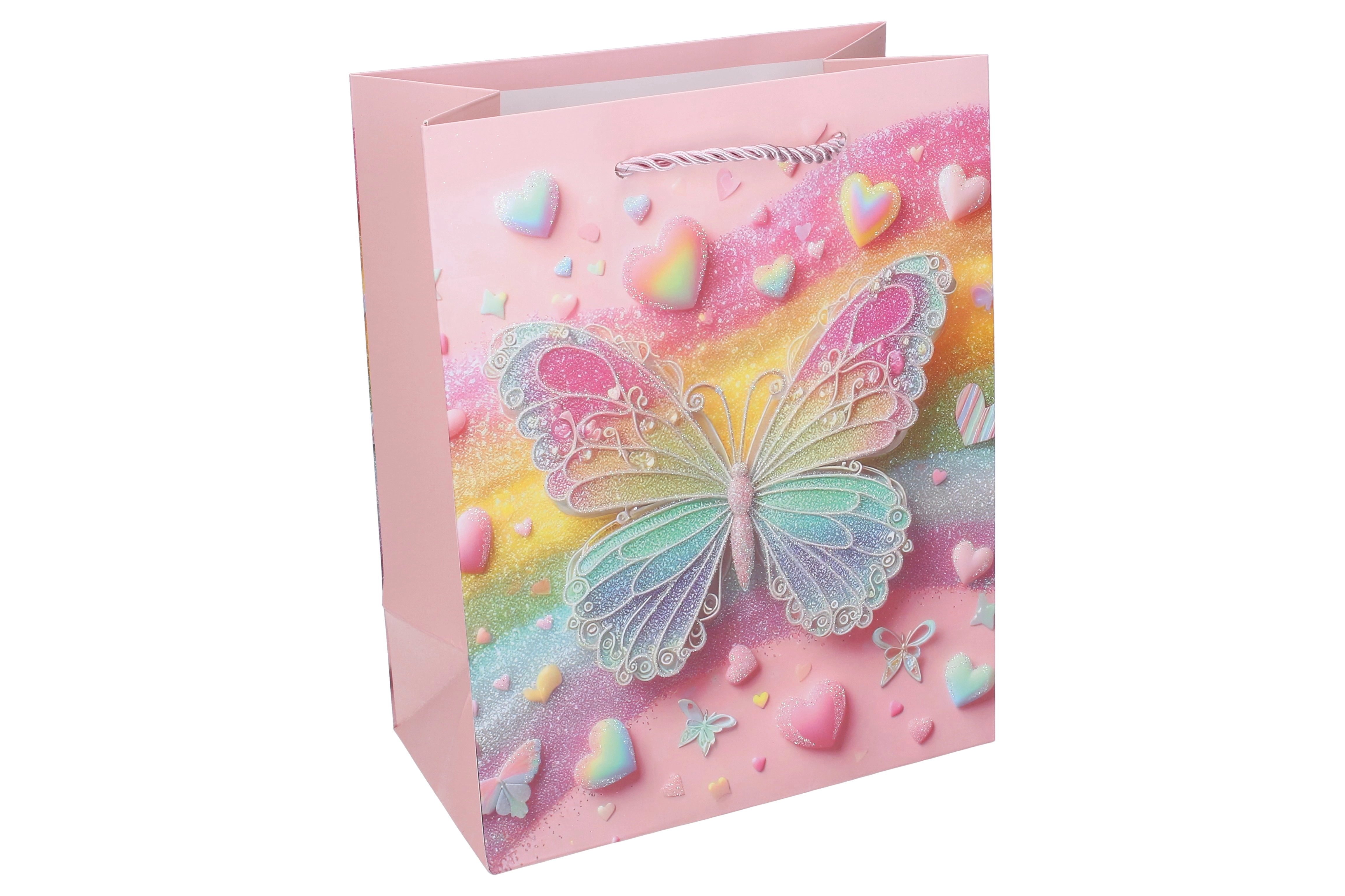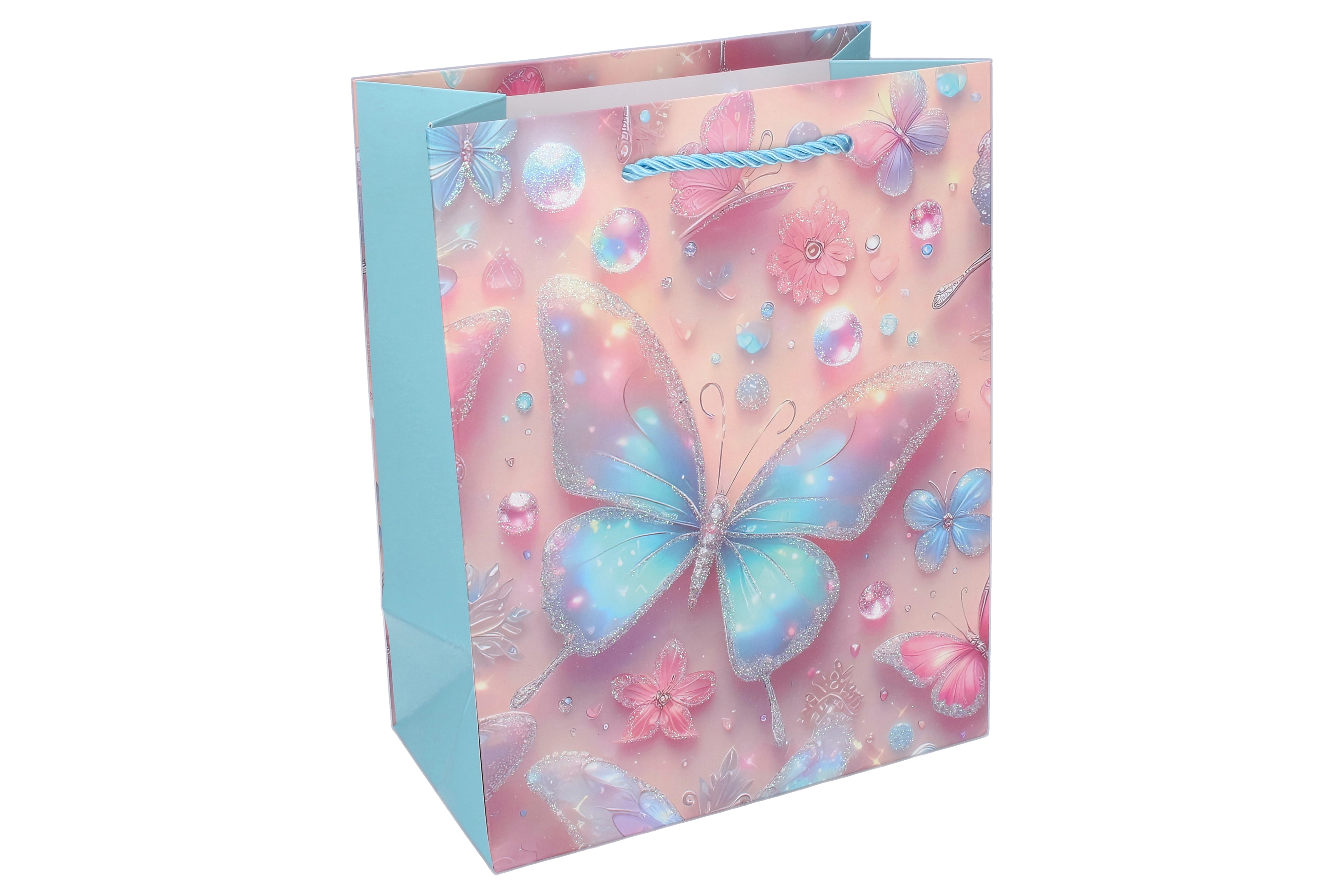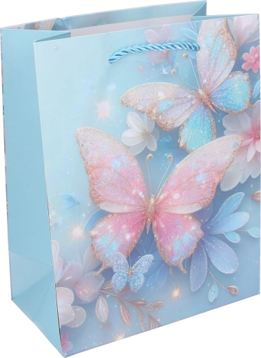 Pungă cadou stilată, mărimea M, cu motiv delicat de fluturi, care va bucura atât pe cei mici, cât și pe cei mari. Oferă mânere răsucite, rezistente, decor lucios cu sclipici și hârtie/carton durabil pentru utilizare repetată. Ideală pentru zile de naștere, sărbători și petreceri mici.