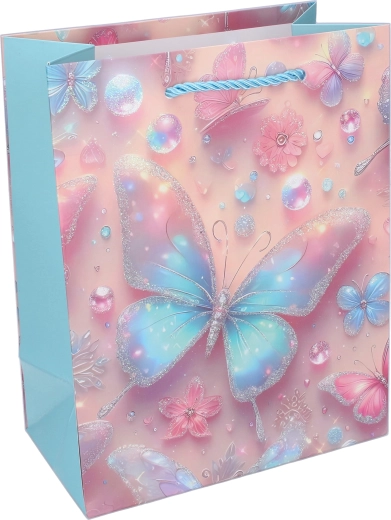 Această pungă cadou cu un motiv fermecător de fluturi transformă orice cadou într-o surpriză impresionantă. Se remarcă prin mânerele puternice din șnur, margini întărite și hârtie de calitate, care asigură purtare sigură și o prezentare frumoasă.