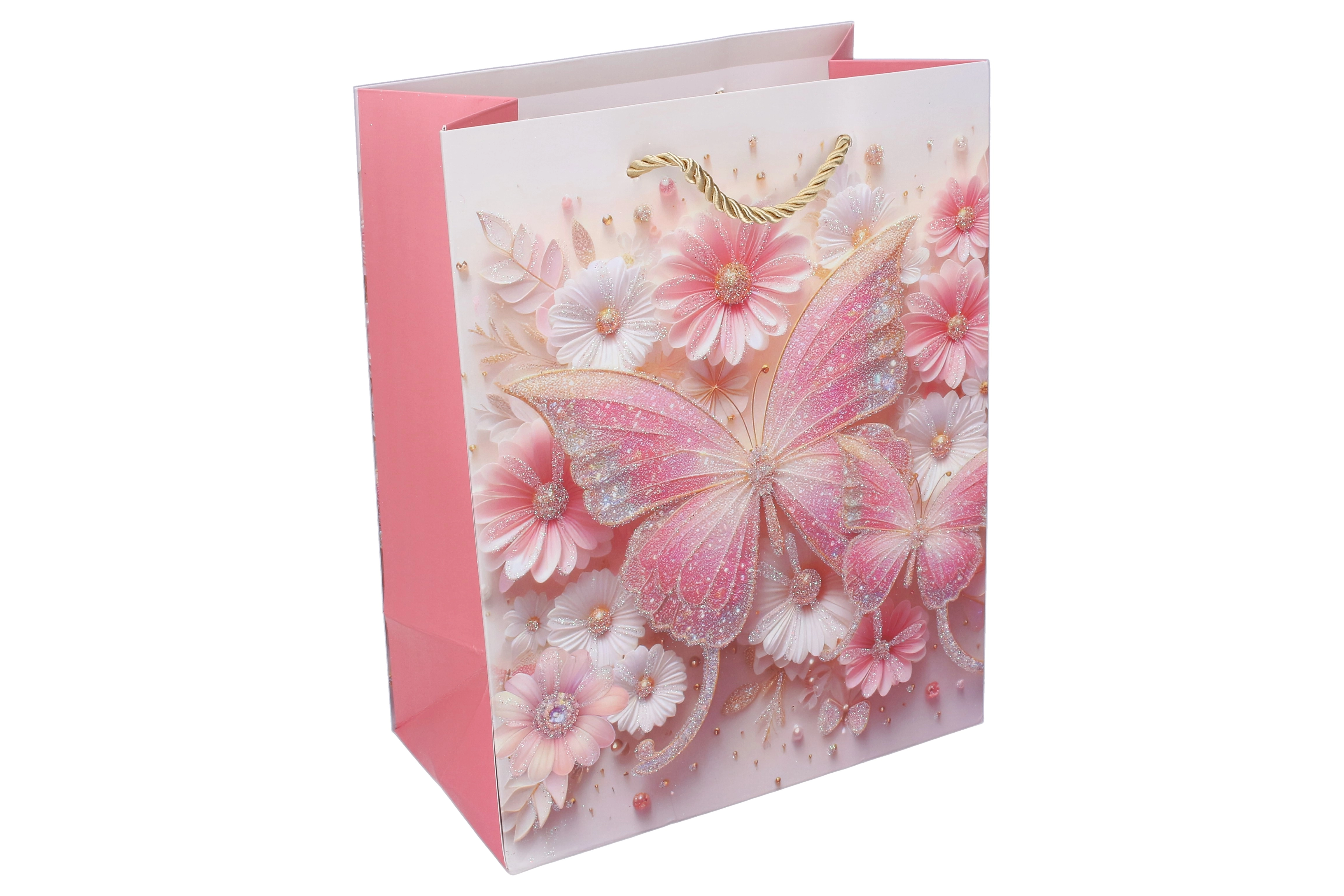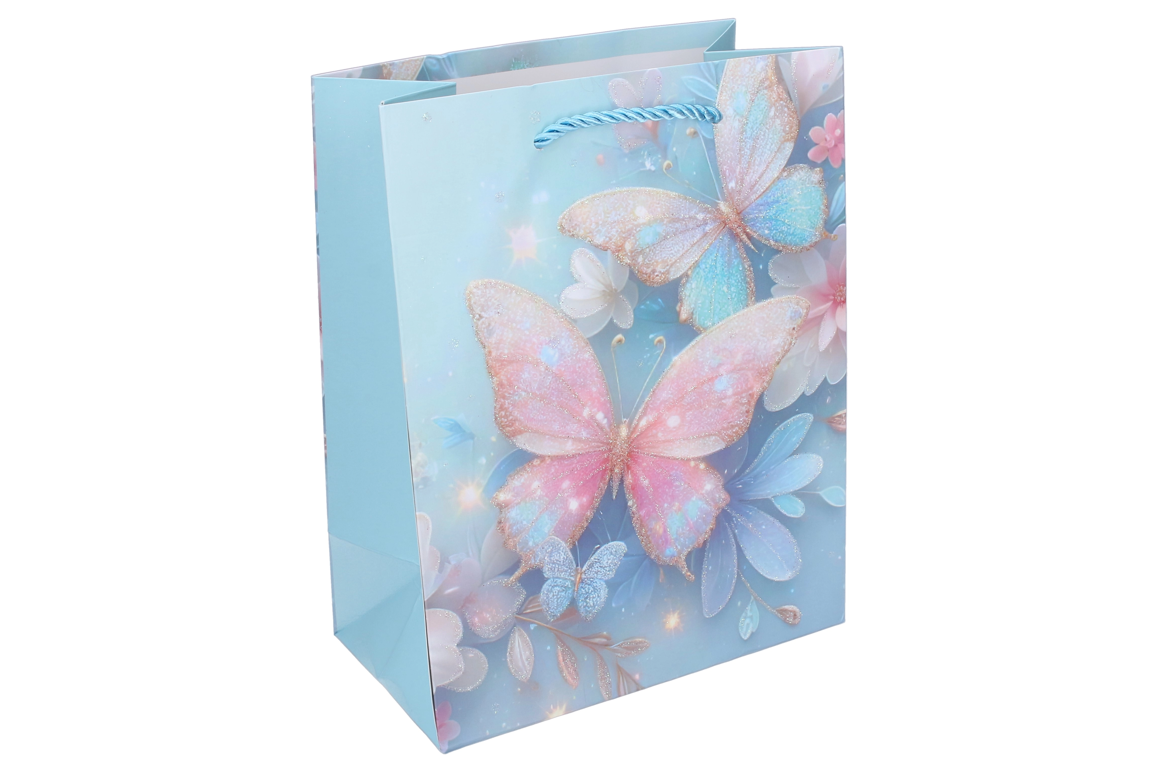 Pungă cadou elegantă din hârtie, mărimea S, cu motive delicate de fluturi, ideală pentru ambalarea stilată a cadourilor. Oferă mânere răsucite, rezistente, detalii lucioase și sclipitoare și o construcție durabilă din hârtie pentru transport în siguranță.