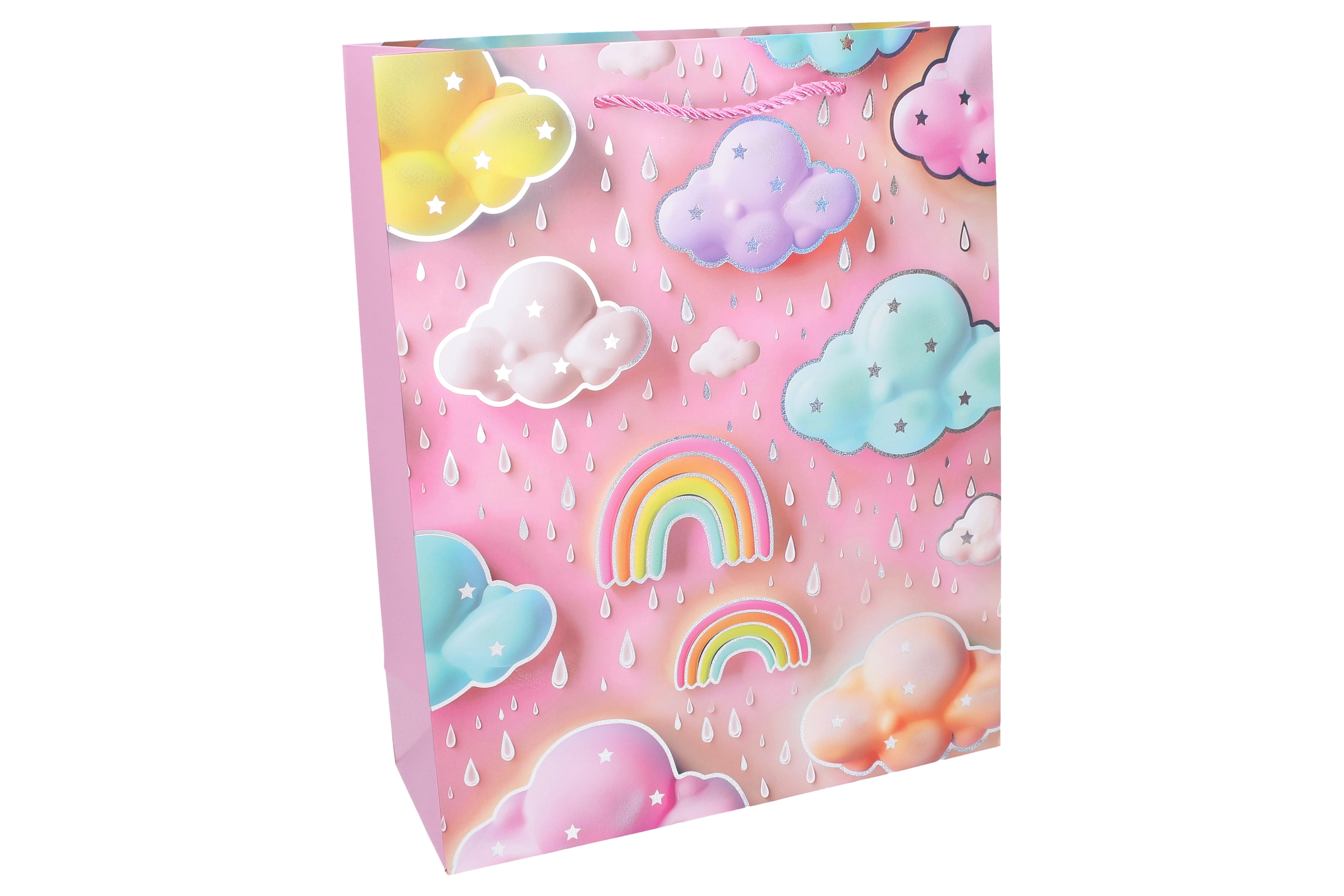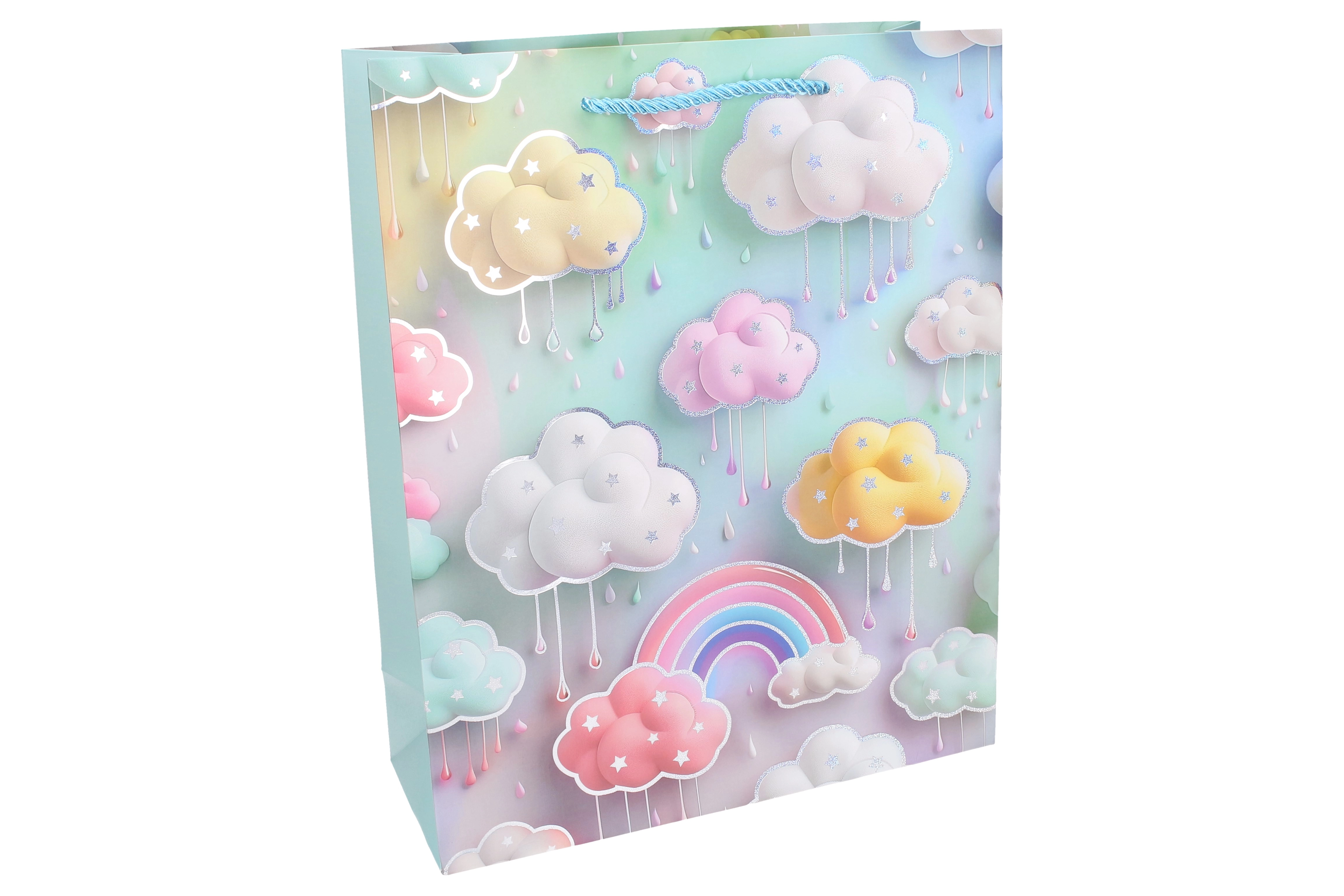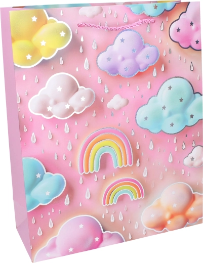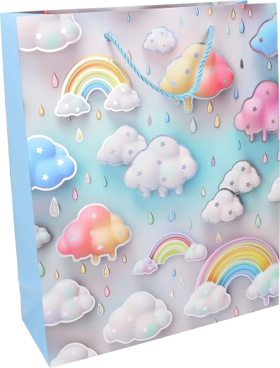 Drăguță pungă cadou pentru copii, mărimea S (18 × 23 × 10 cm), în culori pastel delicate, cu motive de nori, curcubeu și stropi. Datorită construcției din hârtie rezistentă și mânerele împletite din șnur, se poartă confortabil și transportă în siguranță darurile mai mici. Disponibilă în 4 variante de culori pentru aniversări, petreceri și evenimente pentru copii.