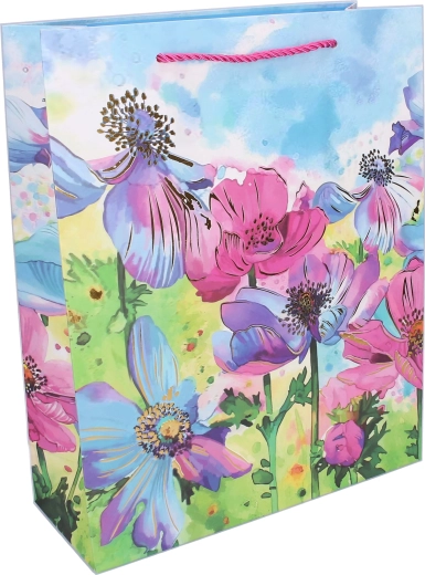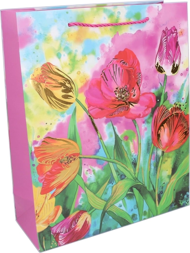 Dimensiunea L (31 × 42 × 12 cm) este ideală pentru haine, cărți, seturi cosmetice sau decorațiuni. Mânerele din șnur asigură transport confortabil, iar imprimarea lucioasă oferă cadoului o notă elegantă. Sunt disponibile 4 variante florale, dintre care o puteți alege pe cea potrivită.