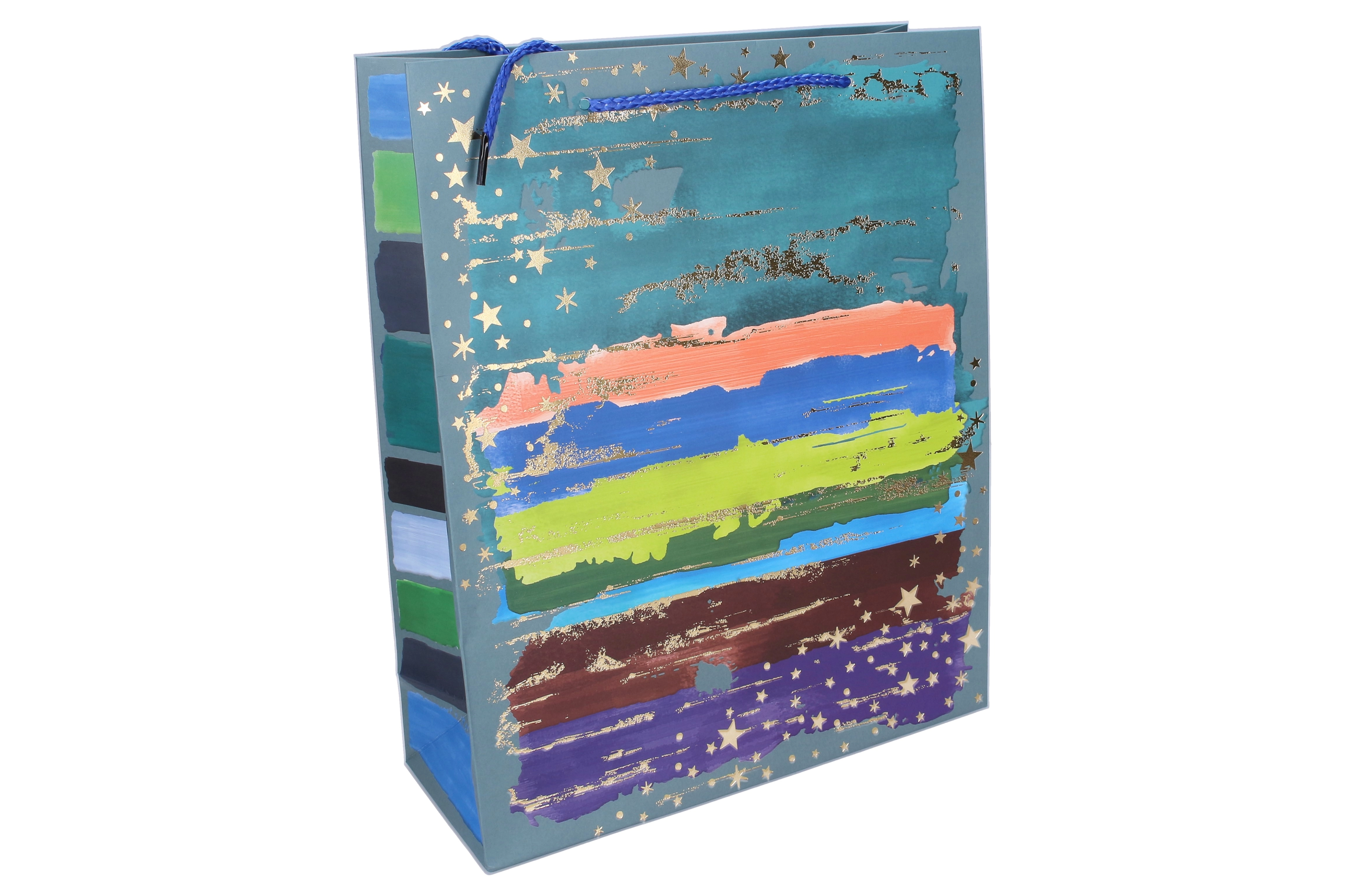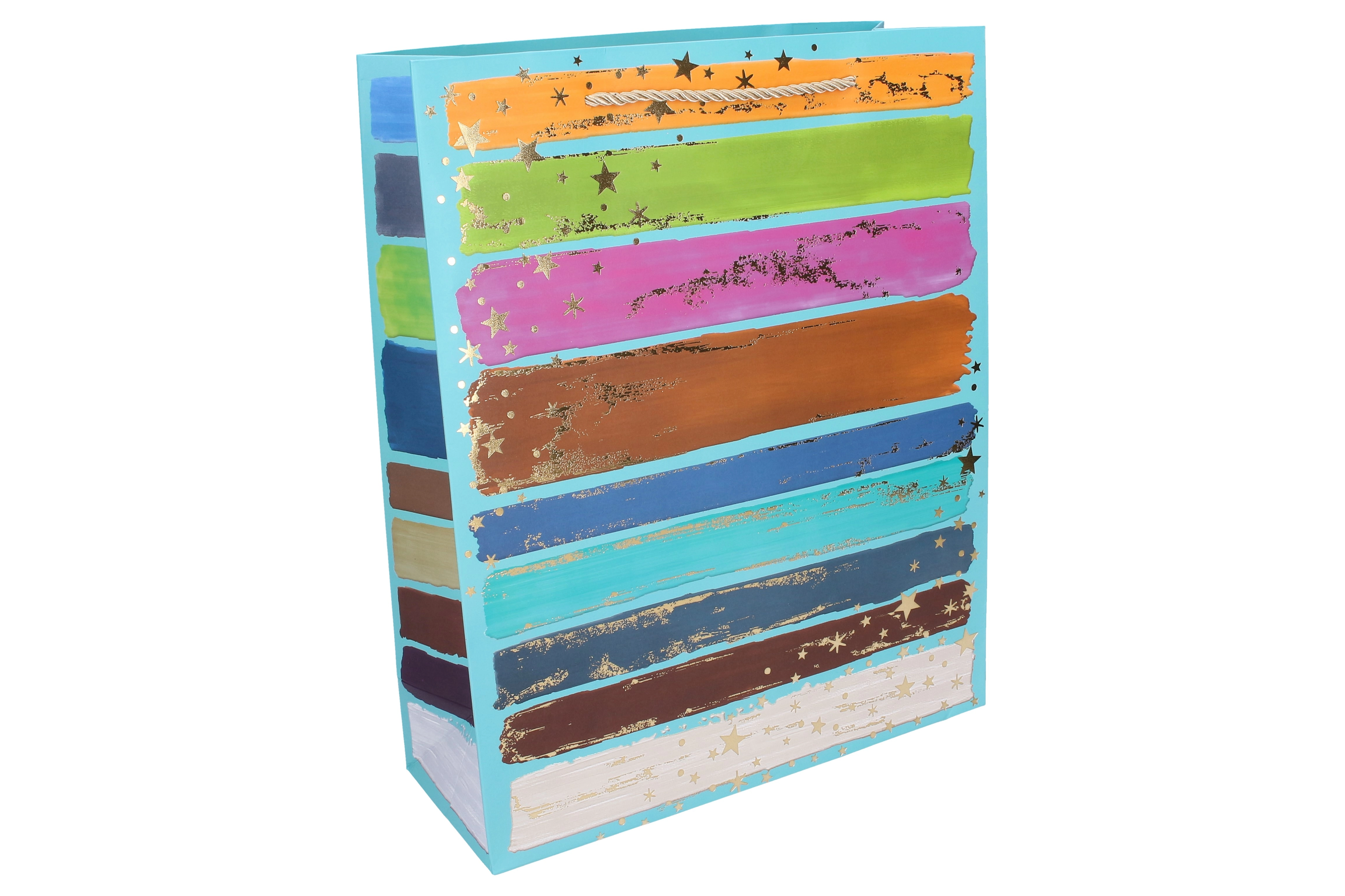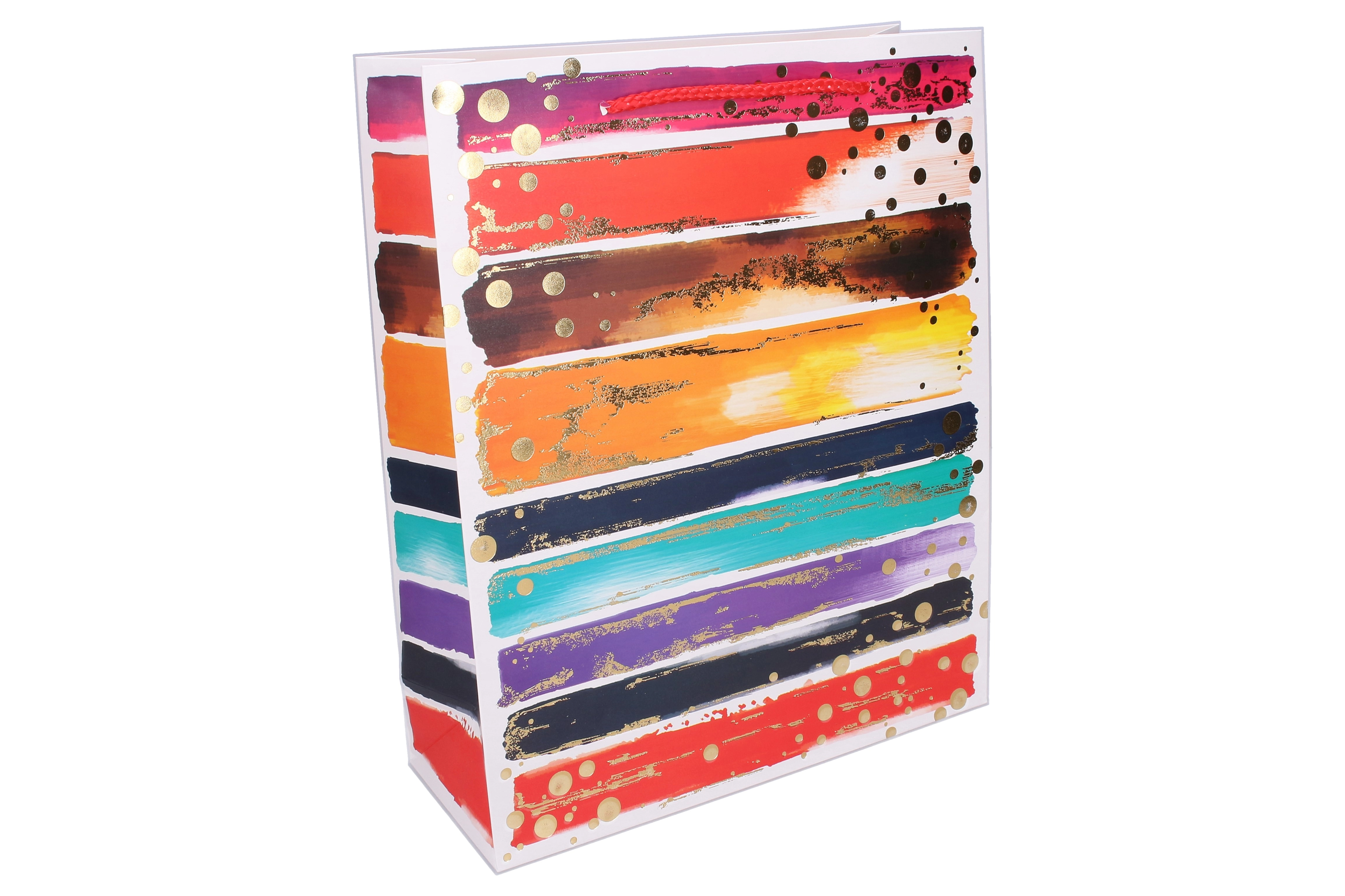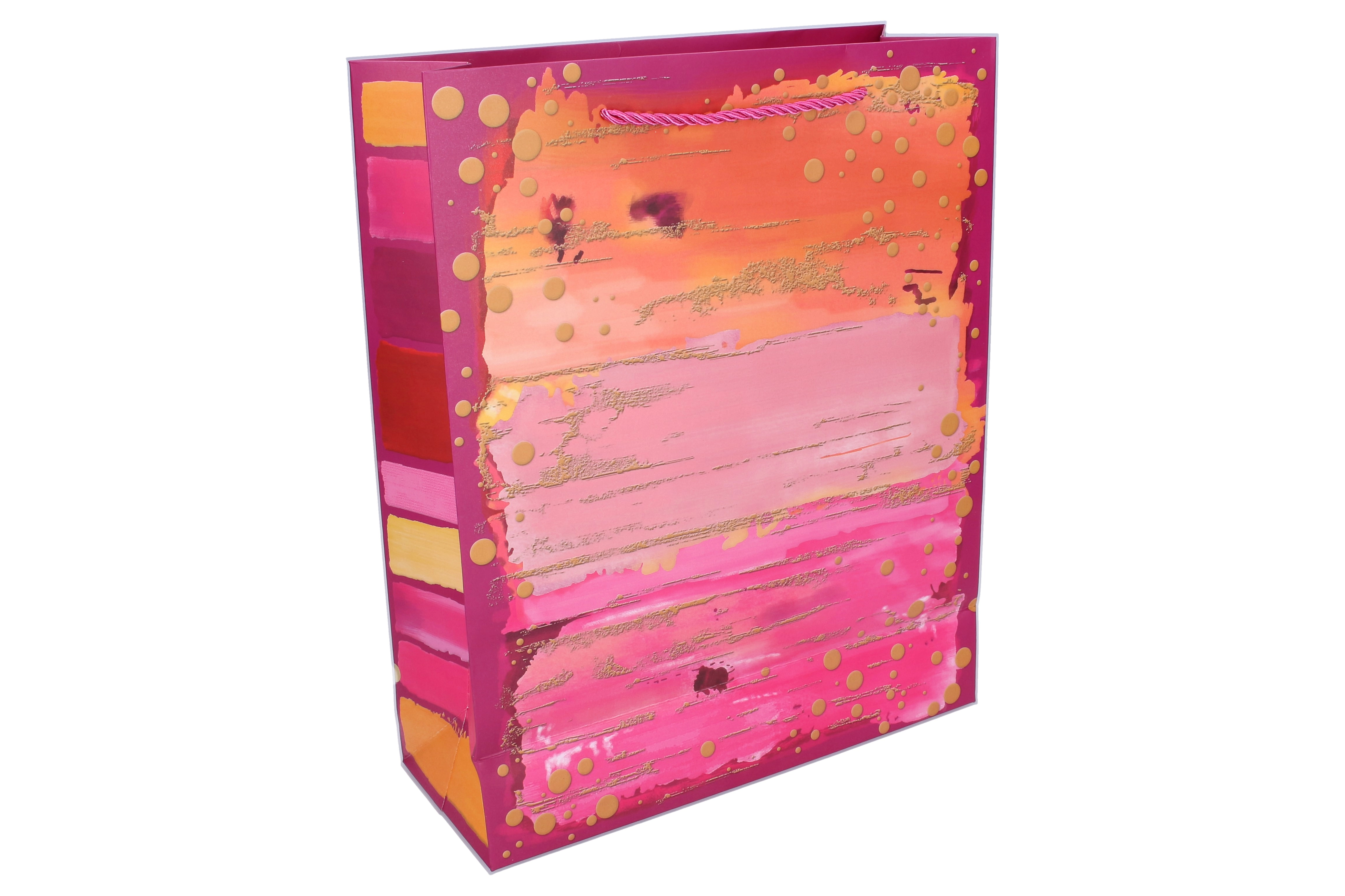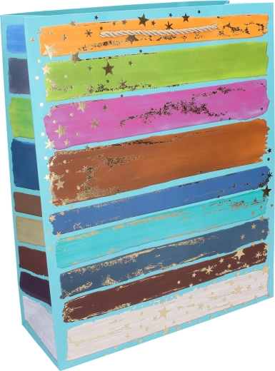 Dați un plus de stil cadourilor cu punga cadou spațioasă mărimea L. Designul cu tușe vii, dungi și detalii aurii oferă o notă modernă și festivă pe tot parcursul anului. Datorită mânerelor rezistente și pliurilor laterale întărite, transportă comod cadouri mai voluminoase, textile, cutii sau mai multe obiecte mici.
