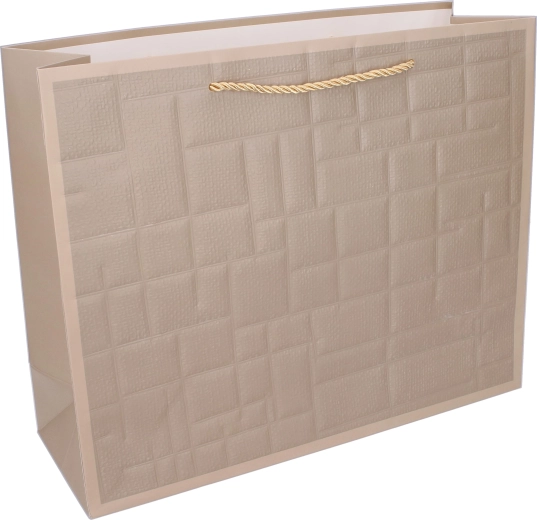 Pungă cadou stilată, mărimea L, cu dimensiunile 32 × 38 × 12 cm, ideală pentru oferirea elegantă a cadourilor pe tot parcursul anului. Oferă mânere răsucite din șnur, decor în relief și patru variante de culori discrete – albastru, negru, maro și bej.