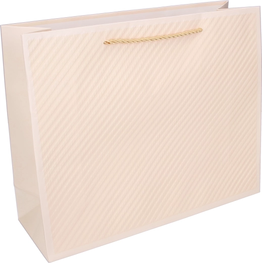 Pungă cadou practică și stilată, cu dimensiunile 17,7 × 23 × 10 cm, ideală pentru cadouri mici, produse cosmetice sau accesorii. Construcția din hârtie de calitate, cu finisaj texturat în relief, are un aspect reprezentativ și protejează conținutul în timpul transportului.