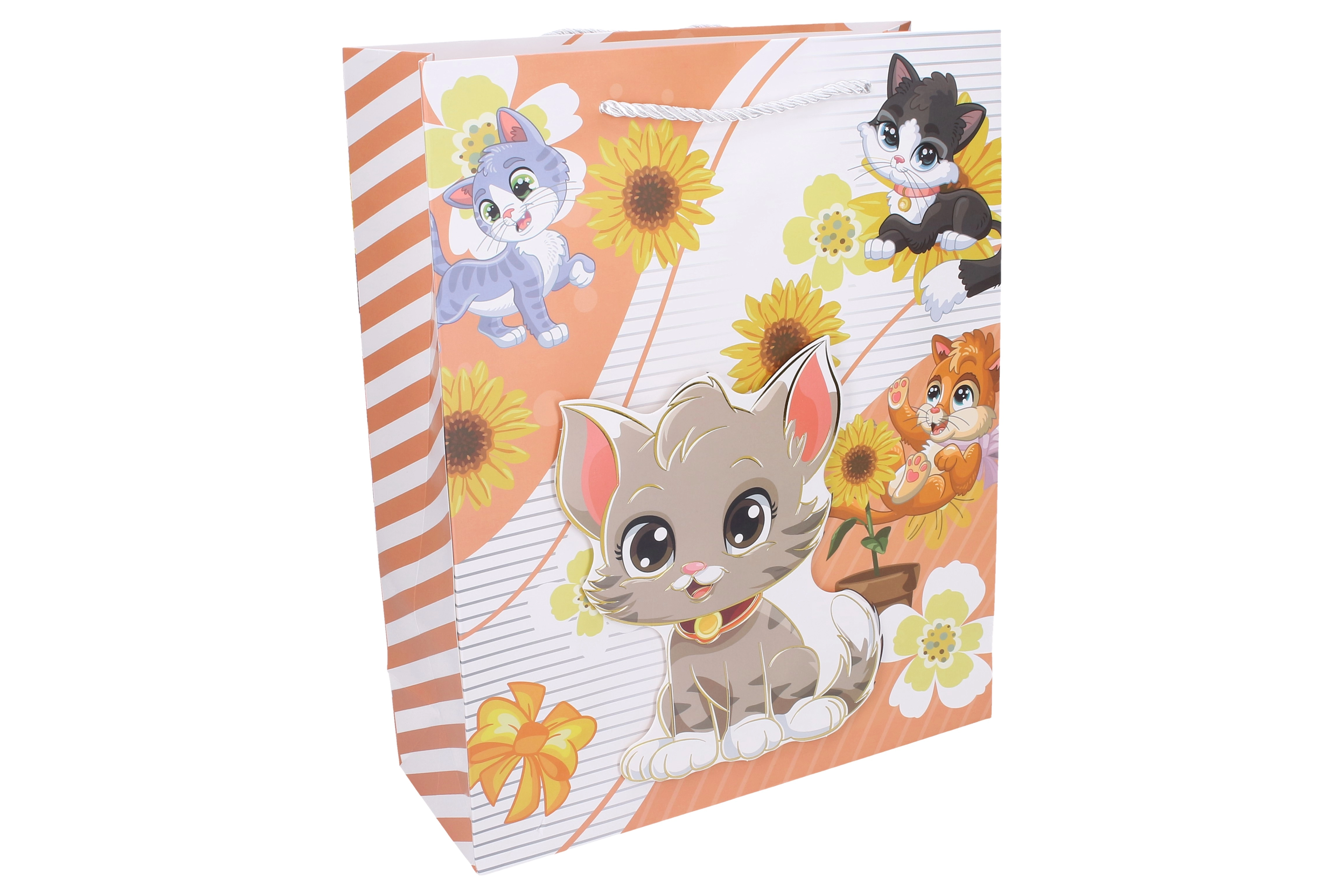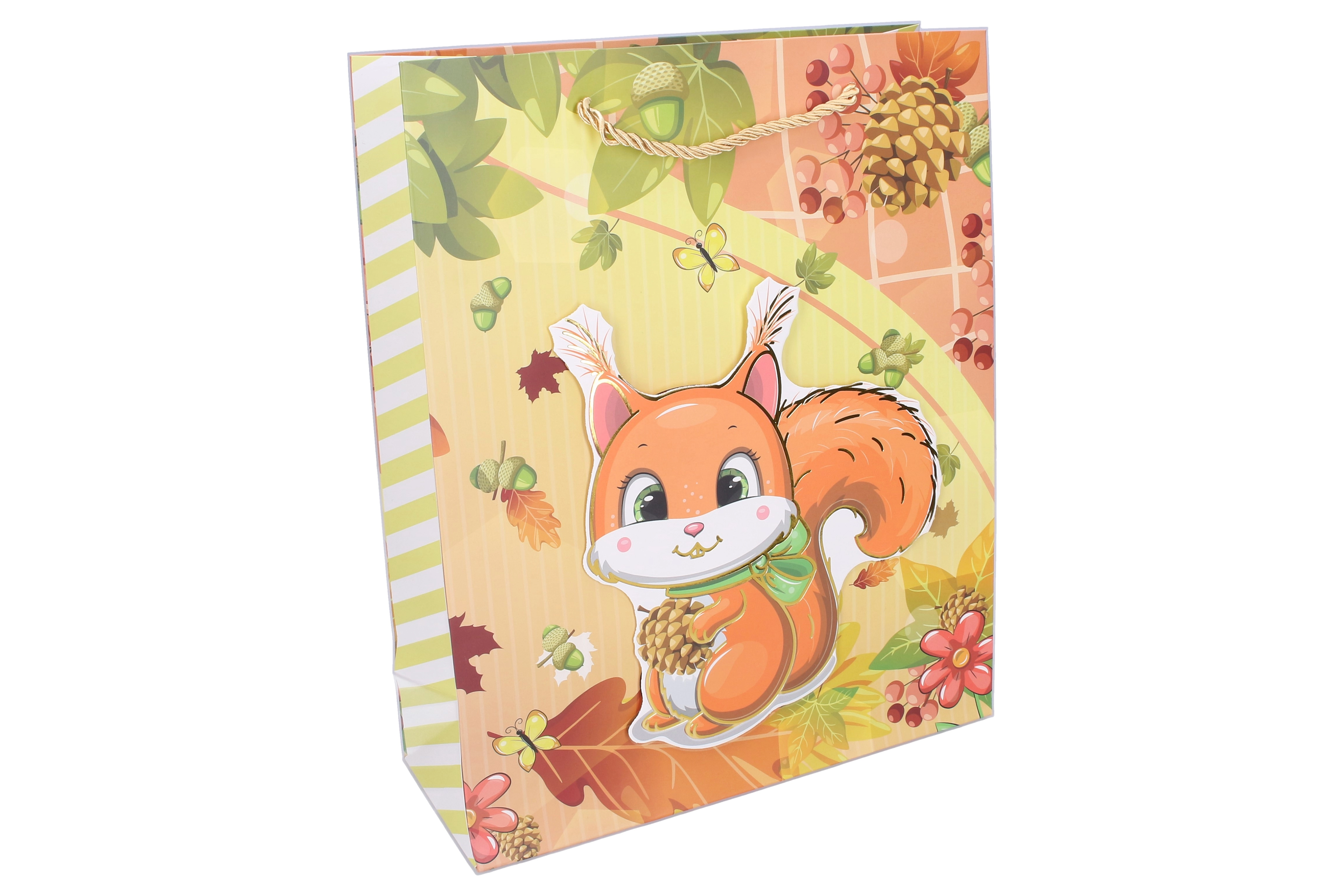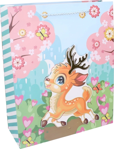 O pungă cadou pentru copii, mărimea L, cu dimensiunile 30 × 41,5 × 12 cm, cu motive de animăluțe, aduce bucurie la fiecare oferire de cadouri. La alegere sunt disponibile 4 variante – pisică, cerb, tigru și veveriță.