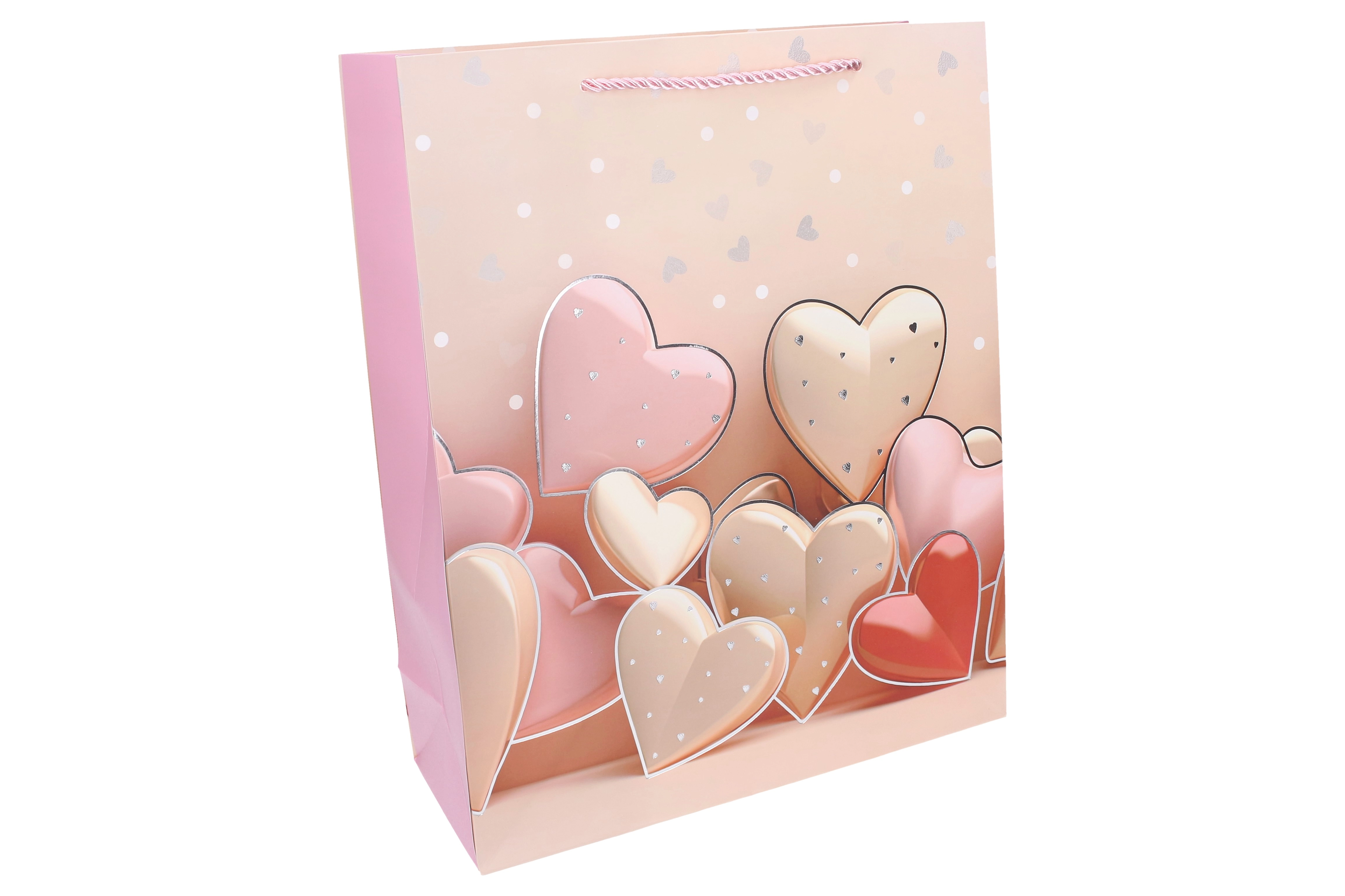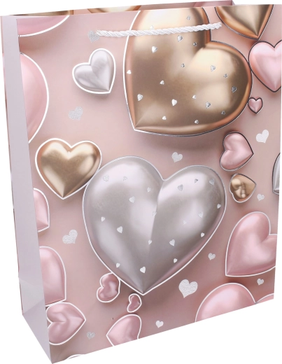 Această pungă cadou din hârtie, elegantă, cu inimioare, oferă cadoului tău un aspect deosebit. Imprimeul lucios în tonuri de roz, auriu și argintiu, împreună cu mânerele de calitate din șnur, asigură purtare confortabilă și sigură. O alegere excelentă pentru zile de naștere, aniversări, nunți și dăruiri zilnice.