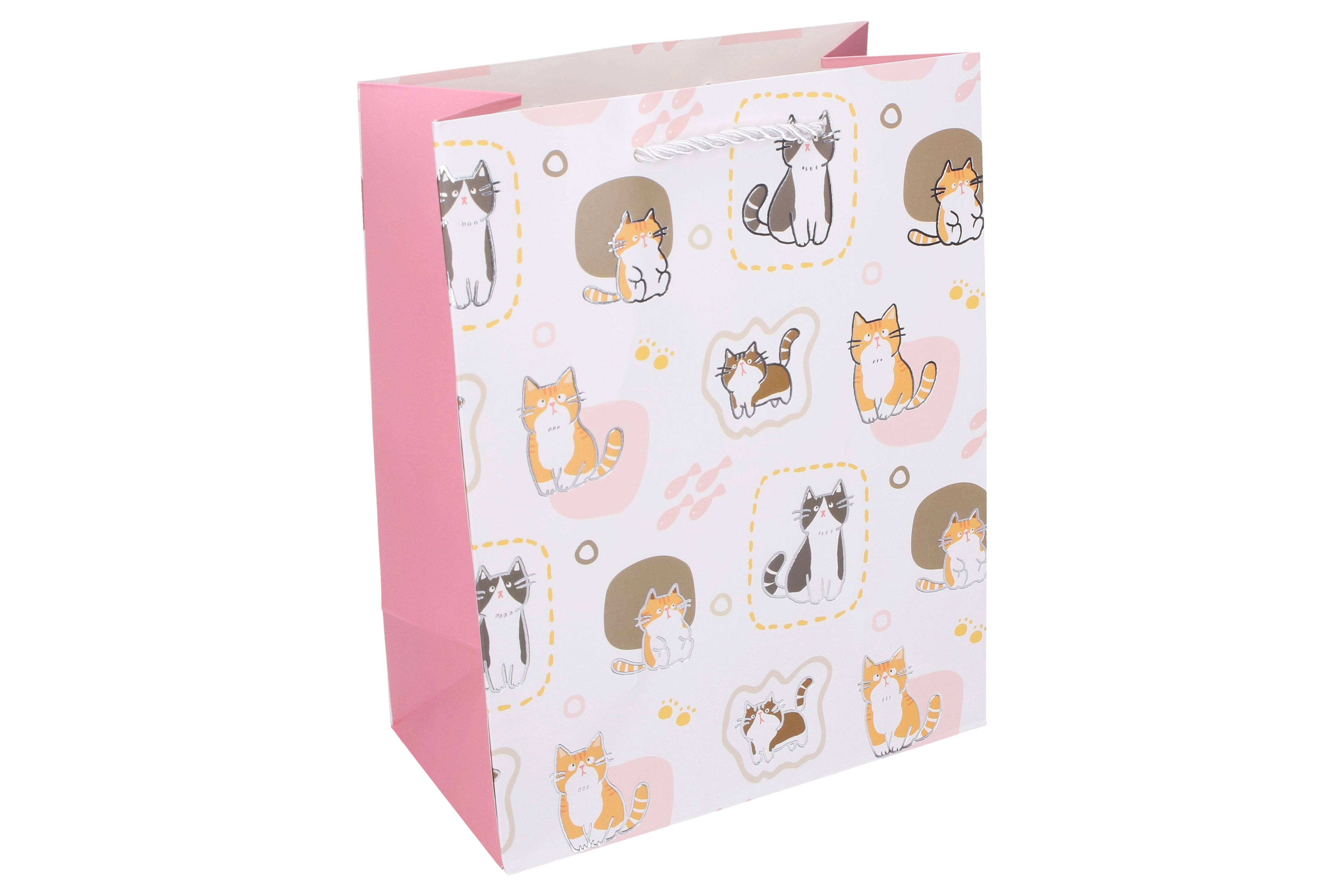 Pungă cadou drăguță, mărimea L, cu motiv de pisici, care va încânta atât copiii, cât și iubitorii de animale de companie. Oferă execuție din hârtie rezistentă, mânere practice din sfoară și bază stabilă pentru ambalarea ușoară a cadourilor. Disponibilă în 4 variante stilate în culori pastelate delicate.