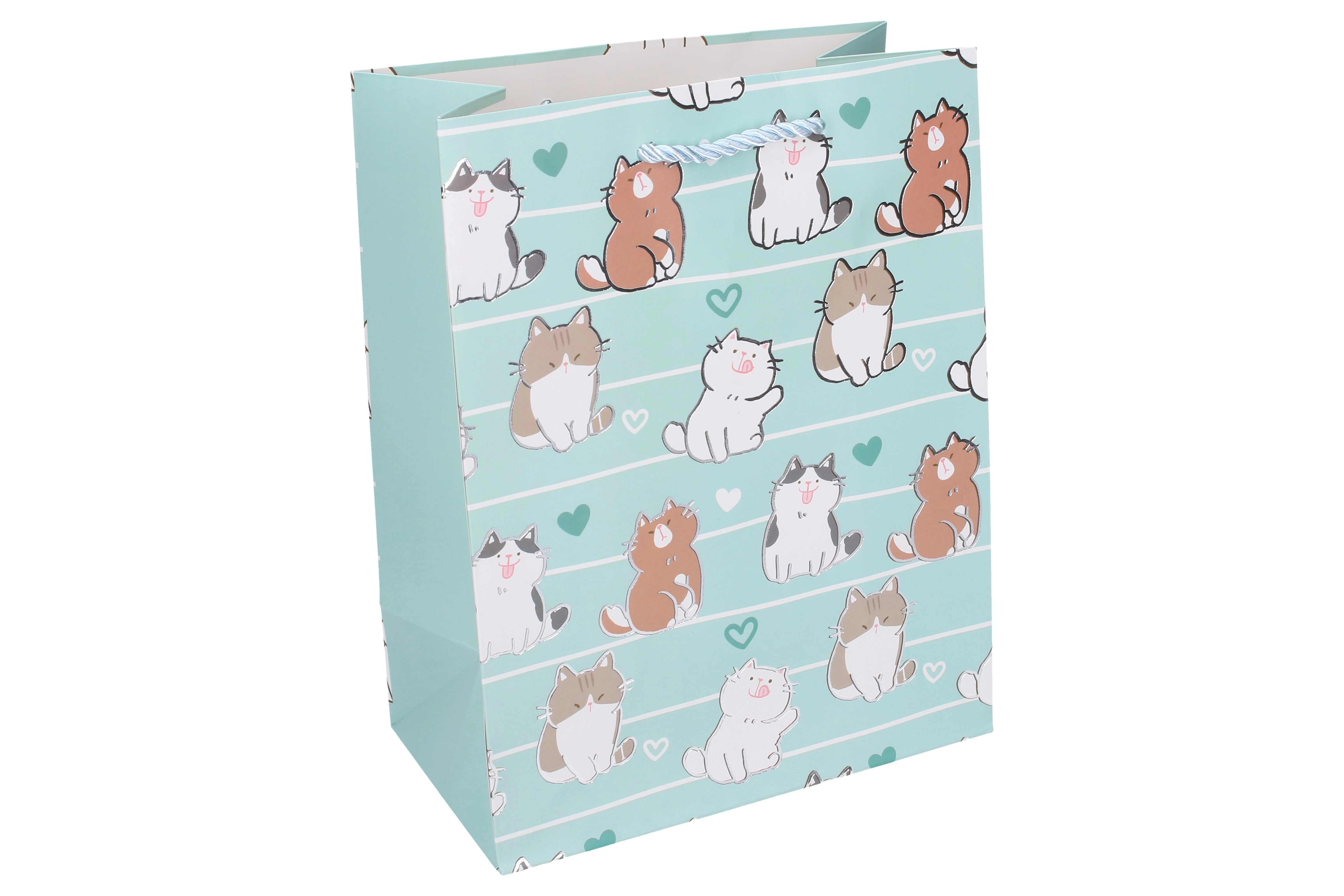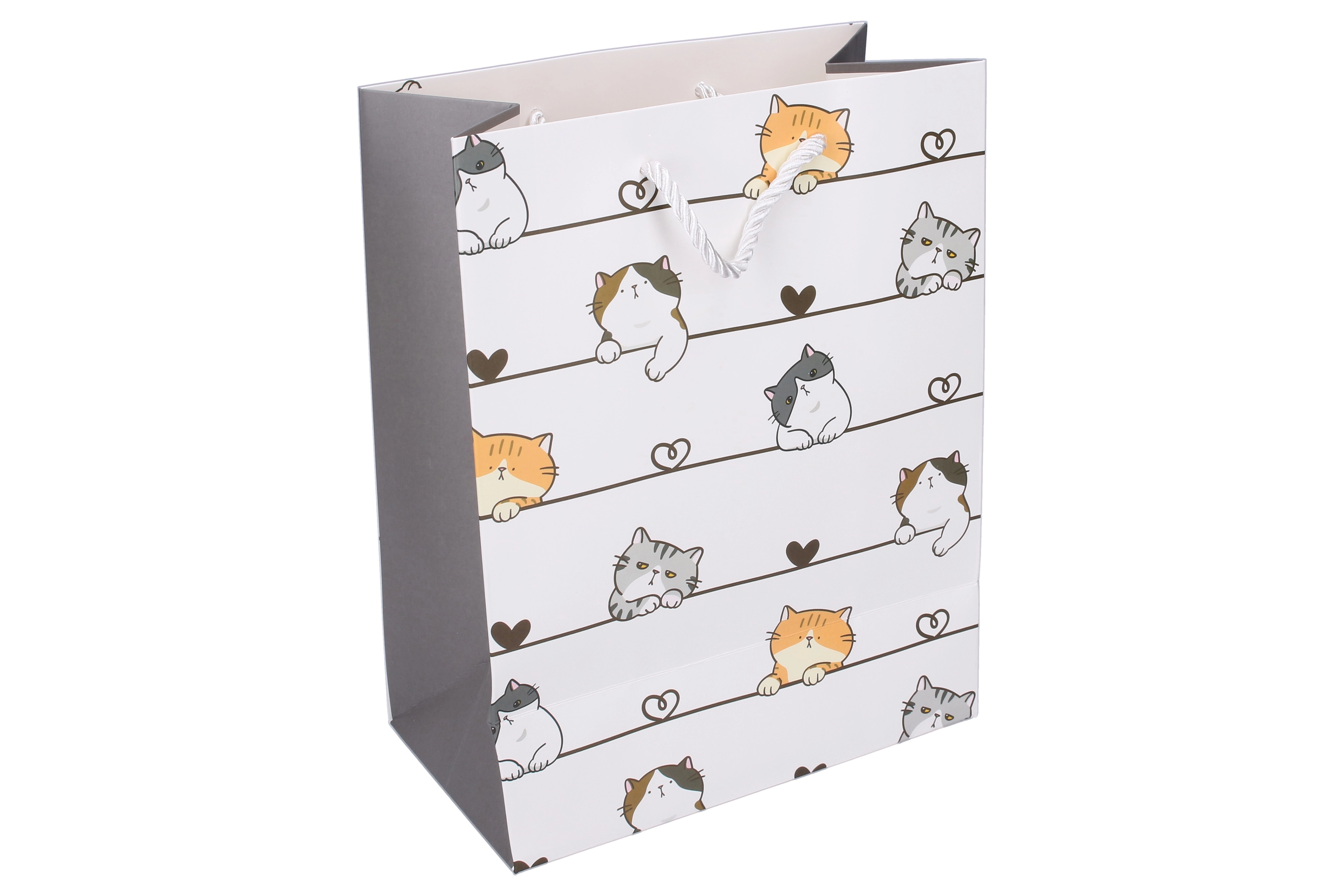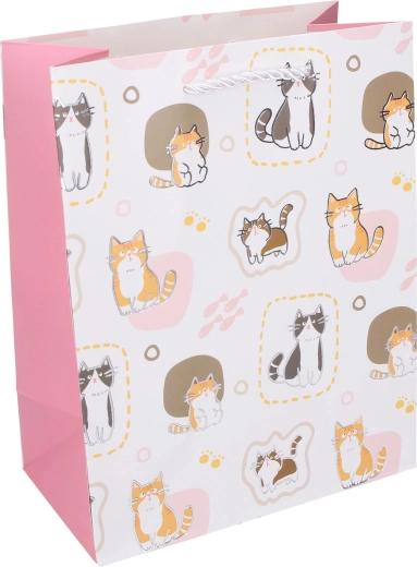 Pungă cadou drăguță, mărimea S, cu motiv repetat de pisici, care va bucura copiii și iubitorii de animale. Are execuție din hârtie rezistentă, margini întărite și mânere din șnur durabile pentru purtare confortabilă. Ideală pentru cadouri mici, jucării și mărunțișuri, disponibilă în mai multe variante de culoare pentru ambalare stilată și sigură a cadourilor.