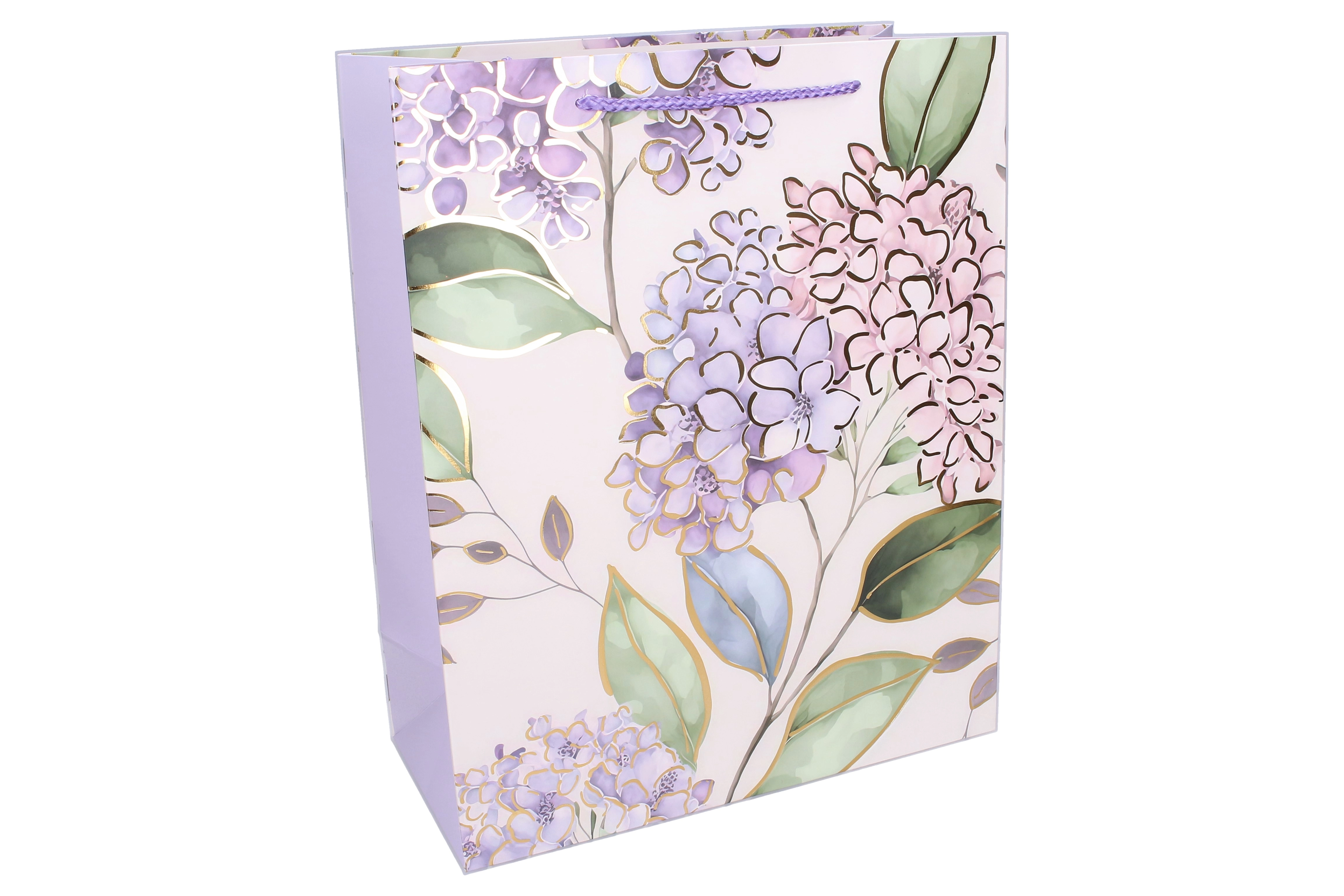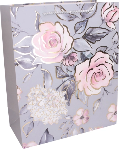 Această pungă cadou din hârtie de calitate impresionează prin model floral delicat cu accente metalice și un aspect premium. Datorită construcției robuste și mânerelor întărite, poate susține în siguranță și cadouri mai grele. Pliurile laterale asigură capacitate suficientă, astfel încât poți introduce cu ușurință o cutie, textile sau un set de mici cadouri.