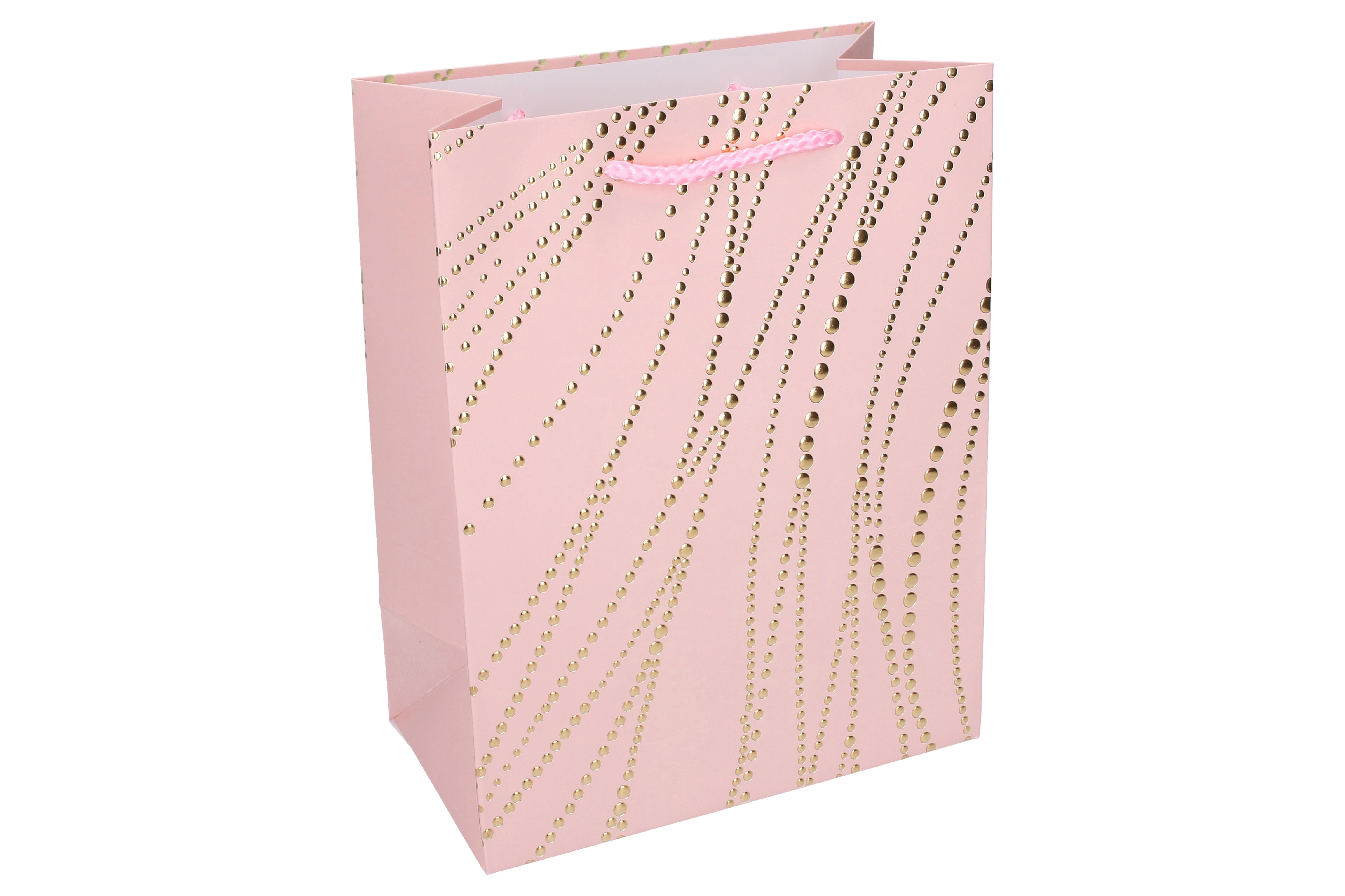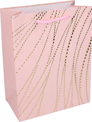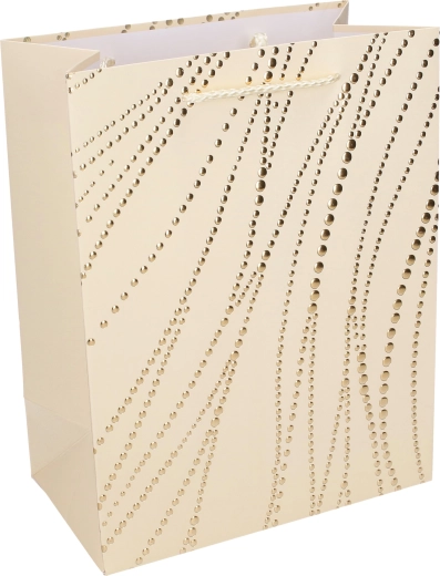 Această pungă cadou pentru tot anul, mărimea L, este ideală pentru zile de naștere, nunți, aniversări și cadouri corporate. Suprafața lucioasă cu model fin de buline aurii în valuri arată luxos și modern, în timp ce mânerele rezistente garantează transport confortabil și sigur.