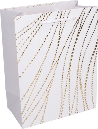 Pungă cadou stilată, mărimea S, cu dimensiunile 18 × 23 × 10 cm, impresionează prin eleganță și practicitate. Se remarcă prin suprafață lucioasă, model ondulat punctat auriu și mânere împletite rezistente pentru purtare confortabilă. Ideală pentru ambalarea cadourilor pe tot parcursul anului – zile de naștere, nunți și sărbători.