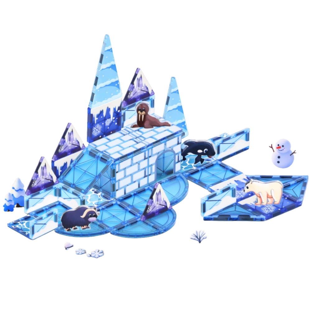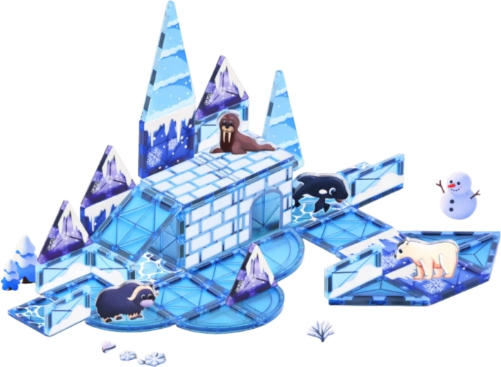 Descoperă lumea creativă a Arcticii cu setul magnetic de 44 de piese. Panourile albastre transparente se conectează ușor datorită magneților puternici, iar copiii pot construi castele de gheață, poduri și rampe. Setul include figurine cu animale polare, care stimulează imaginația, motricitatea fină și gândirea spațială.