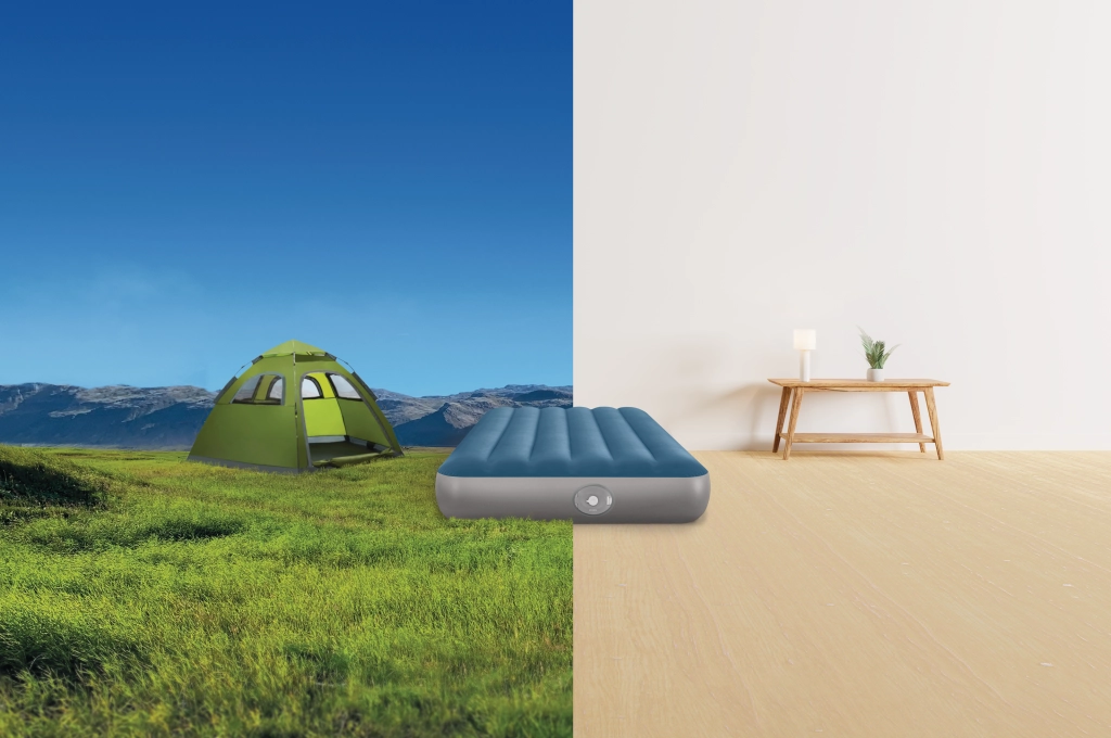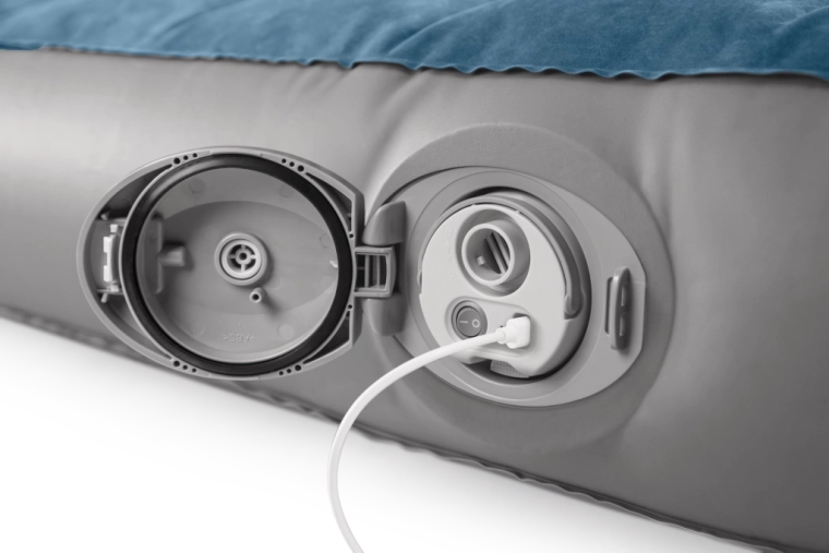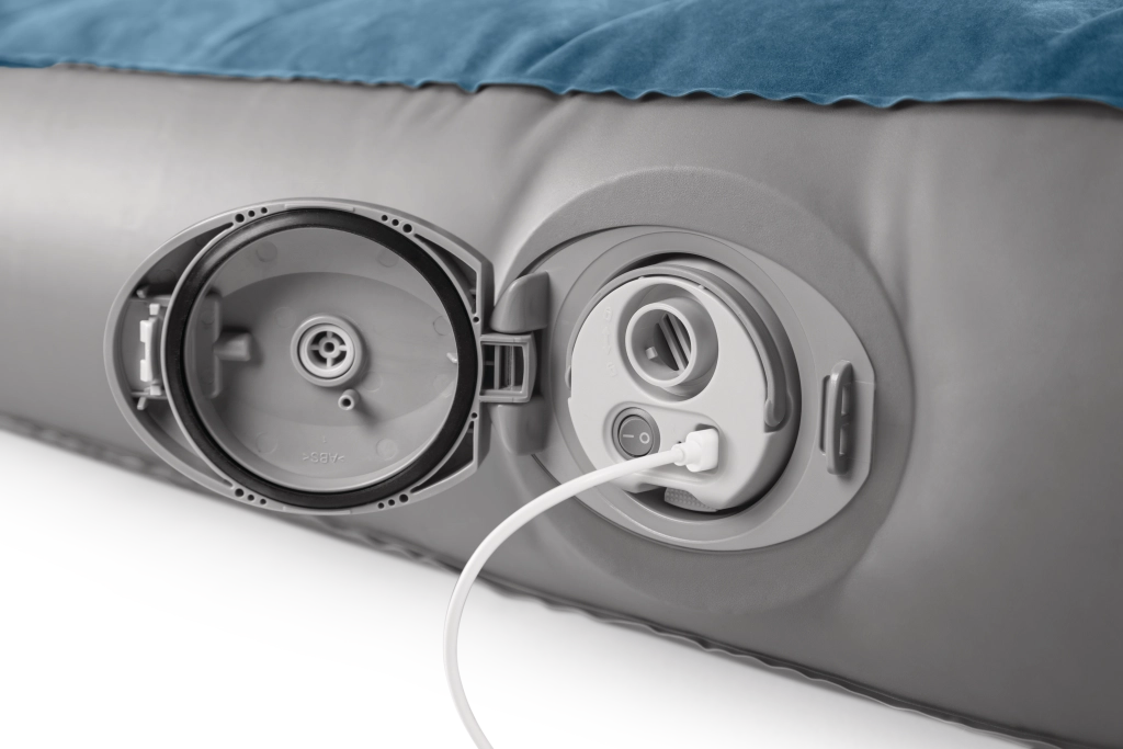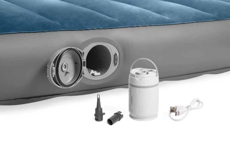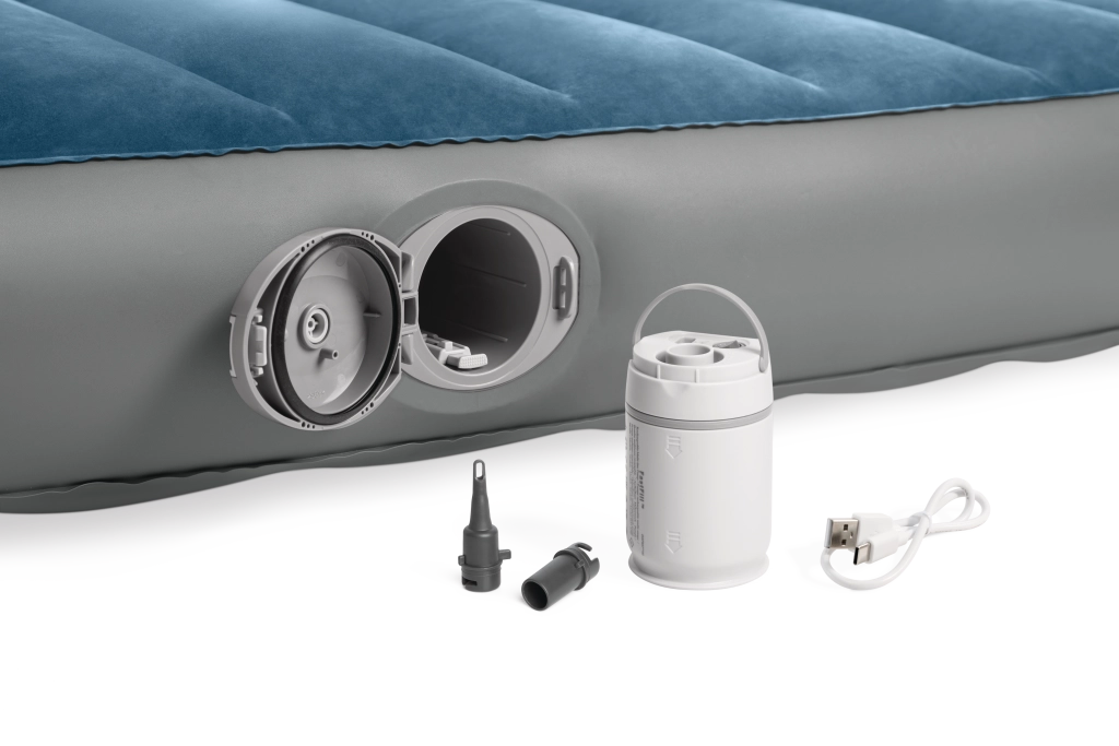 Pompa reîncărcabilă integrată cu baterie Li‑ion se introduce direct în deschiderea din lateralul patului și permite umflare și dezumflare rapide. Se încarcă prin USB aproximativ 3 ore, are oprire automată după 8 minute și, datorită celor două adaptoare, o poți folosi și pentru alte produse gonflabile. Dacă bateria este descărcată, patul poate fi ușor completat prin valva 2‑în‑1.