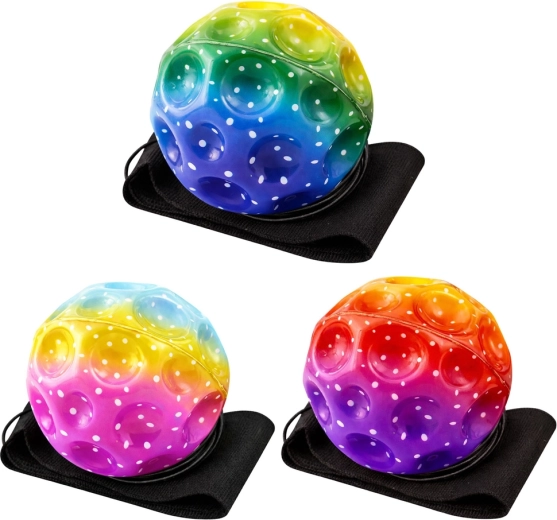 Mingiuță senzorială colorată pe elastic cu brățară ajustabilă pentru joacă în siguranță acasă și afară. Este moale, foarte ușoară și flexibilă, cu suprafață cu gropițe pentru stimularea tactilă. Ajută excelent la antrenarea coordonării, reflexelor și alină stresul fără grija pierderii mingiuței.