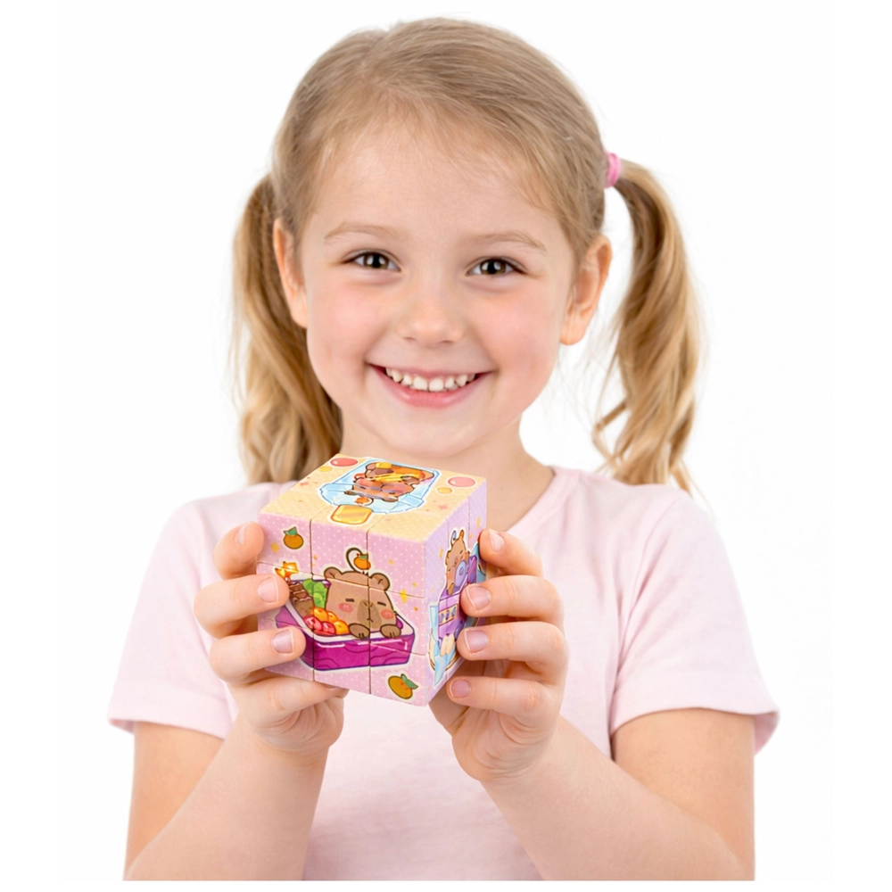 Acest cub logic colorat, cu motiv de capibara, este o excelentă jucărie–puzzle pentru cei mai mici. Prin rotirea și mutarea segmentelor, copiii compun pe fiecare parte imagini drăguțe, exersând în mod natural spiritul de observație și răbdarea. Datorită suprafețelor netede și dimensiunii plăcute, cubul se ține ușor în mână și invită la joacă iar și iar.