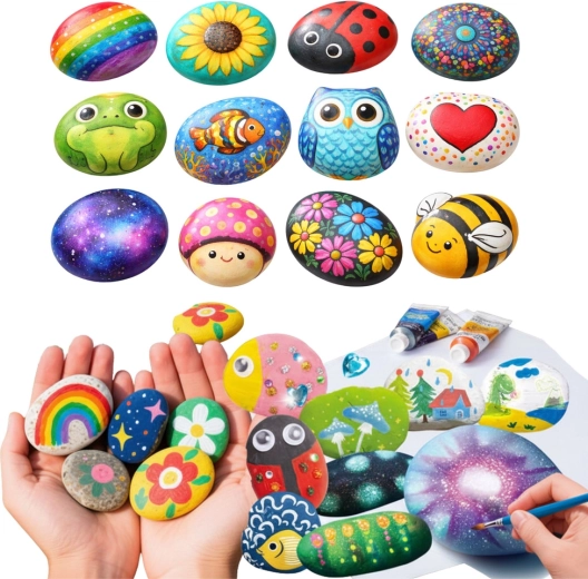 Utilizarea simplă și numeroasele accesorii transformă pictarea pietrelor într-o activitate comună grozavă pentru după-amieze sau weekend.