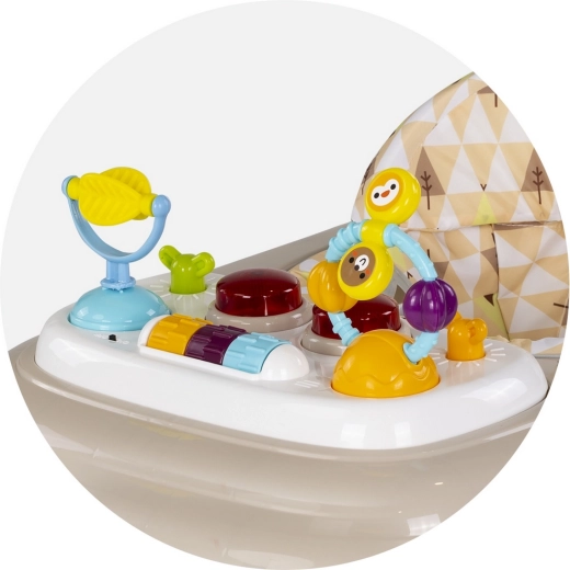 Panoul interactiv cu jucării colorate, butoane, efecte luminoase și 12 melodii sprijină dezvoltarea motricității fine, a percepției senzoriale și a coordonării. Panoul este detașabil, astfel încât copilul se poate juca și în afara antepremergătorului. Construcția se pliază ușor pentru economisirea spațiului și transport facil.