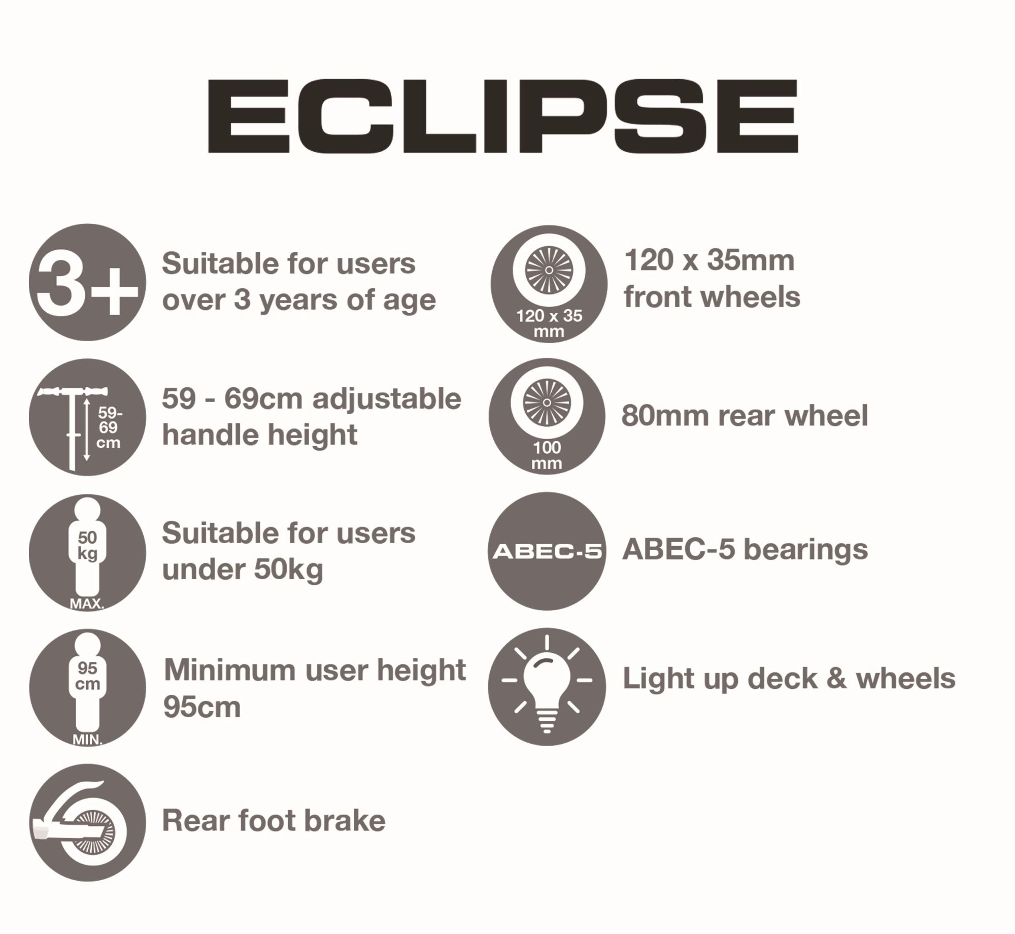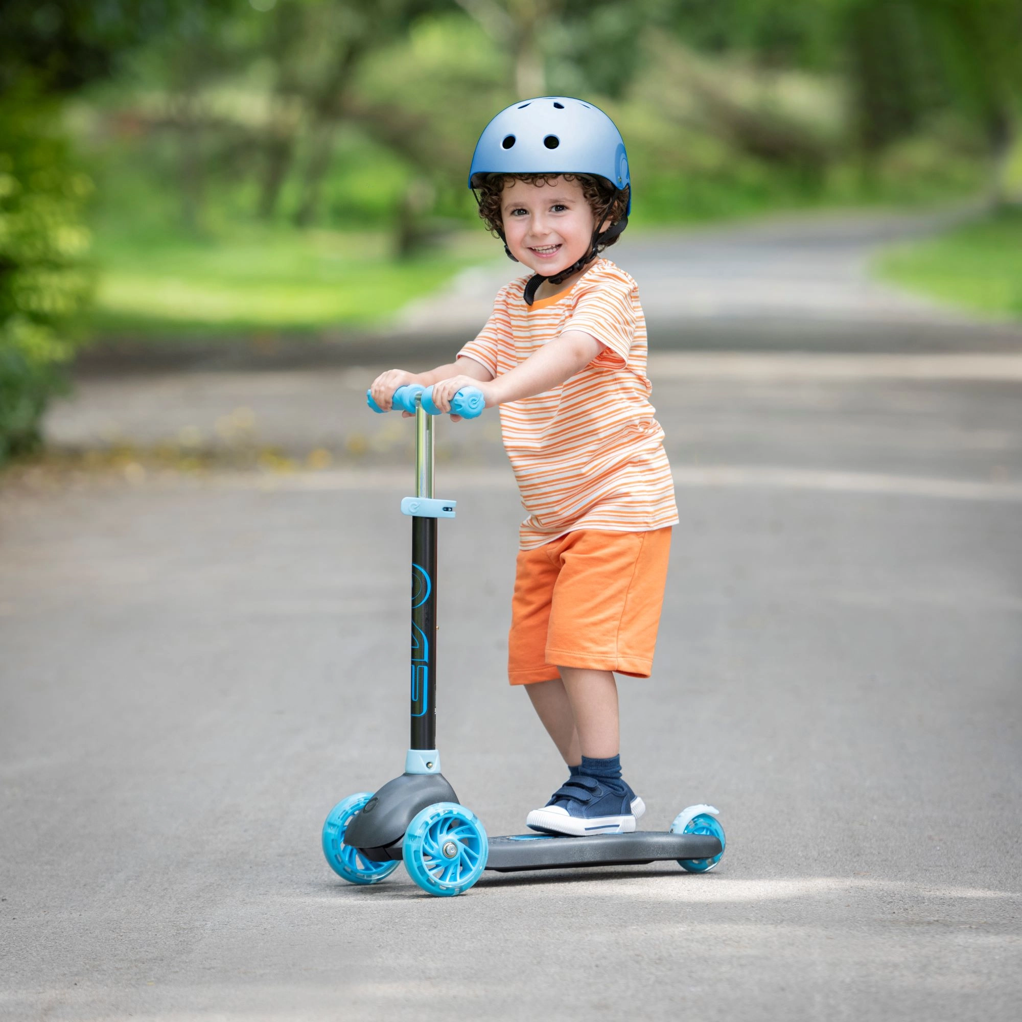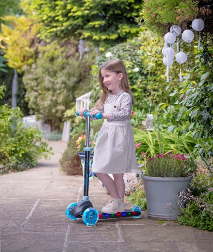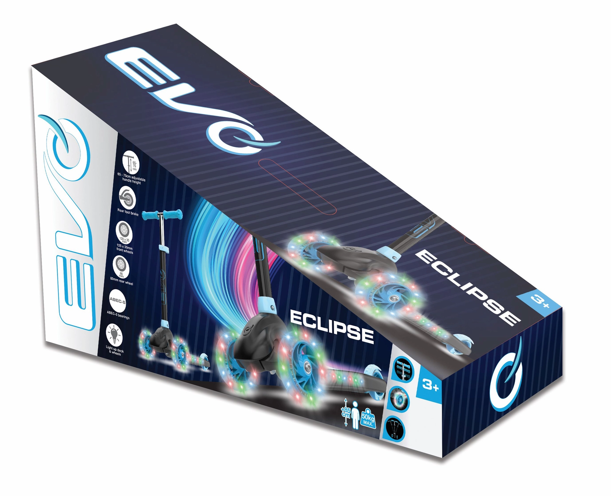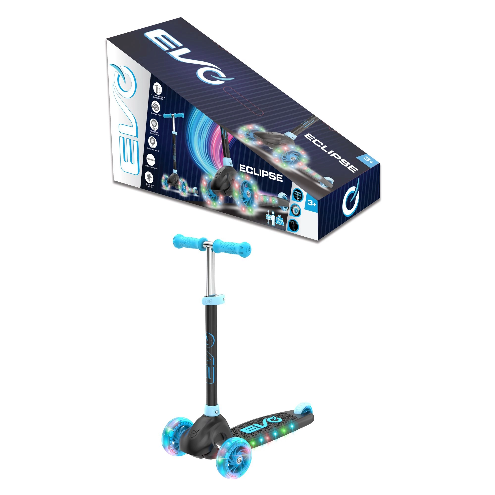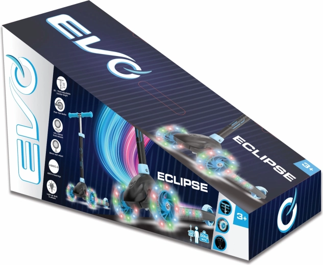 Trotineta pentru copii cu trei roți EVO Eclipse oferă o plimbare stabilă și distractivă pentru micii rideri începând de la 3 ani. Datorită celor două roți din față, înălțimii reglabile a ghidonului și roților și platformei iluminate, copiii se bucură în siguranță de fiecare ieșire, în timp ce își dezvoltă echilibrul și coordonarea.