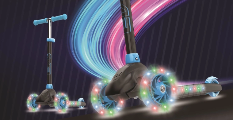 Roțile iluminate și marginea platformei adaugă efect și îmbunătățesc vizibilitatea pe înserat. Sunt necesare 3× baterii AAA (nu sunt incluse).