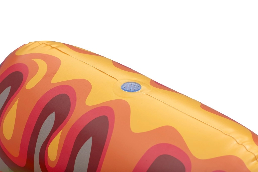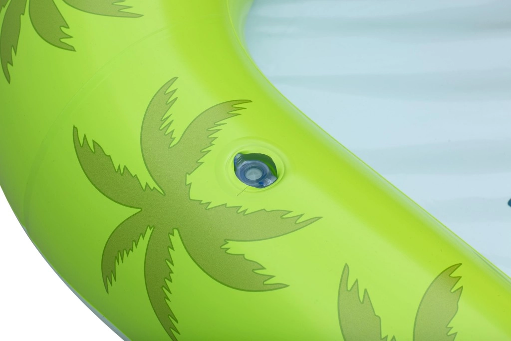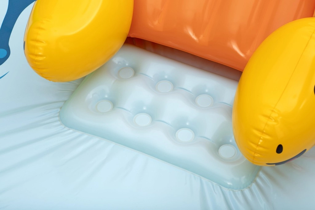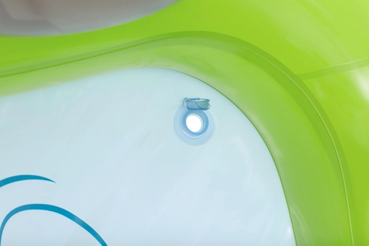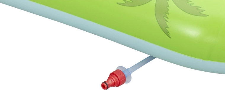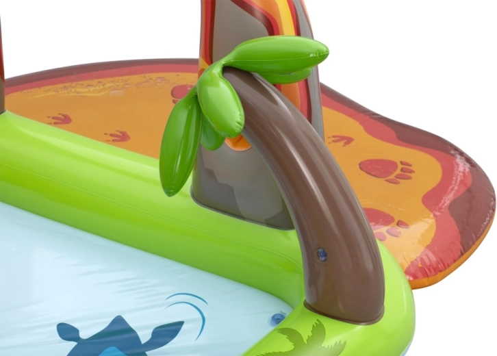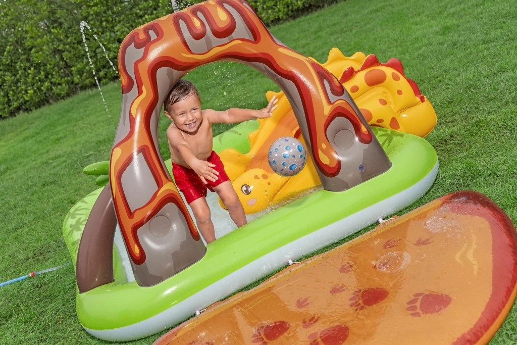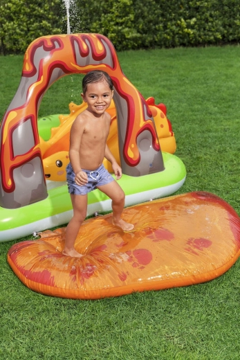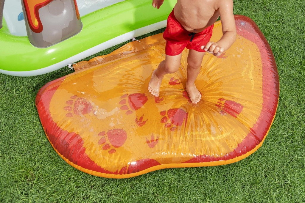 Centru de joacă gonflabil cu dinozauri, ideal pentru distracția activă de vară a copiilor de la 2 ani. Băltoaca verde cu imprimeu de palmieri și fund albastru are o capacitate de aprox. 150 l de apă, iar covorașul cu apă separat, cu motiv de lavă, adaugă încă 80 l pentru aterizare moale și călcat jucăuș. Pulverizatorul integrat pe arcul vulcanic se conectează simplu la furtunul de grădină și creează în câteva clipe o dușmă plăcută de răcorire.