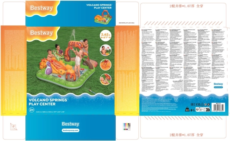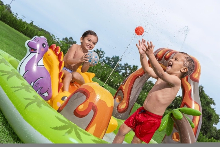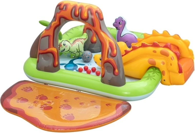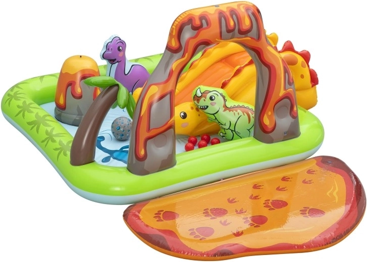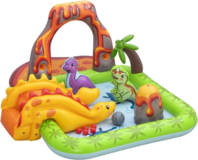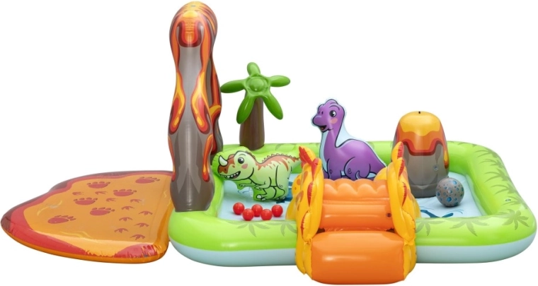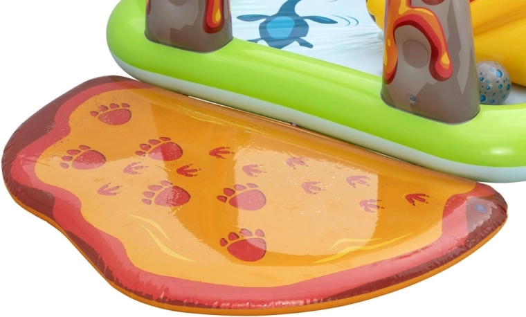 Setul include dinozaurul galben cu tobogan, dinozaur verde și mov gonflabili ca figurine de joacă, o deschidere în „vulcan” pentru aruncarea mingiuțelor și o pernuță moale de aterizare pentru o sosire sigură. Datorită vinilului de calitate, cusăturilor netede și marginilor rotunjite, joaca este confortabilă și sigură. Umflare rapidă, golire ușoară și o piesă de peticire inclusă pentru întreținere și depozitare facile.