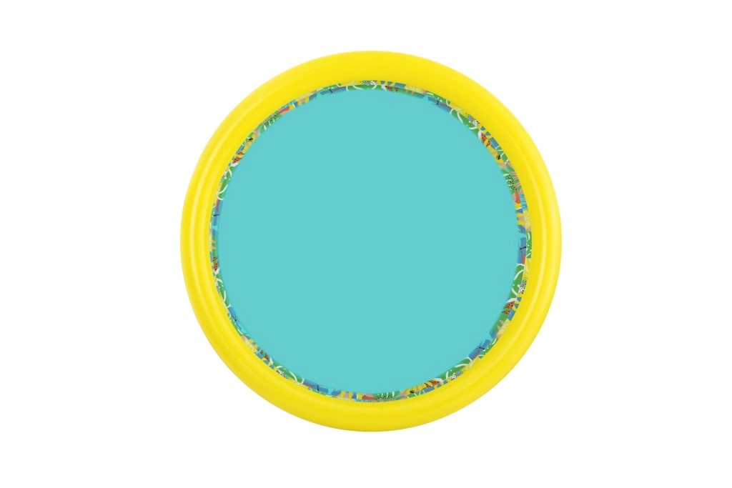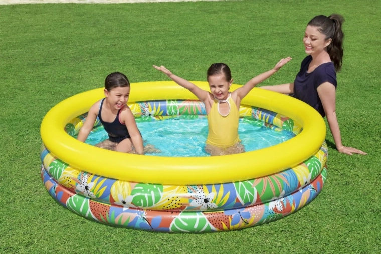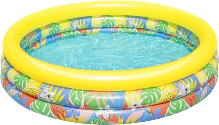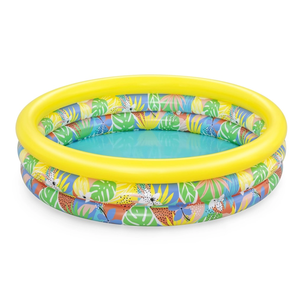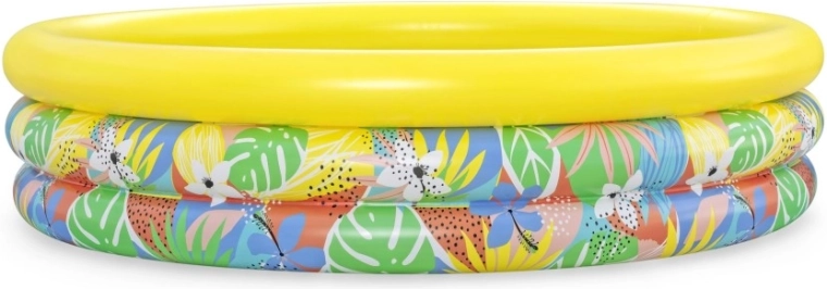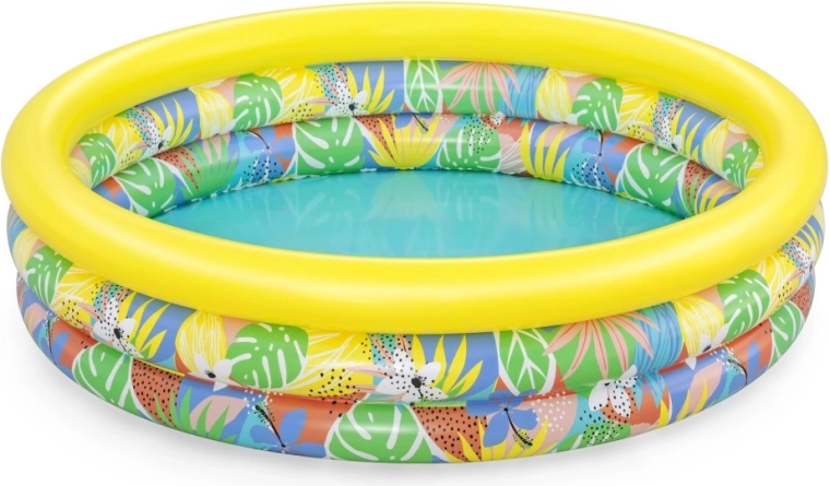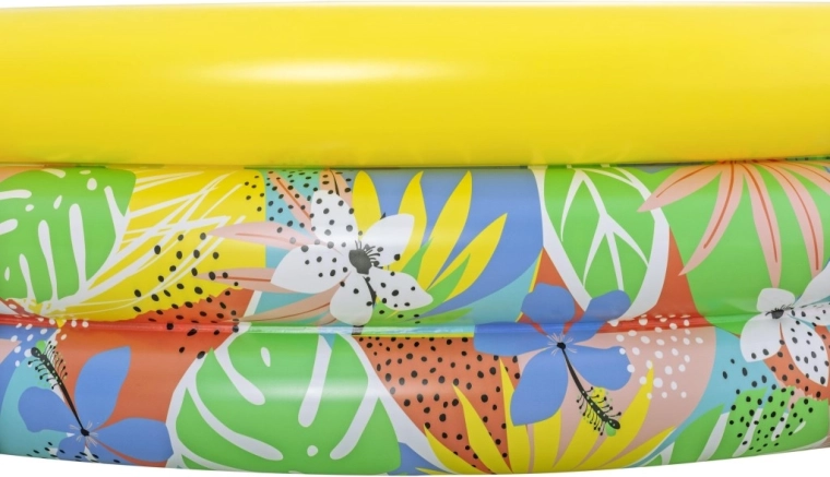 Piscina gonflabilă pentru copii Floral Paradise aduce celor mici distracție și răcorire în zilele toride. Trei camere de aer separate, cu valve de siguranță, sporesc stabilitatea și confortul, în timp ce PVC-ul robust rezistă utilizării zilnice. Imprimeul tropical cu frunze și flori, împreună cu inelul superior galben, aduce în grădina ta o atmosferă de vacanță.