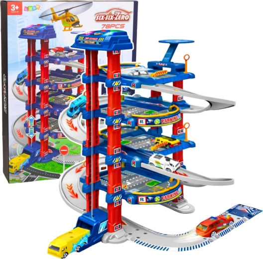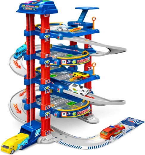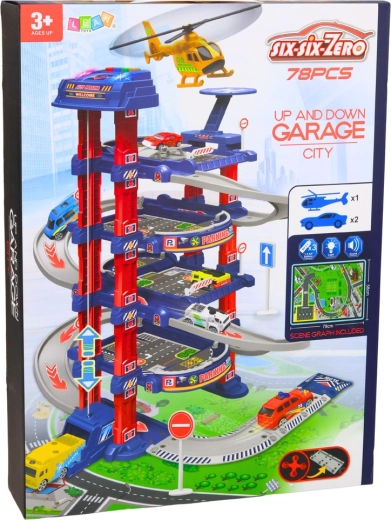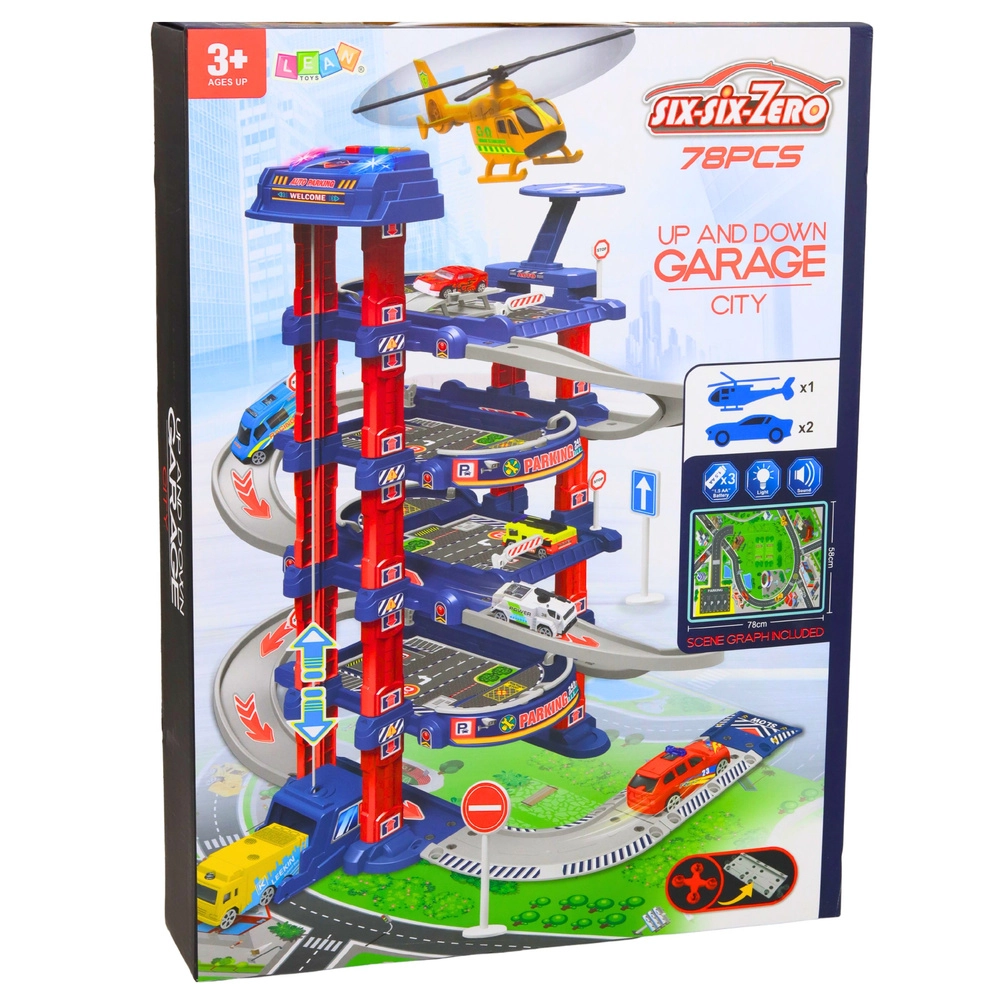 Marea parcare pentru copii este concepută pentru micii iubitori de mașinuțe și trafic urban. Liftul electric ridică ușor mașinuțele la etajele superioare, de unde pot coborî în viteză pe pista de coborâre. Setul include și platformă de aterizare pentru elicopter, indicatoare rutiere și o saltea de joacă pentru podea, care creează un mediu urban realist.