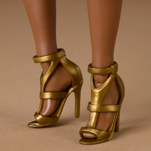 Stilul este conceput în tonuri neutre și atemporale cu accente aurii – rochia aurie strălucitoare este completată de un machiaj discret și detalii rafinate. Păpușa este compatibilă cu accesoriile BARBIE și se potrivește perfect pentru ținute creative și mixuri de stil.