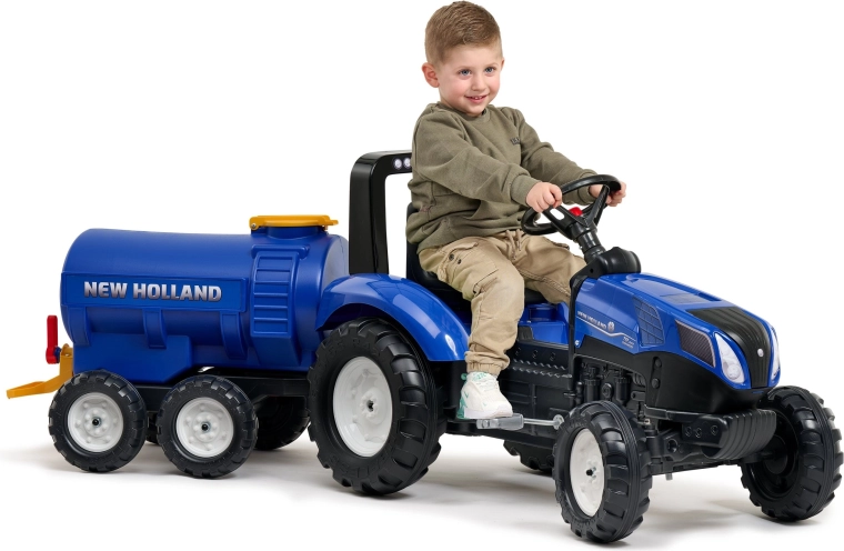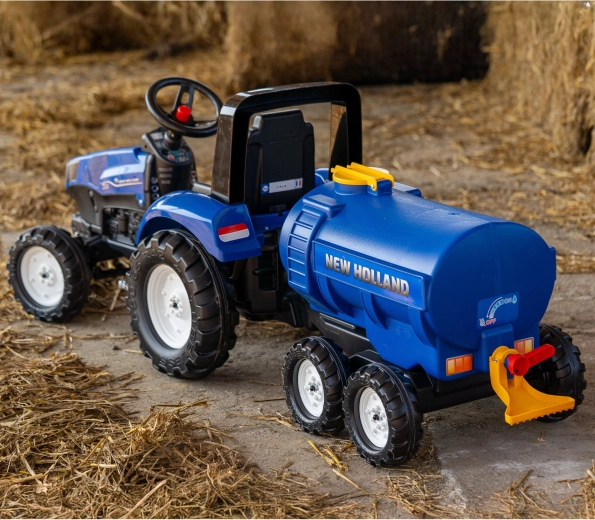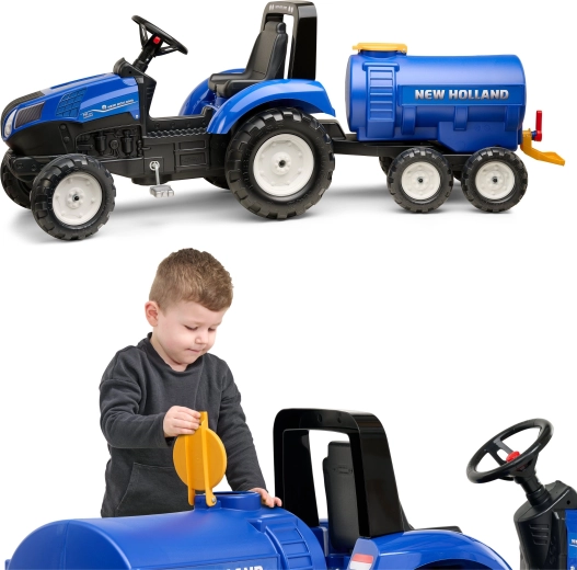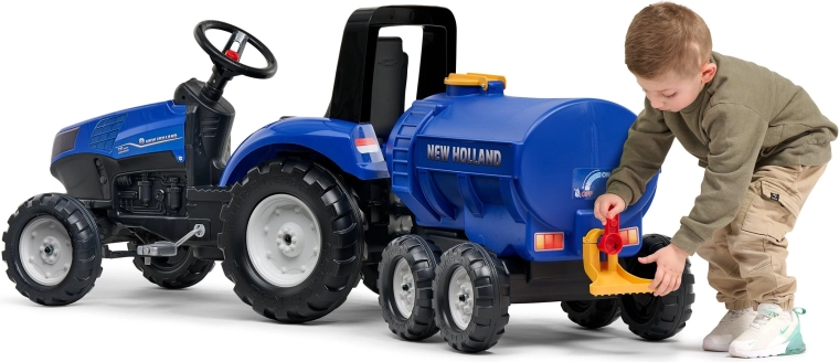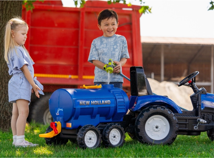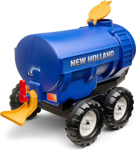 Extindeți tractorul pentru copii cu o remorcă-cisternă realistă licențiată NEW HOLLAND. Căruciorul cu două osii oferă un rezervor mare de apă, robinet/aspersor funcțional, capac superior rabatabil și patru roți stabile pentru joacă în siguranță în grădină. Fabricat în Franța din plastic rezistent.
