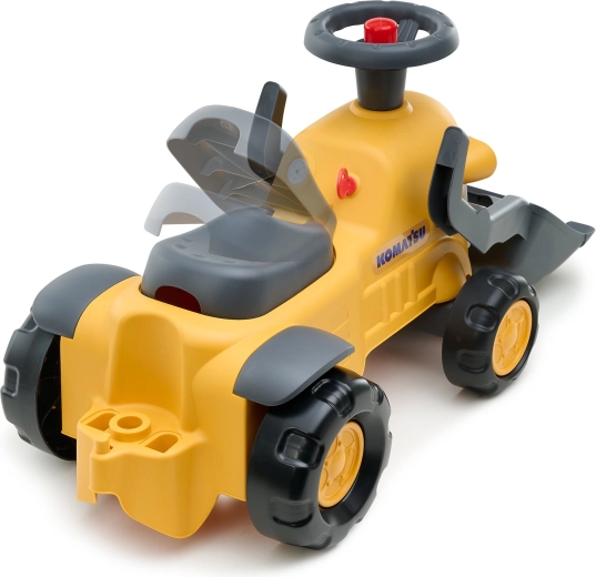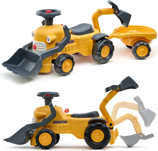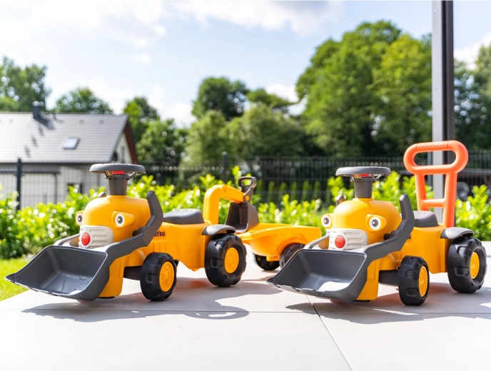 Micul tractor KOMATSU de la FALK îi va încânta pe toți micii constructori. Datorită cupeii frontale funcționale și excavatorului spate, copiii pot încărca, muta și descărca nisip sau cuburi. Remorca detașabilă extinde jocul cu transportul încărcăturii, în timp ce volanul rotativ cu claxon și cheia de pornire cu clic stimulează percepția și interacțiunea.