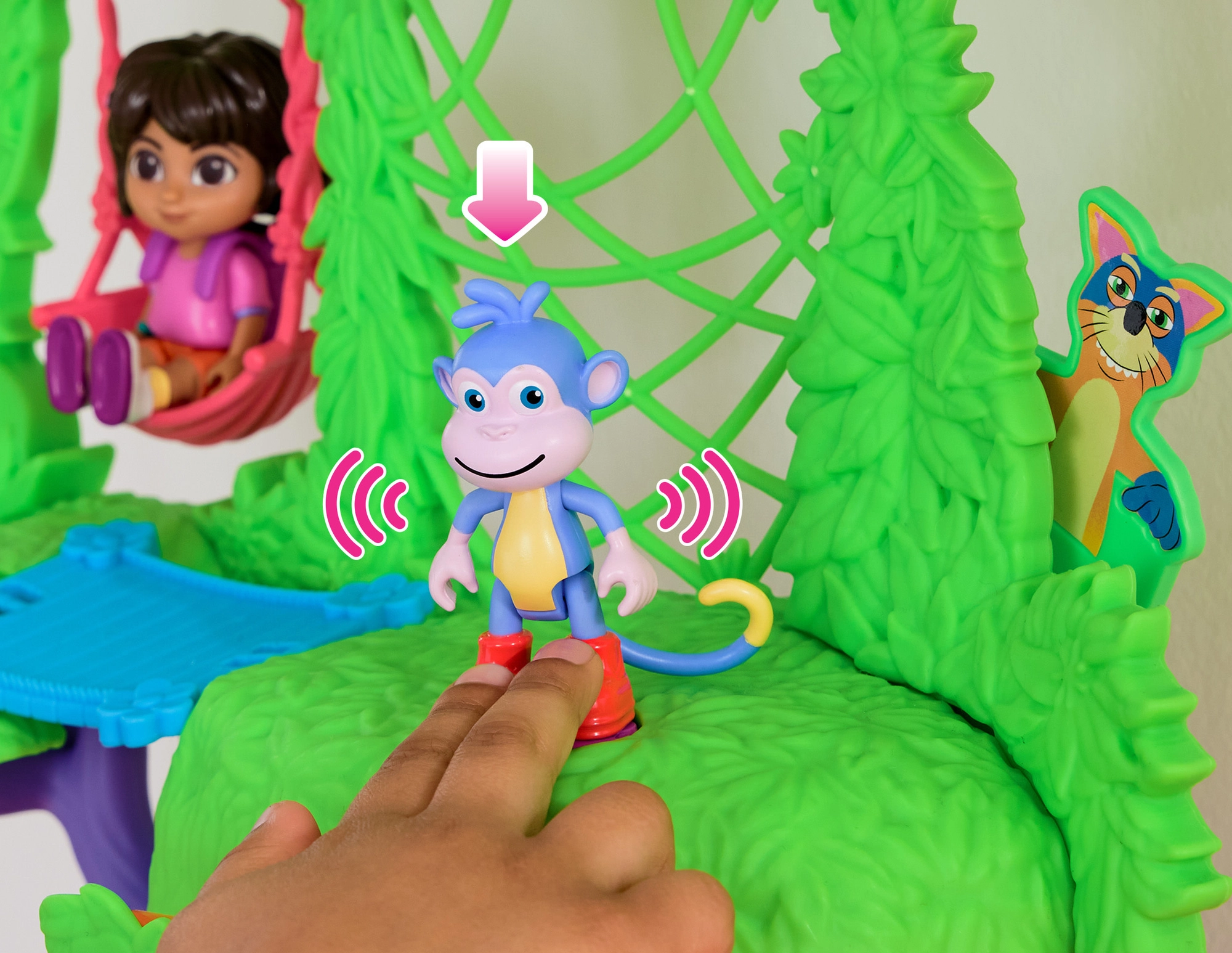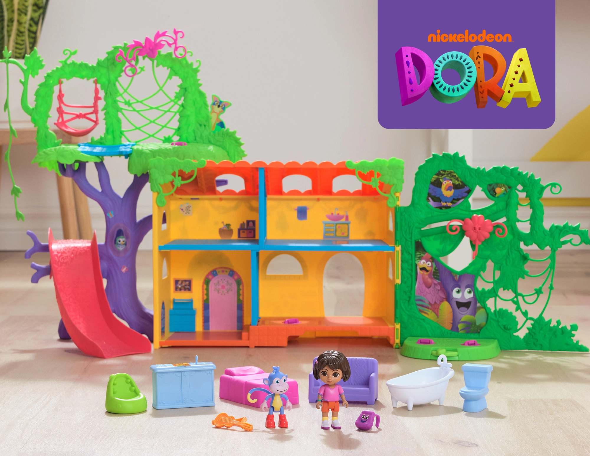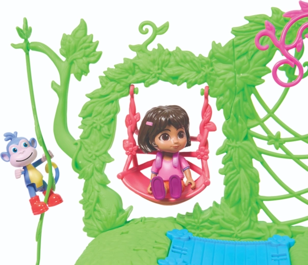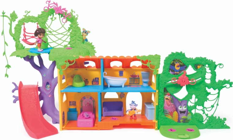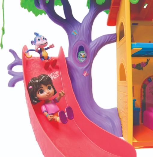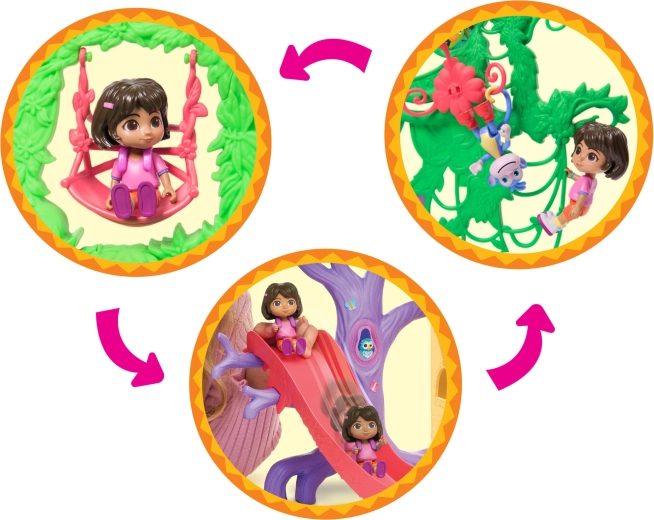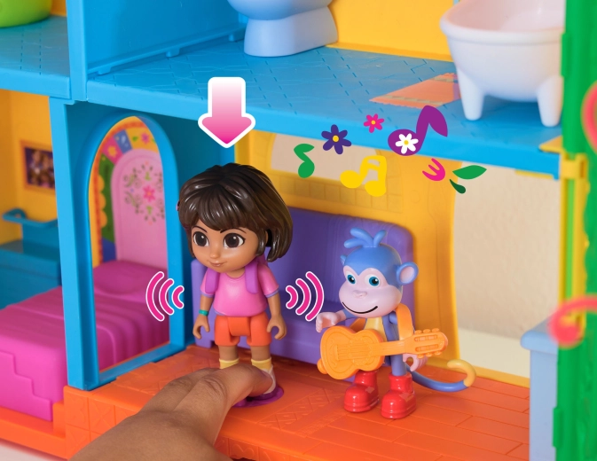 Intră în căsuța colorată din junglă inspirată de serialul Dora Exploratoarea și pornește în aventură. Interiorul oferă mai multe camere detaliate cu mobilier (de ex. canapea, cadă), în timp ce exteriorul abundă în atracții în coroanele copacilor. Printr-o simplă apăsare a butonului din camera de zi pornești efecte sonore și muzică, care susțin învățarea interactivă și distracția.