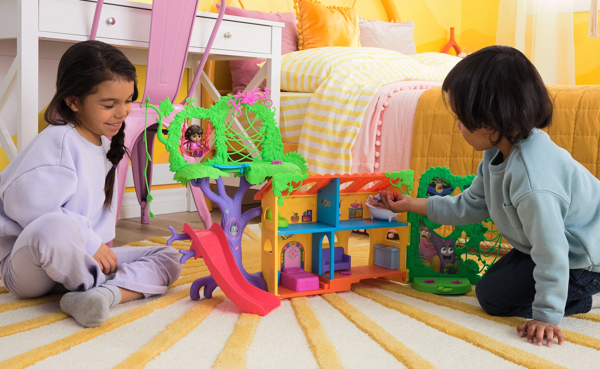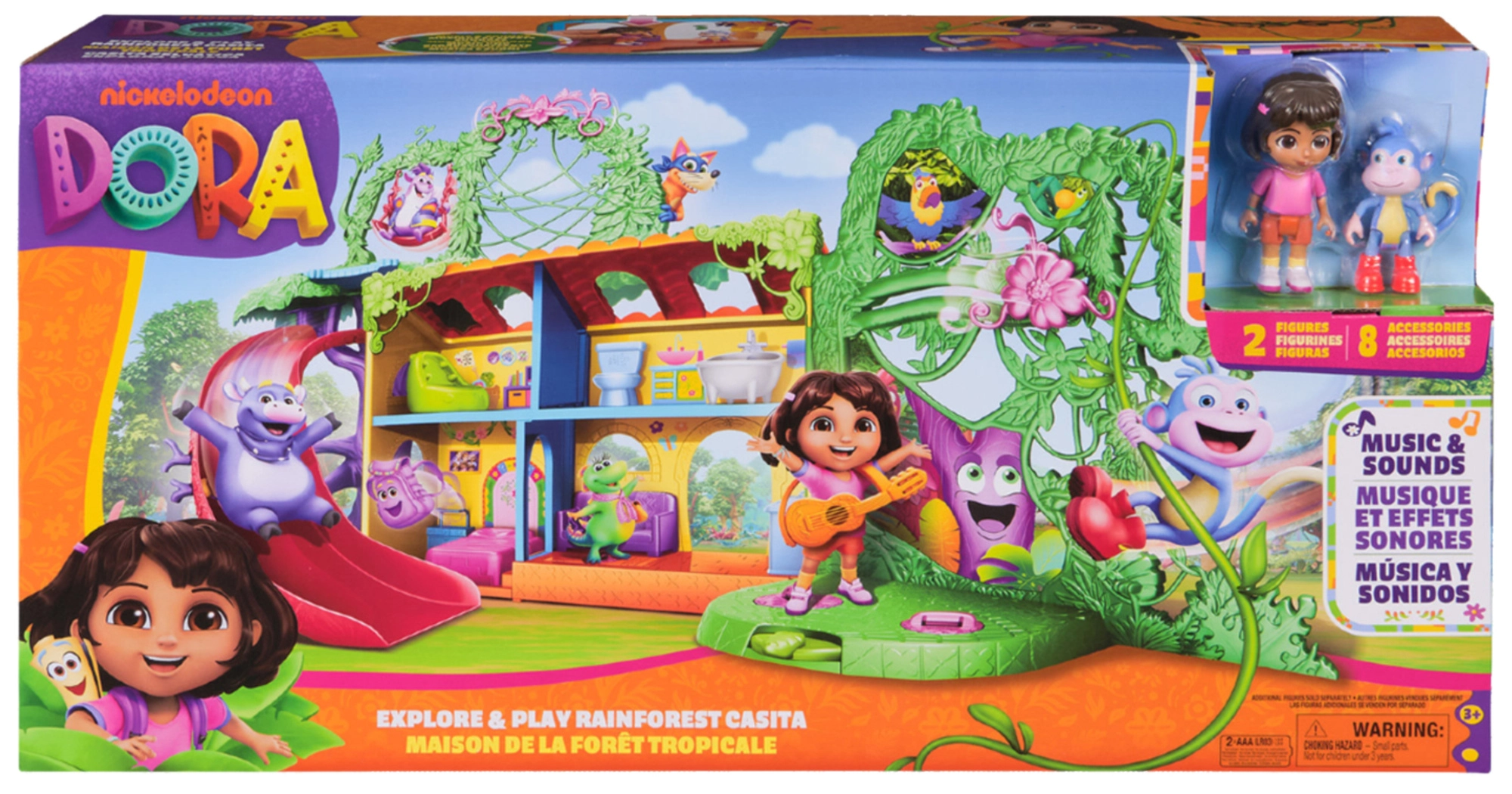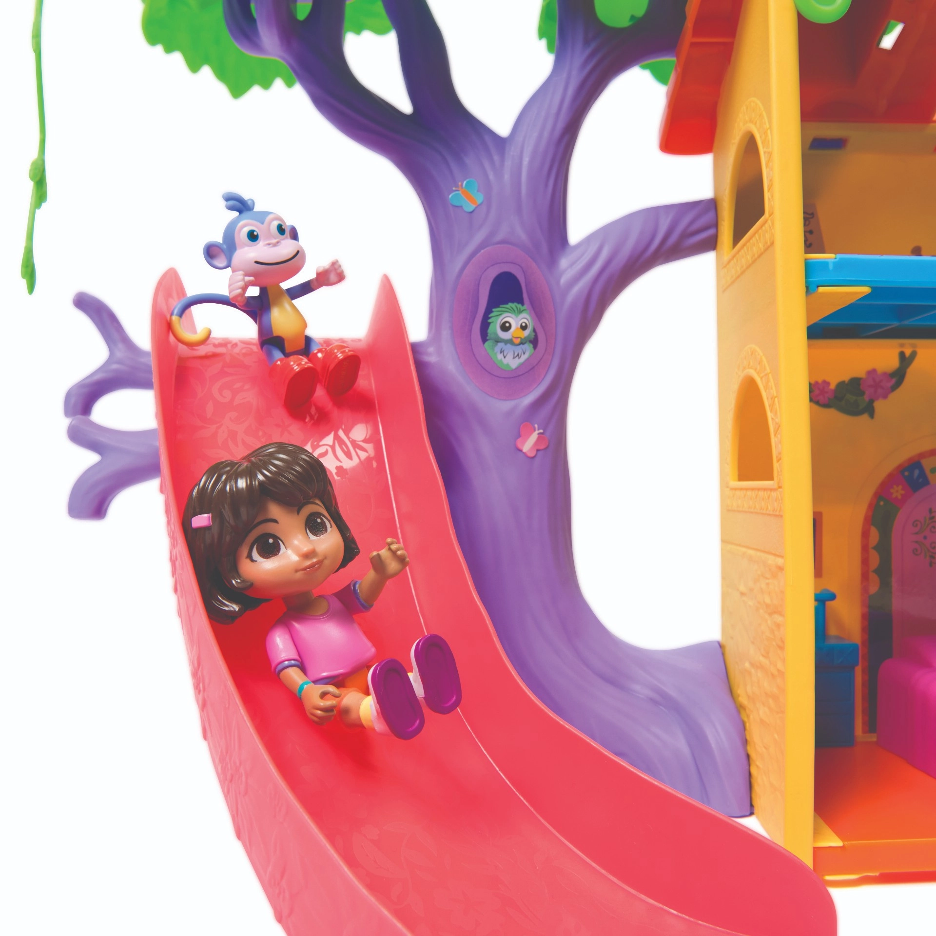 Intră în căsuța colorată din junglă inspirată de serialul Dora Exploratoarea și pornește în aventură. Interiorul oferă mai multe camere detaliate cu mobilier (de ex. canapea, cadă), în timp ce exteriorul abundă în atracții în coroanele copacilor. Printr-o simplă apăsare a butonului din camera de zi pornești efecte sonore și muzică, care susțin învățarea interactivă și distracția.