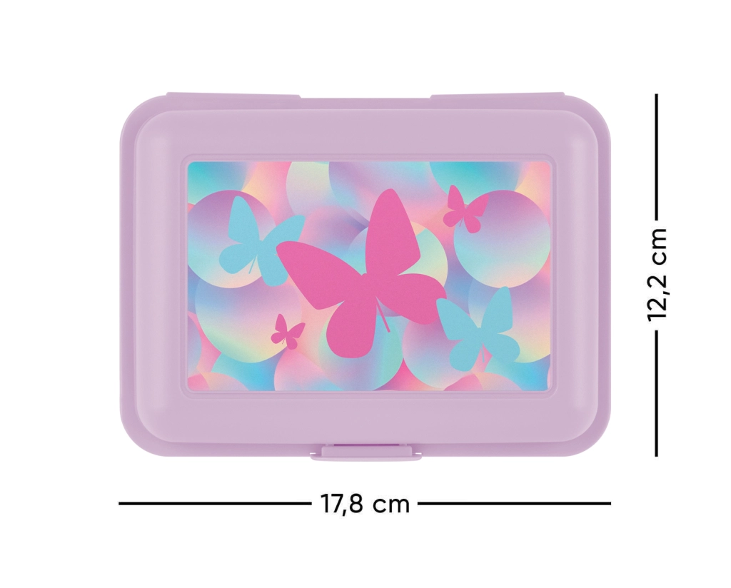Separatorul interior permite separarea fructelor, produselor de panificație sau legumelor, astfel încât diferitele părți ale gustării să nu se amestece. Cutia este ușoară, compactă și încape cu ușurință în ghiozdan sau rucsac.