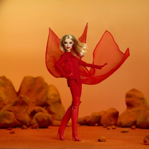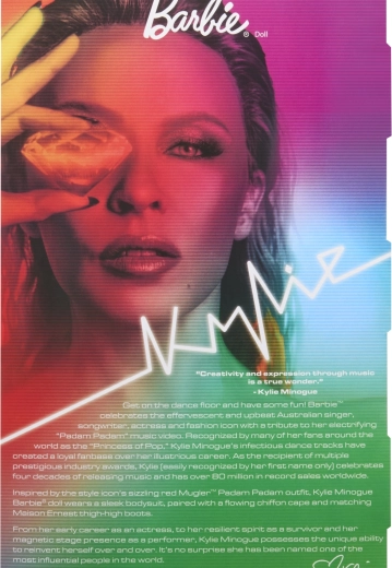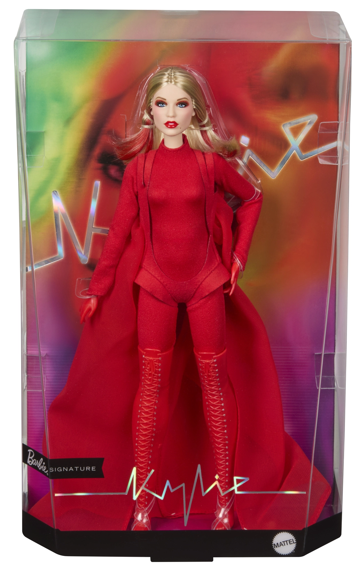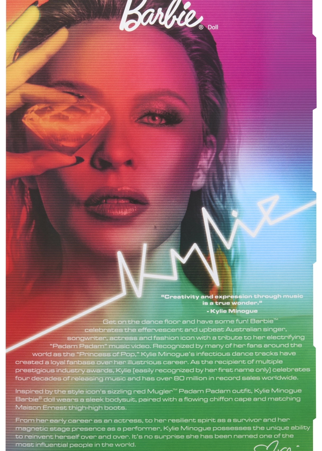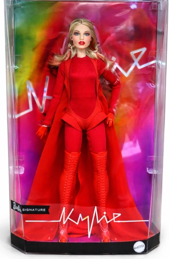 Această ediție de colecție Barbie aduce un omagiu femeilor inspiraționale din seria Role Models. Păpușa o înfățișează pe Kylie Minogue într-o stilizare roșie dramatică, inspirată de un videoclip muzical, cu păr blond lung și discrete șuvițe roșii, ochi albaștri și machiaj precis pentru un look autentic de scenă.