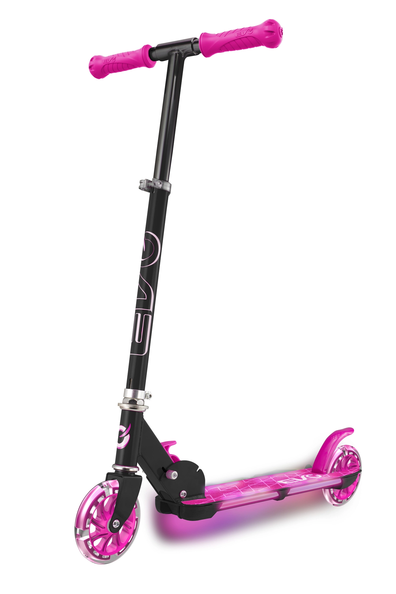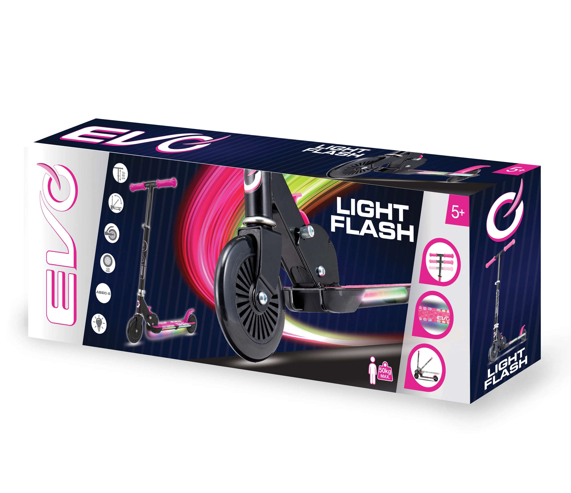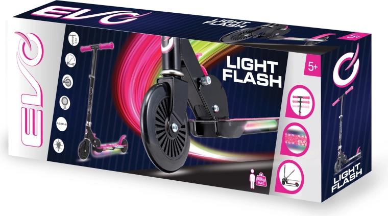 Trotineta EVO Light Flash este o alegere excelentă pentru copiii activi. Datorită cadrului ușor și pliabil, se transportă și se depozitează cu ușurință, înălțimea ghidonului reglabilă (cca 67–77 cm) crește împreună cu copilul, iar platforma LED transformă fiecare plimbare într-un spectacol distractiv. Roțile din cauciuc cu rulmenți ABEC-5 sunt concepute pentru o deplasare confortabilă și silențioasă pe suprafețe drepte.