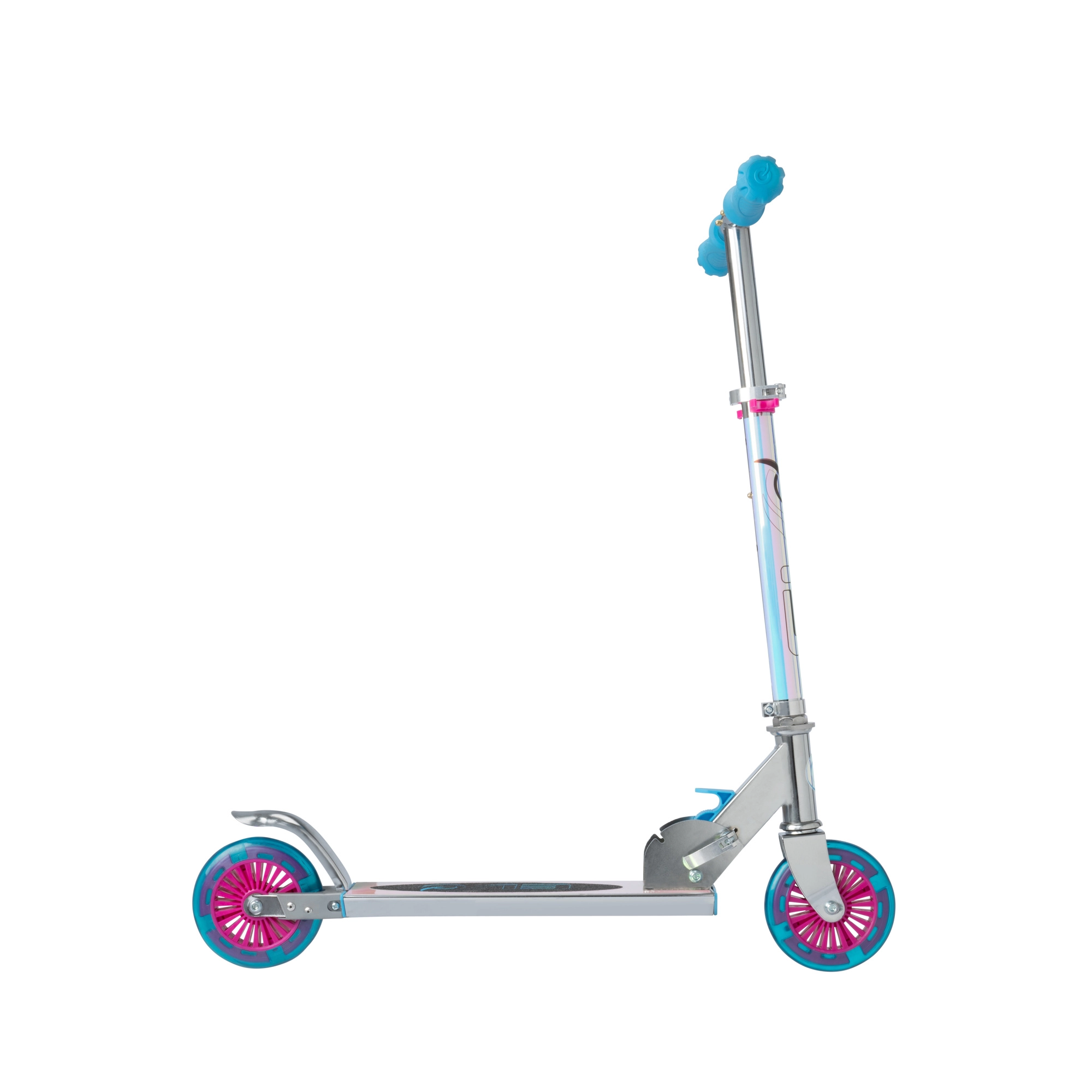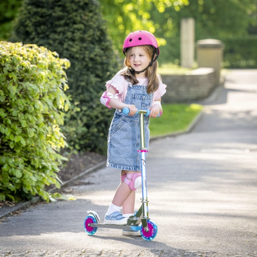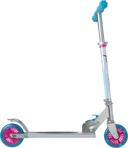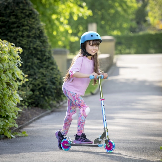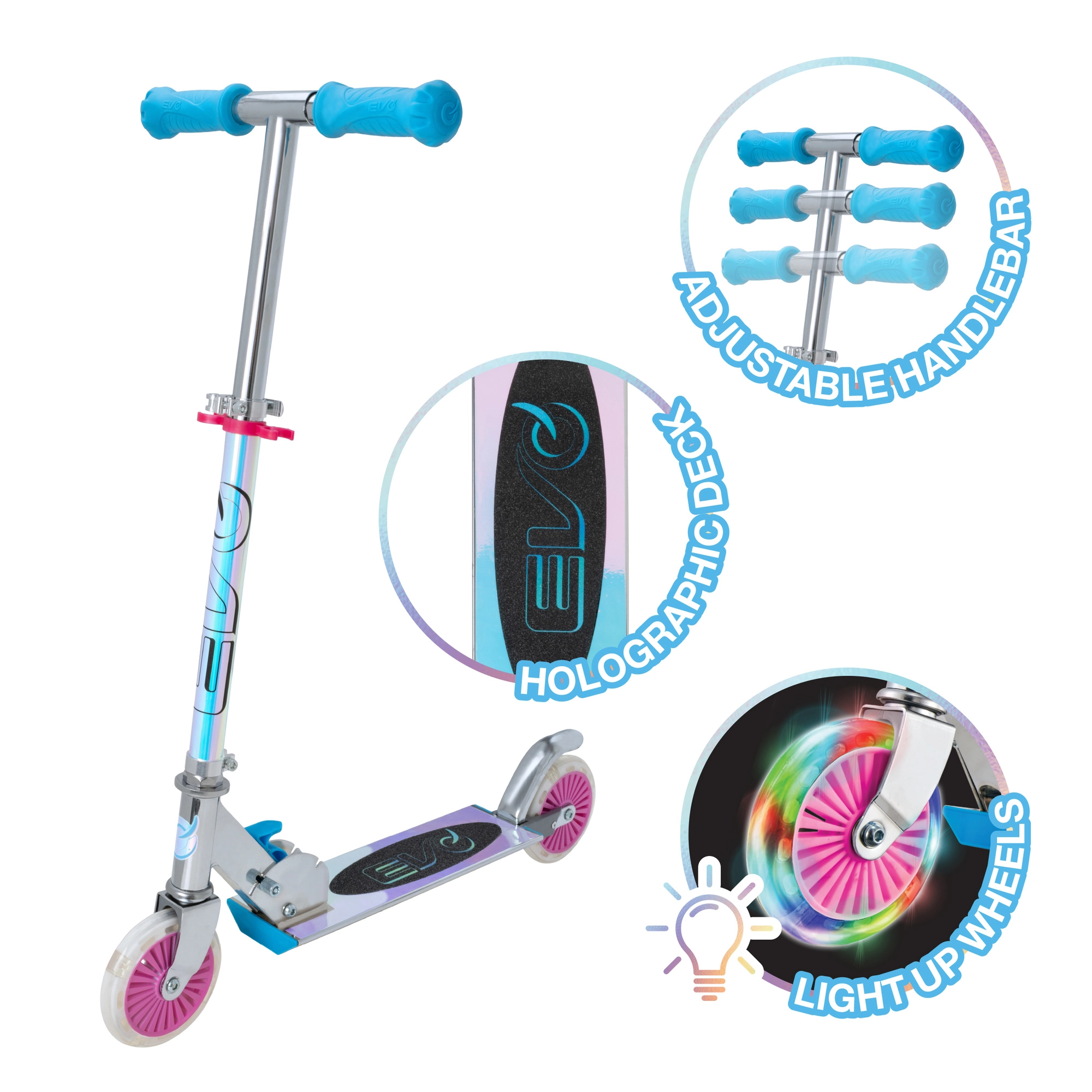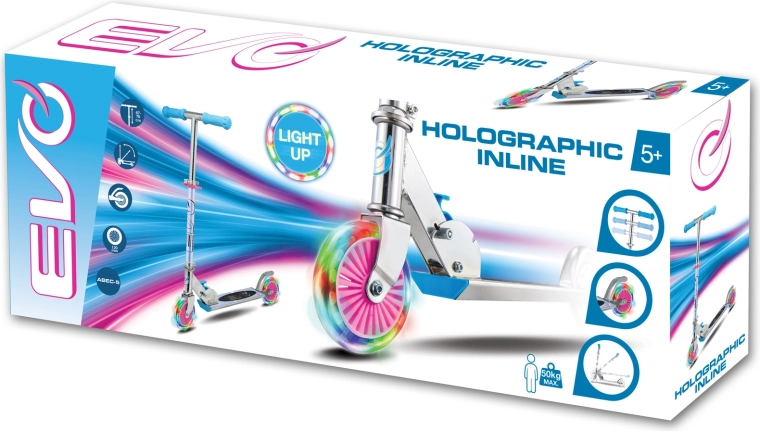 Trotineta EVO Holographic Inline îmbină distracția cu siguranța. Datorită roților LED luminoase, fiecare plimbare devine atractivă, în timp ce înălțimea reglabilă a ghidonului (aprox. 67–77 cm) permite adaptarea comodă la creșterea copilului. Construcția pliabilă facilitează transportul și depozitarea acasă sau în portbagajul mașinii.