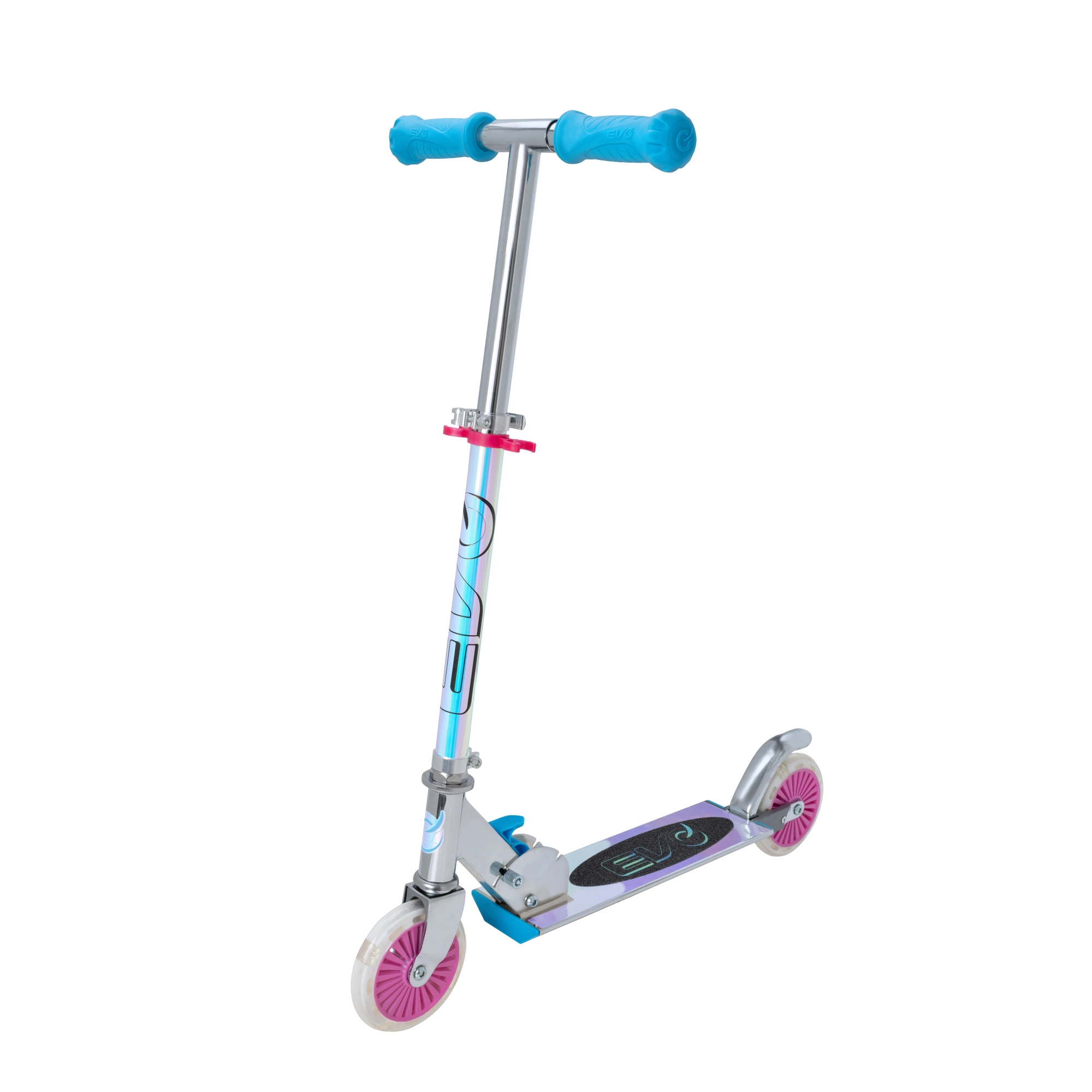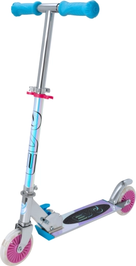 Trotinetă pentru copii EVO, ușoară și rezistentă, cu roți LED luminoase, cadru pliabil și ghidon reglabil pentru copii de la 5 ani. Oferă o deplasare lină datorită rulmenților ABEC-5, frână spate acționată la apăsare pentru oprire în siguranță și capacitate maximă 50 kg. O alegere excelentă pentru distracție în parc și pe trotuar.