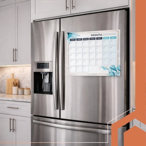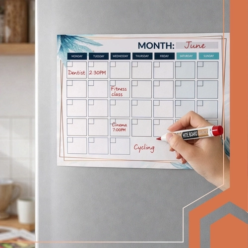Suprafața ștergătoare la uscat permite scriere și ștergere repetată fără murdărie. Partea din spate magnetică puternică asigură fixare stabilă pe frigider sau pe alte suprafețe metalice. Practica secțiune pentru note păstrează informațiile importante la îndemână, iar marker-ele colorate evidențiază prioritățile.