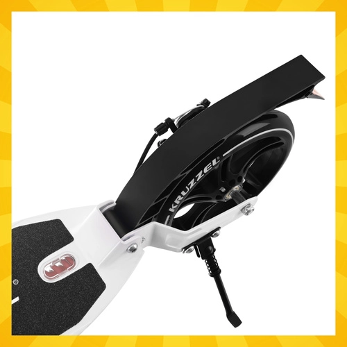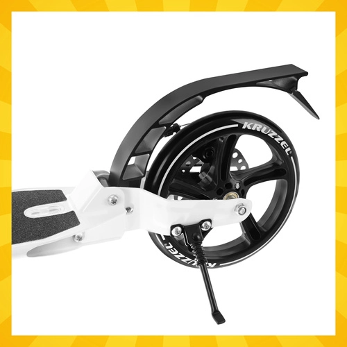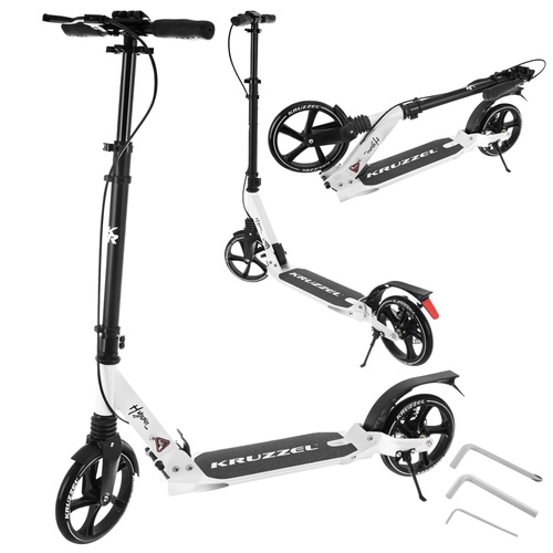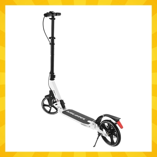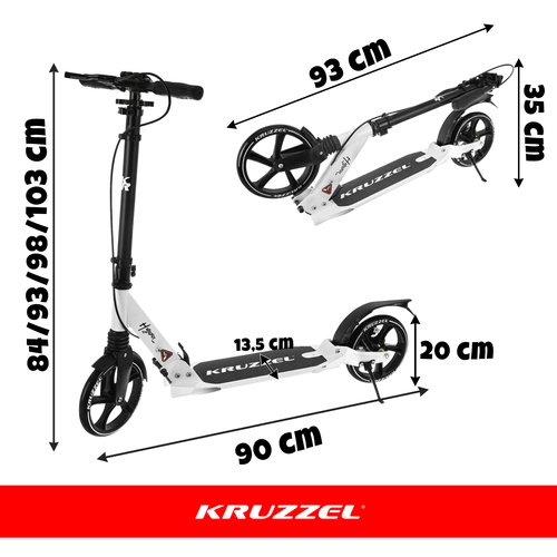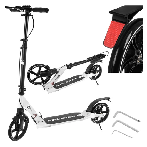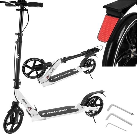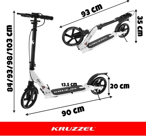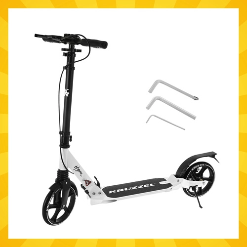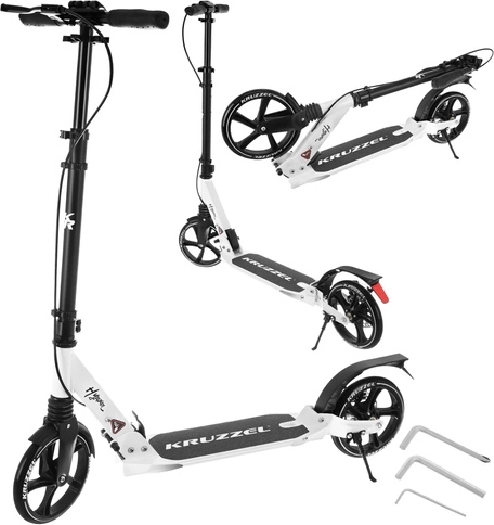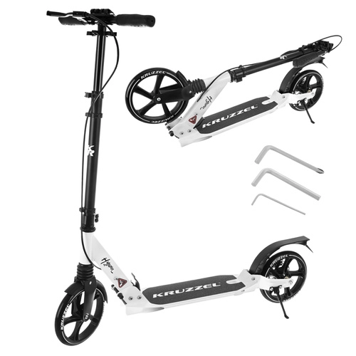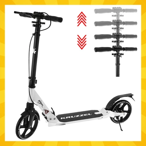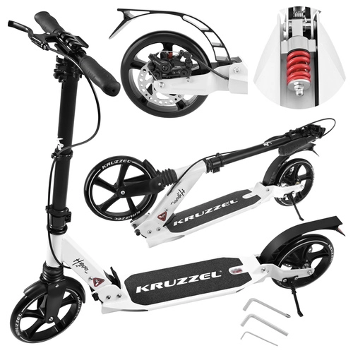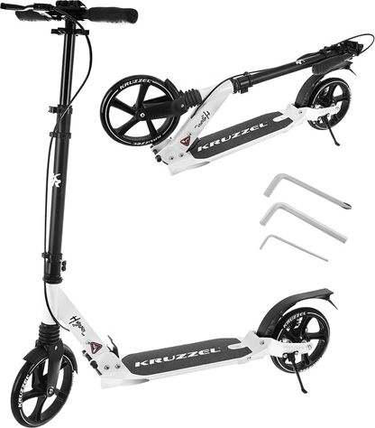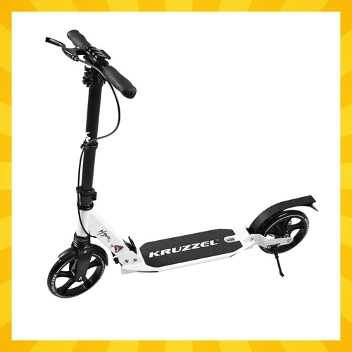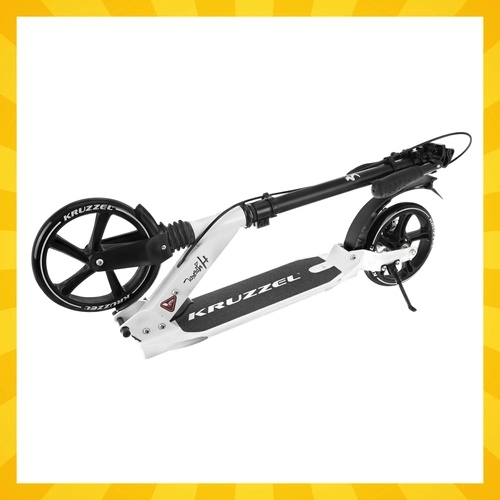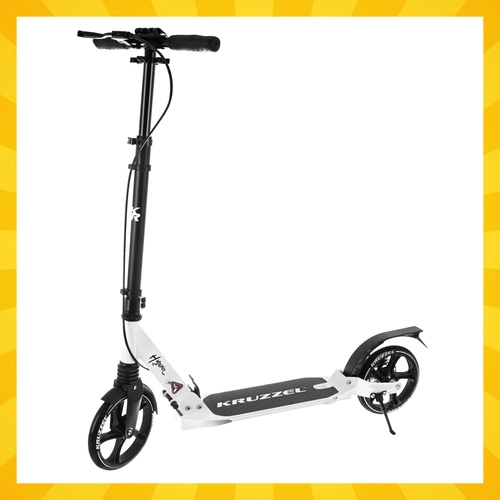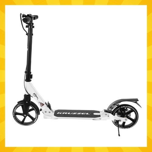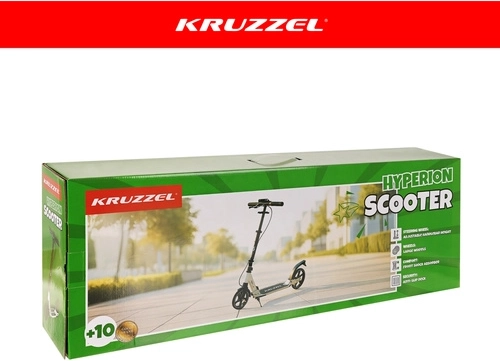 Trotineta pliabilă premium KRUZZEL Hyperion pentru copii și adulți oferă roți mari de 200 mm din cauciuc, rulmenți ABEC-9, sistem de frânare dublu (de mână și de picior) și cadru ușor din aluminiu. Datorită pliei rapide, suspensiei și ghidonului reglabil pe înălțime, este ideală pentru navetă confortabilă și sigură pe trotuare și piste de biciclete.