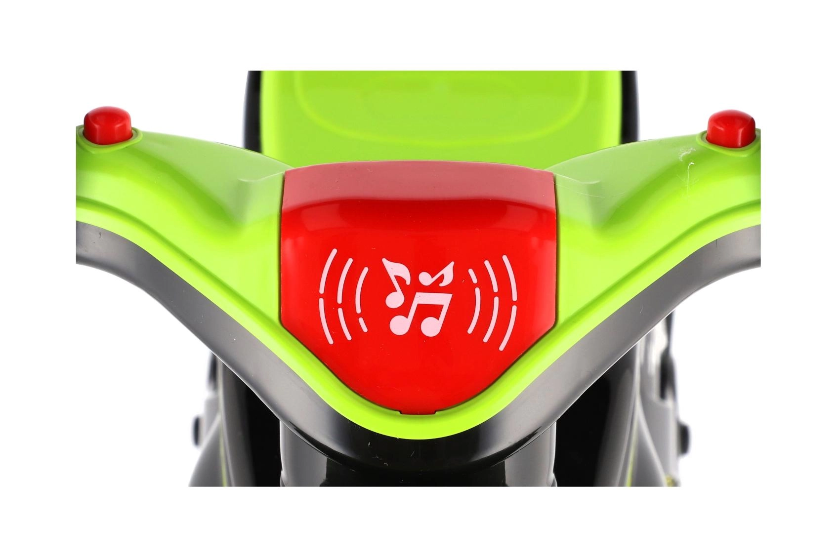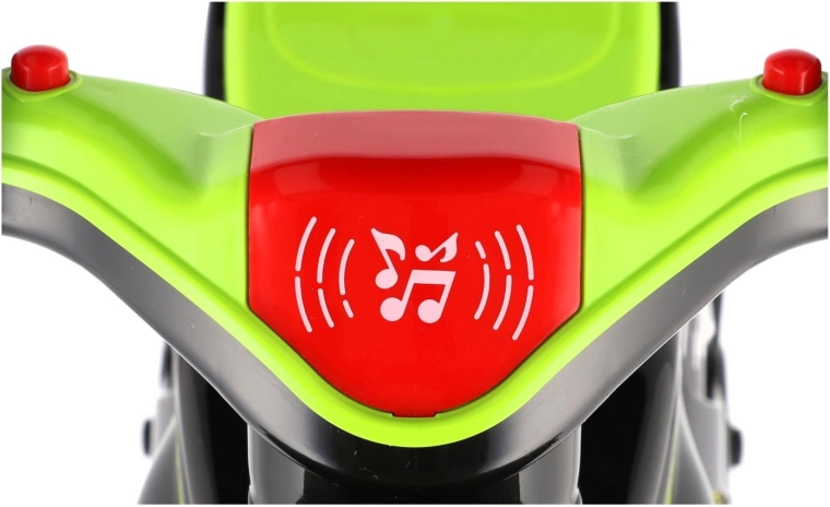 Vehiculul este echipat cu efecte luminoase și sonore, care transformă plimbarea într-o experiență captivantă. Execuția modernă verde‑negru cu decorațiuni sportive atractive arată ca o adevărată motocicletă de curse și îi motivează pe copii la mișcare activă.