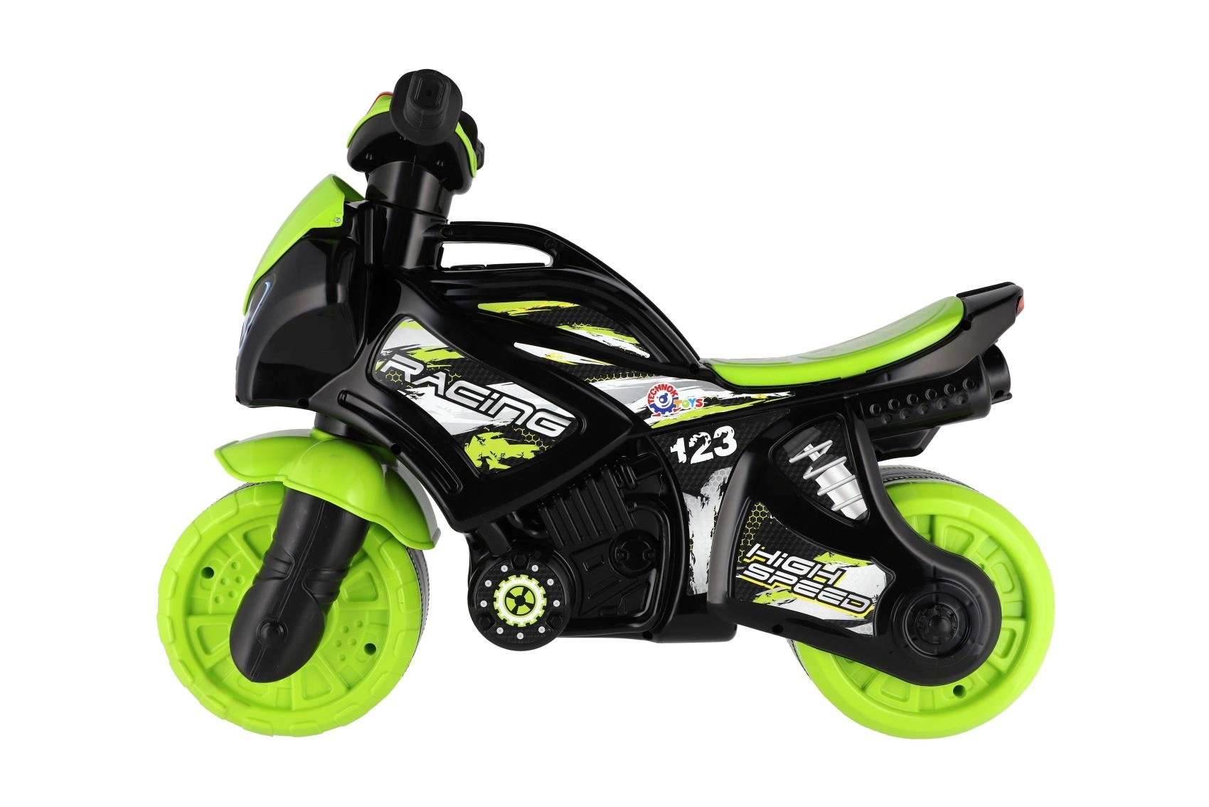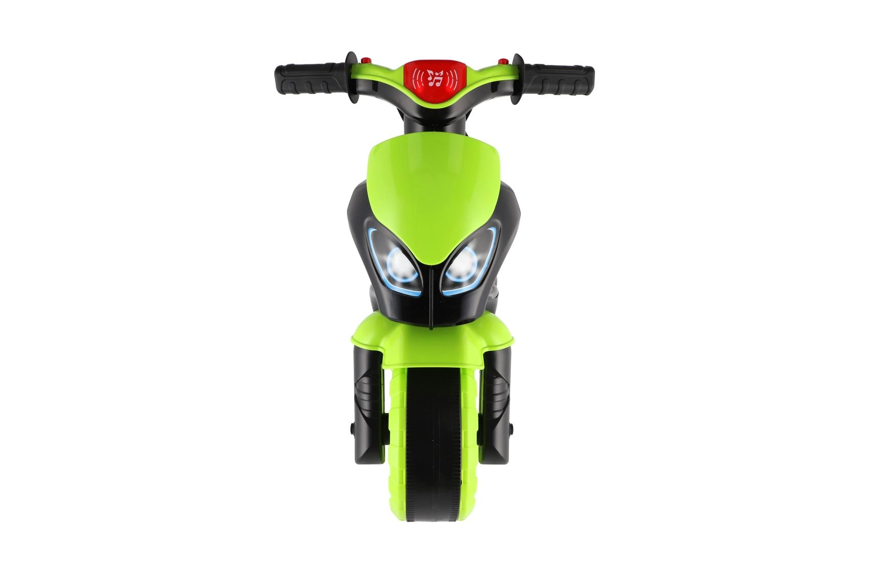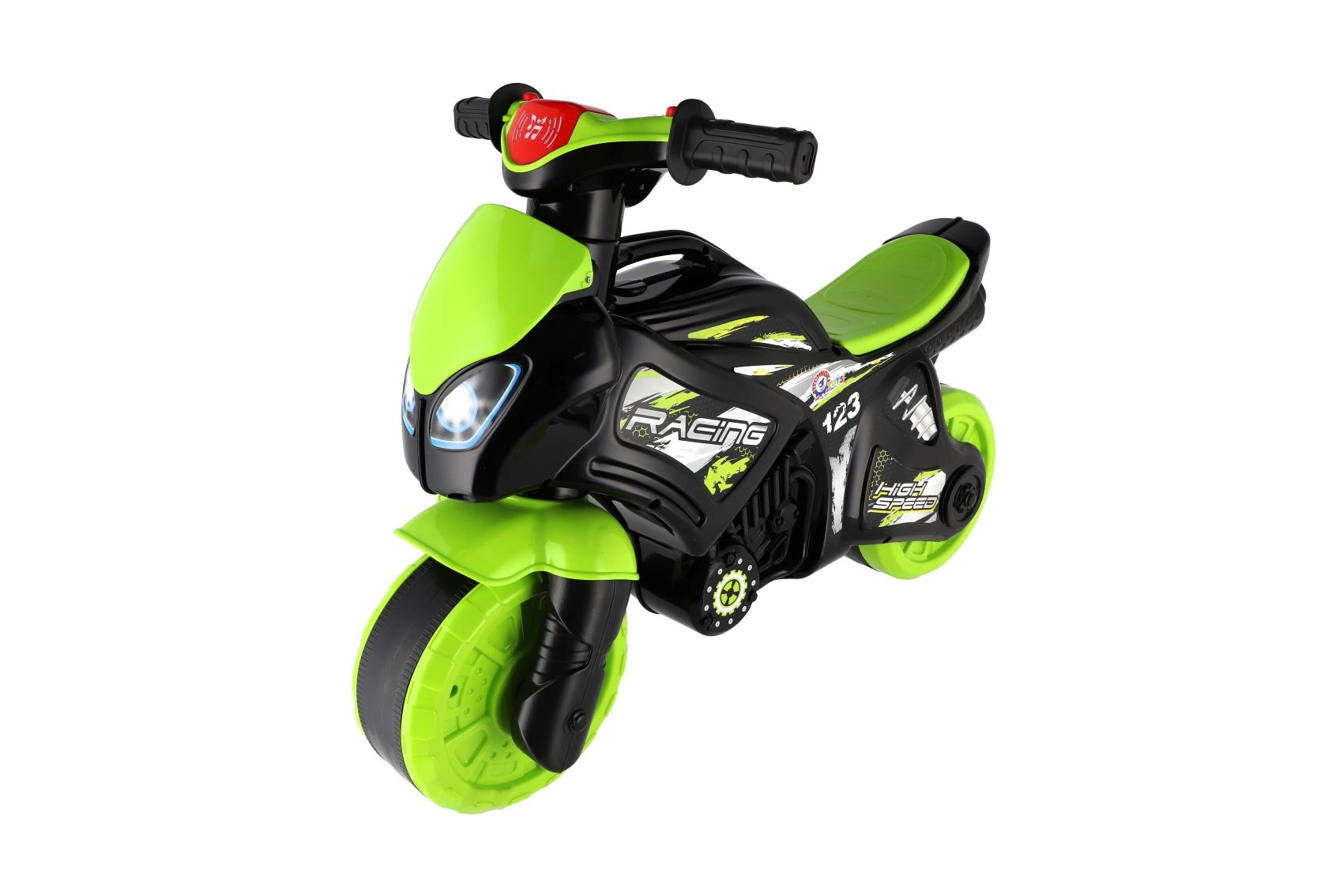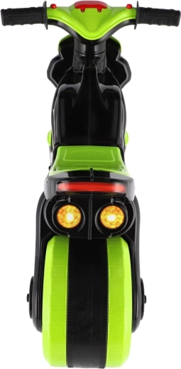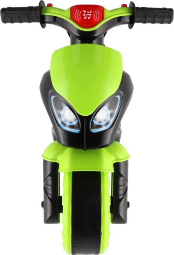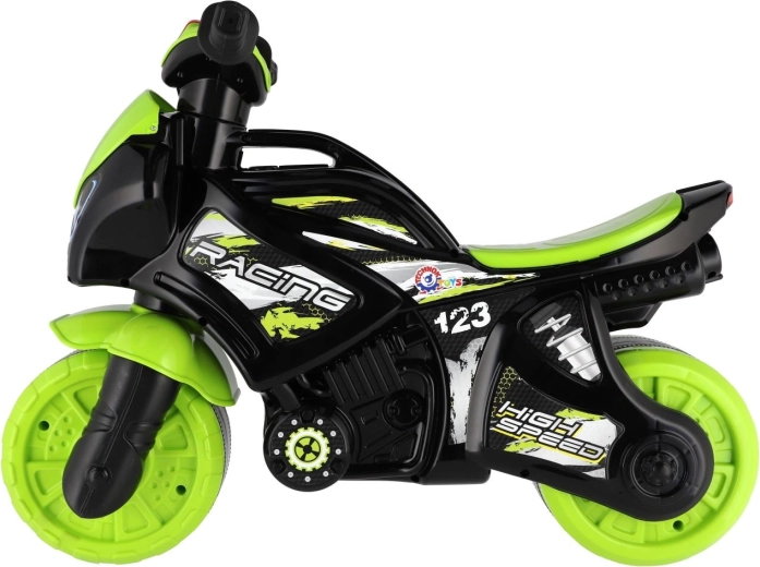 Bicicleta de împins pentru copii, în formă de motocicletă de curse, îi va încânta pe toți micii piloți. Are roți late pentru stabilitate, șea ergonomică și ghidon ușor de prins. Designul modern verde‑negru cu autocolante sport oferă un aspect realist, iar efectele luminoase și sonore fac plimbarea și mai distractivă.