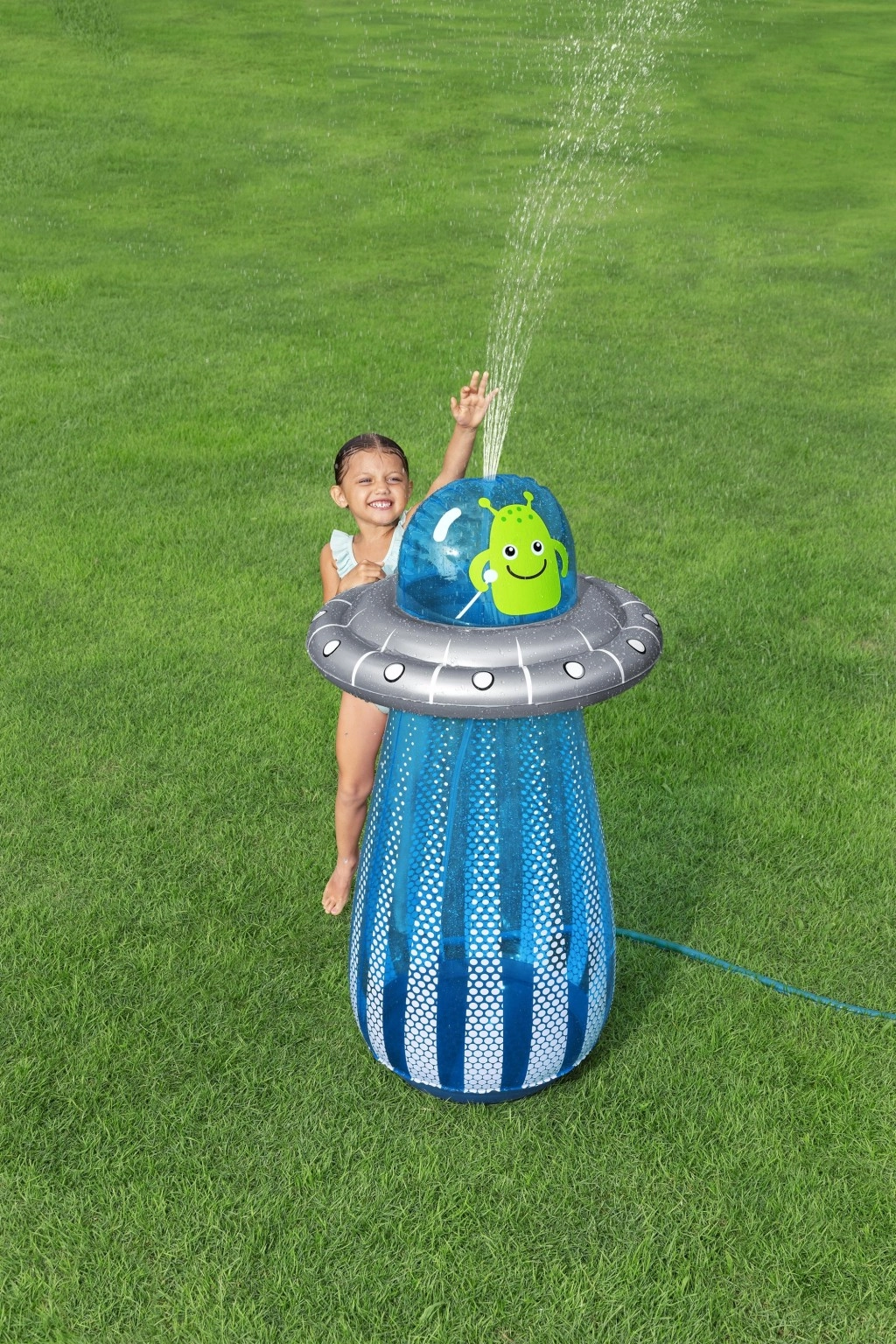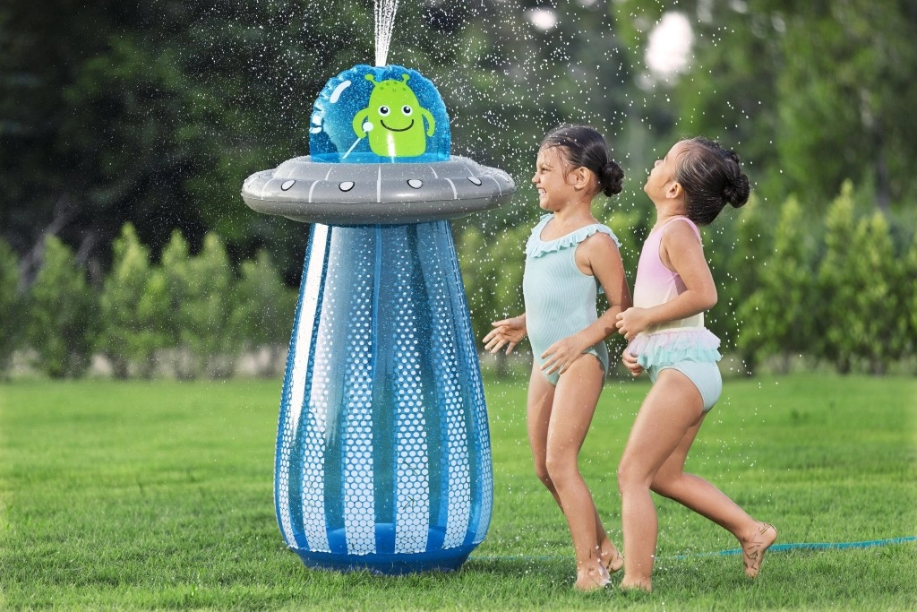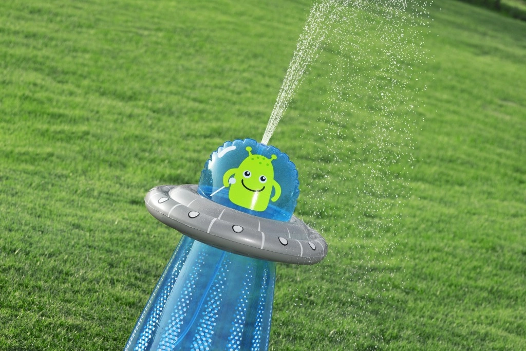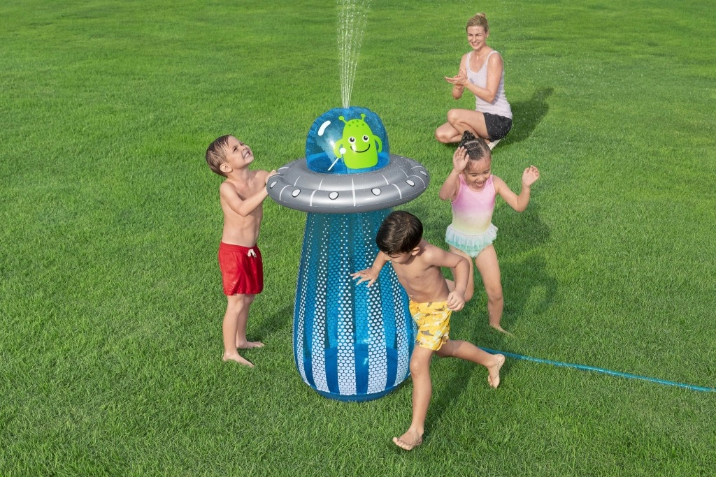 După conectarea la un furtun de grădină standard, din partea superioară a UFO-ului pornește un stropitor răcoritor, care creează o fântână jucăușă pentru copii.