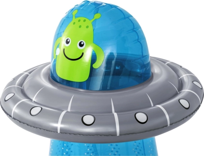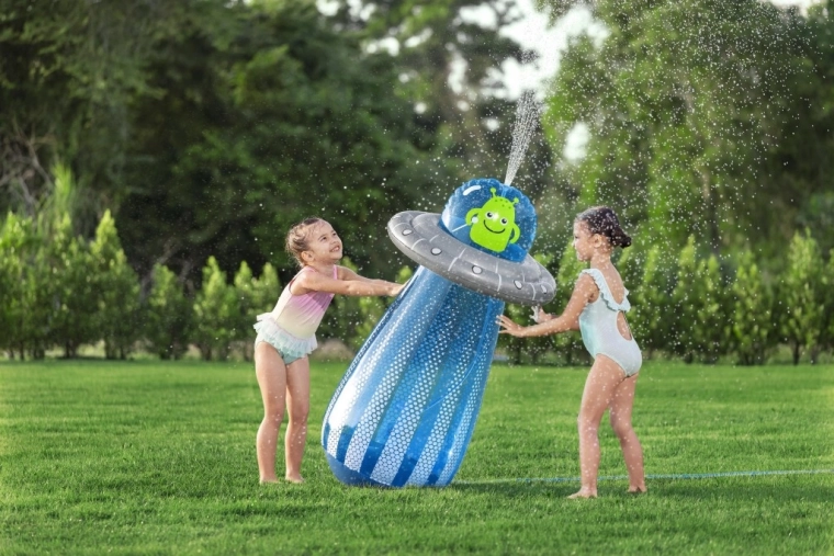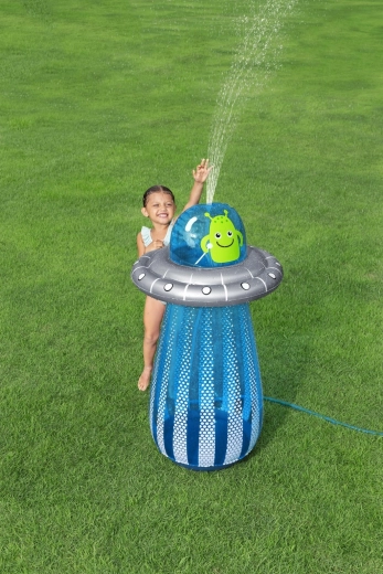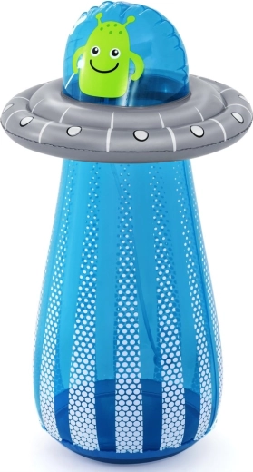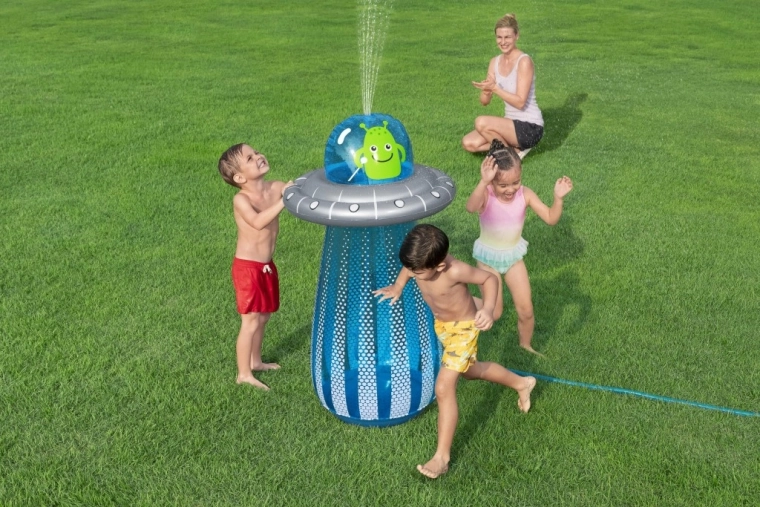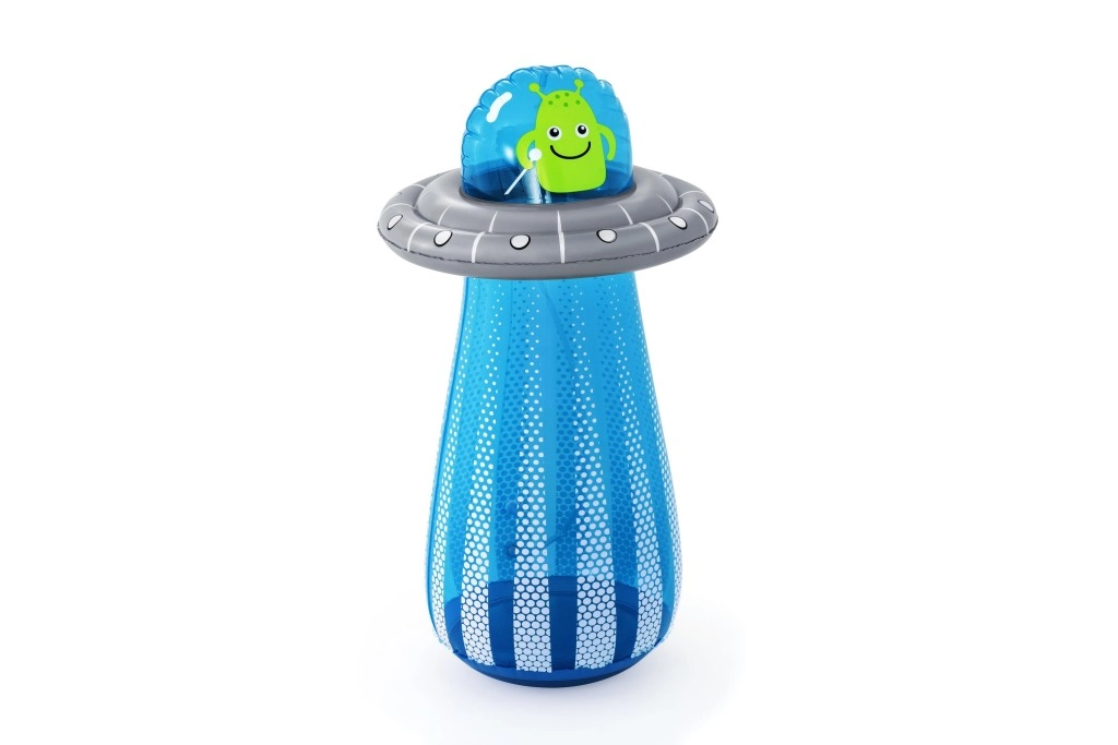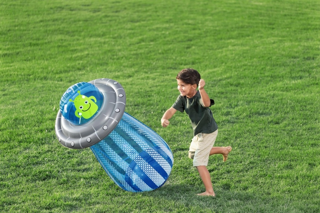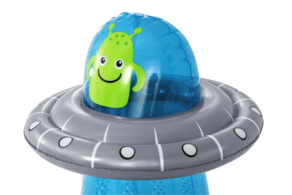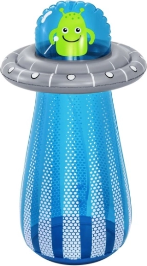 UFO-ul gonflabil cu un extraterestru prietenos aduce copiilor mișcare activă și răcorire cu apă într-un singur produs. După conectarea furtunului, din partea superioară pornește o fântână de apă, care transformă grădina într-un loc de joacă estival plin de voie bună. Datorită camerei de apă integrate în partea de jos, jucăria este stabilă și revine elastic după lovituri.