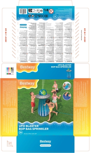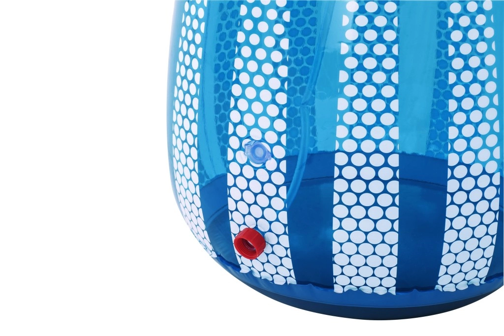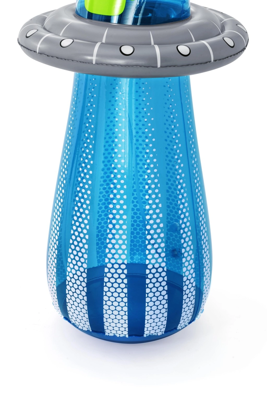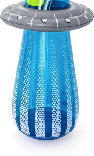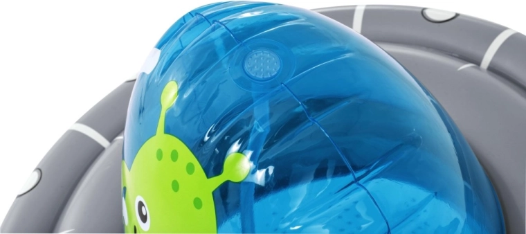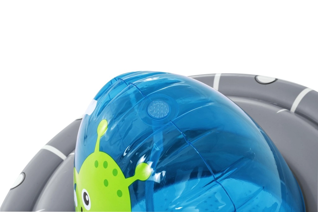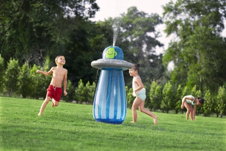 UFO-ul gonflabil cu un extraterestru prietenos aduce copiilor mișcare activă și răcorire cu apă într-un singur produs. După conectarea furtunului, din partea superioară pornește o fântână de apă, care transformă grădina într-un loc de joacă estival plin de voie bună. Datorită camerei de apă integrate în partea de jos, jucăria este stabilă și revine elastic după lovituri.