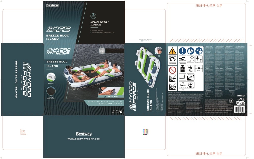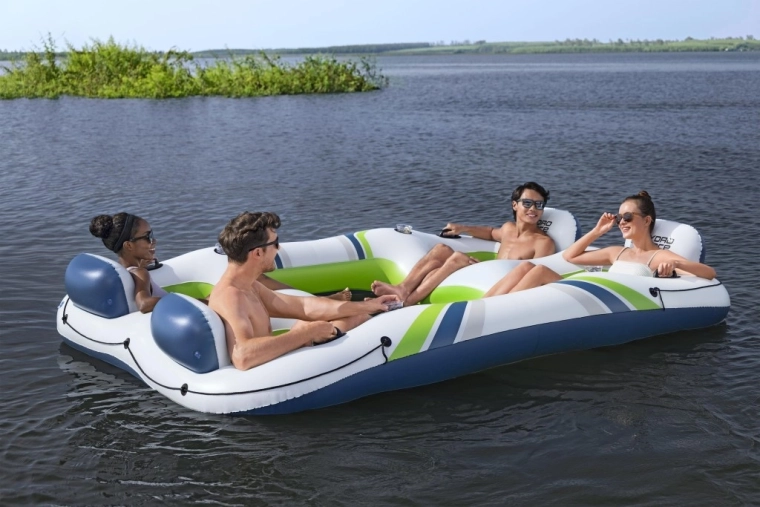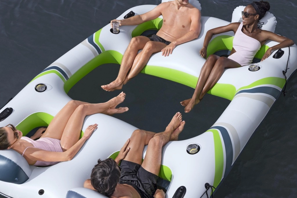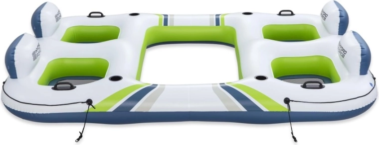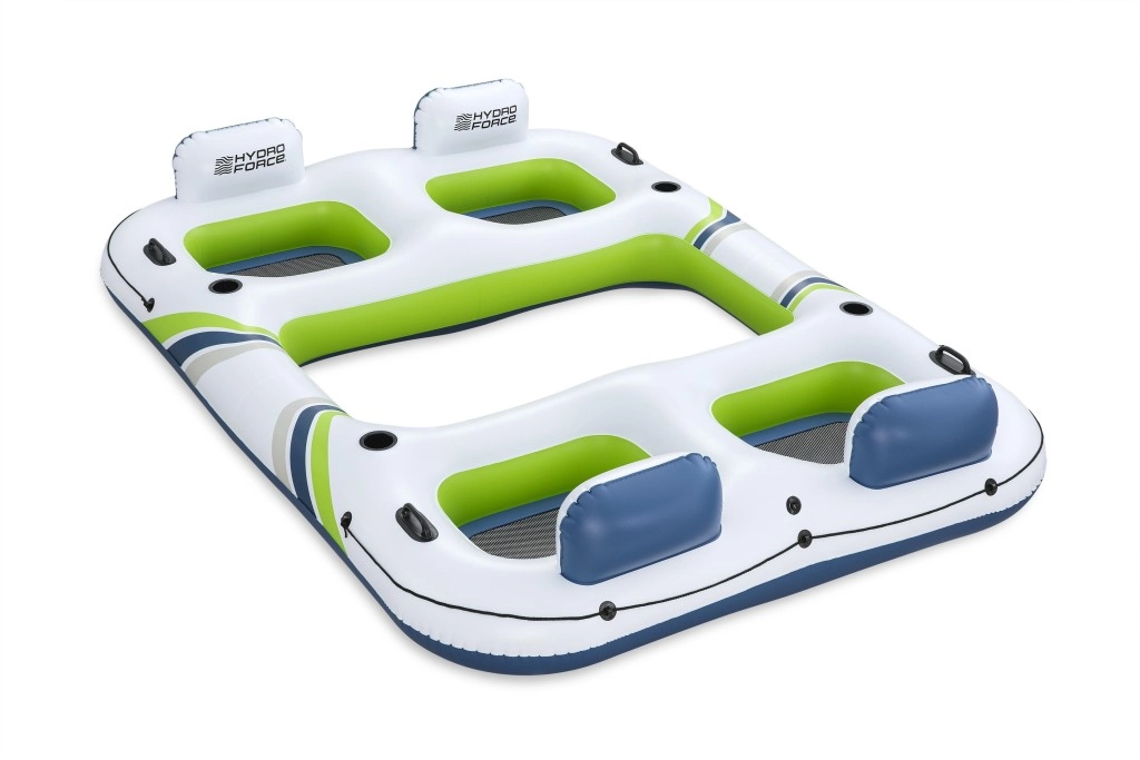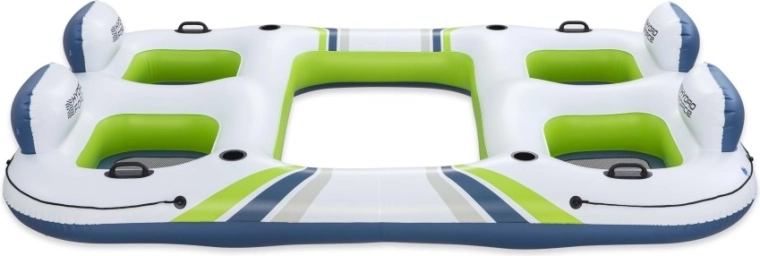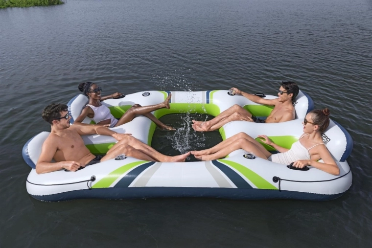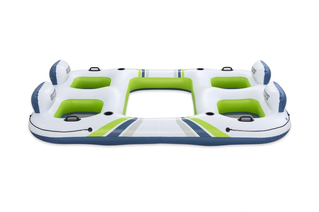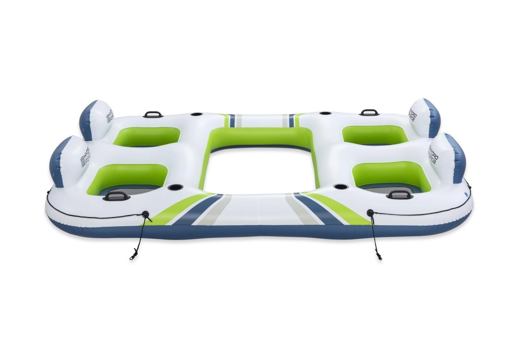 Bucurați-vă de relaxare desăvârșită pe apă cu insula spațioasă pentru patru persoane. Datorită materialului Inflata‑Shield™ oferă rezistență sporită la perforare, structură solidă și etanșeitate excelentă. Patru spătare căptușite, șezuturi din plasă pentru răcorirea picioarelor, suporturi pentru băuturi și mânere practice asigură confort și siguranță. Sistemul Clasp ’N Go™ permite interconectarea ușoară cu alte plutitoare. Capacitate de încărcare până la 400 kg.