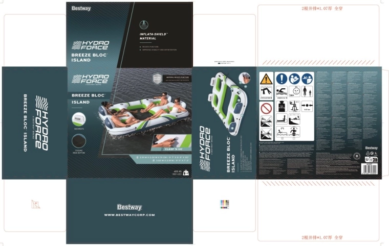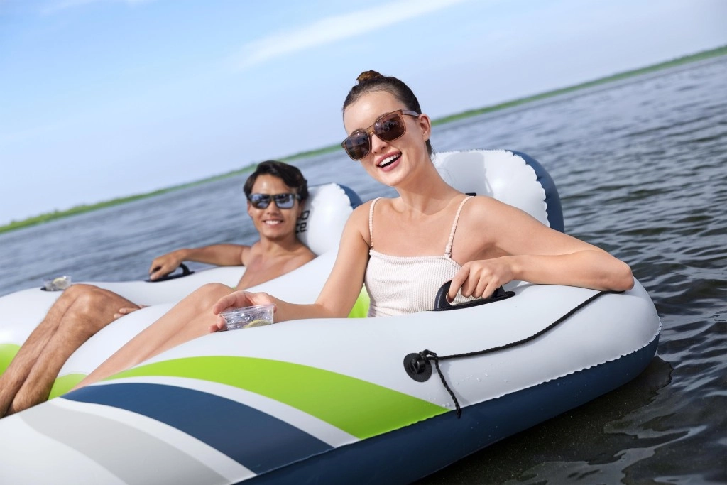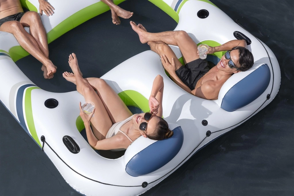 Suprafața durabilă Inflata‑Shield™ minimizează riscul de rupere și crește rigiditatea întregii structuri. Valvele cu eliberare rapidă grăbesc umflarea și dezumflarea, iar cele patru suporturi integrate pentru băuturi păstrează mereu la îndemână răcoritoarele. Două conectoruri Clasp ’N Go™ permit cuplarea insulei cu alte plutitoare pentru a crea o zonă mai mare de relaxare pe apă.